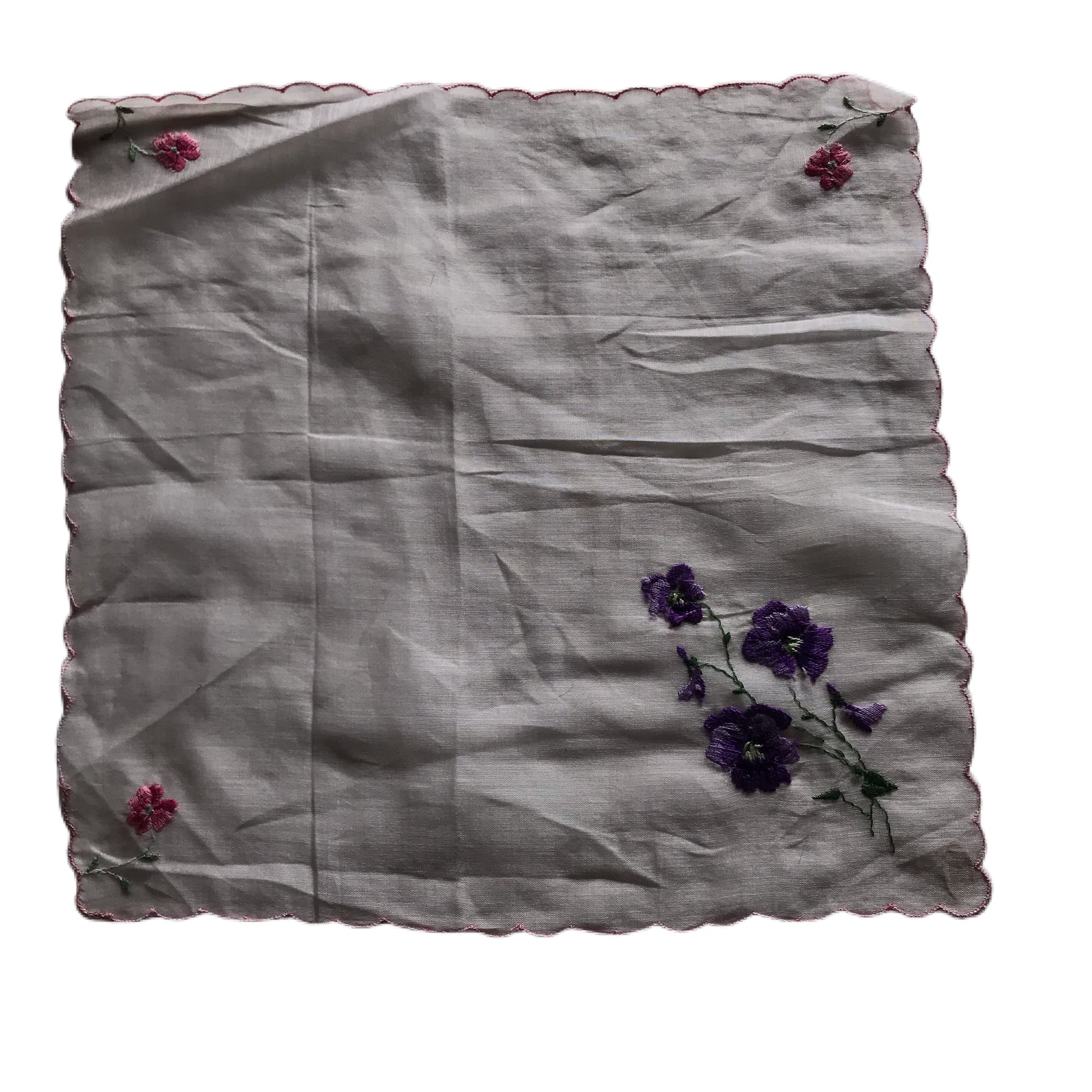 Pink Scalloped Edge Embroidered Pansy Handkerchief circa 1940s
