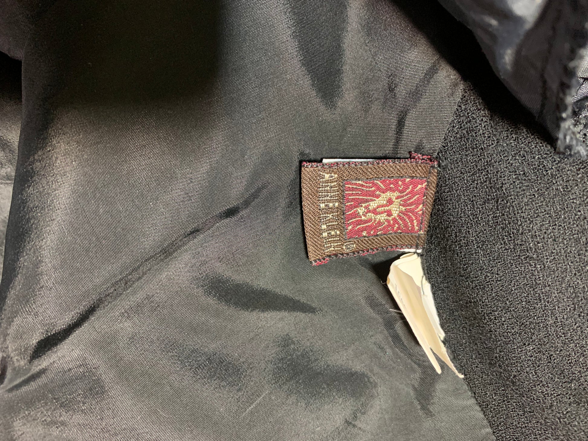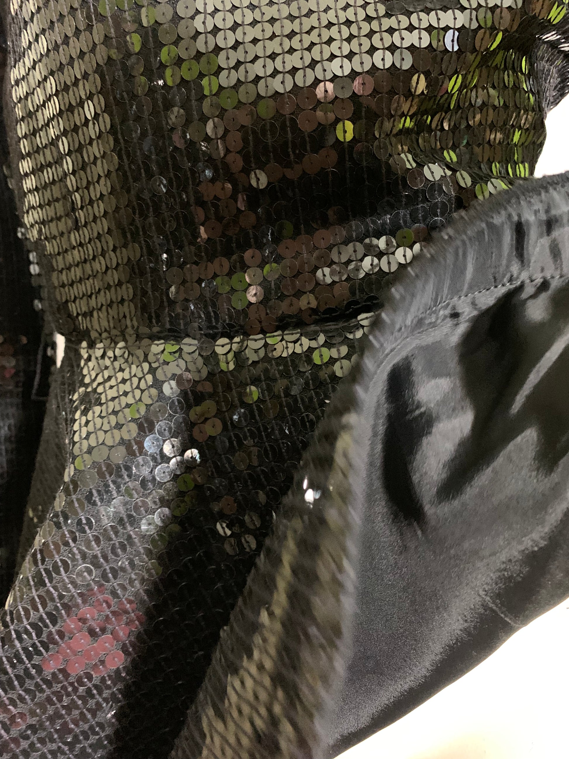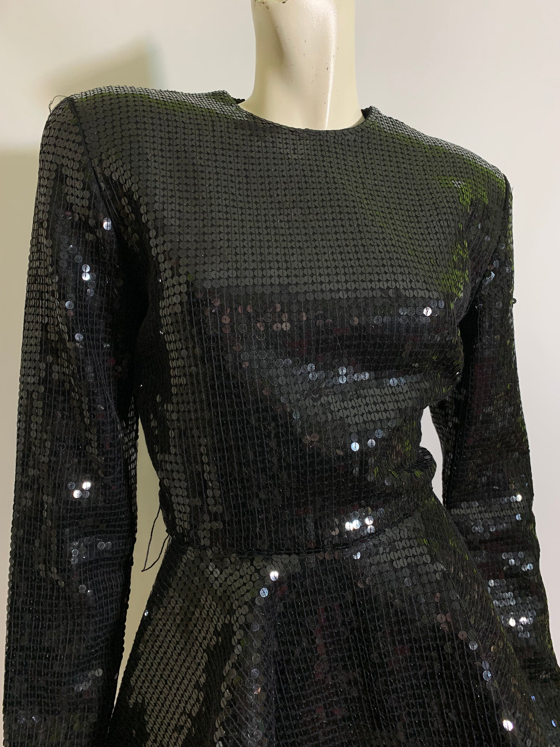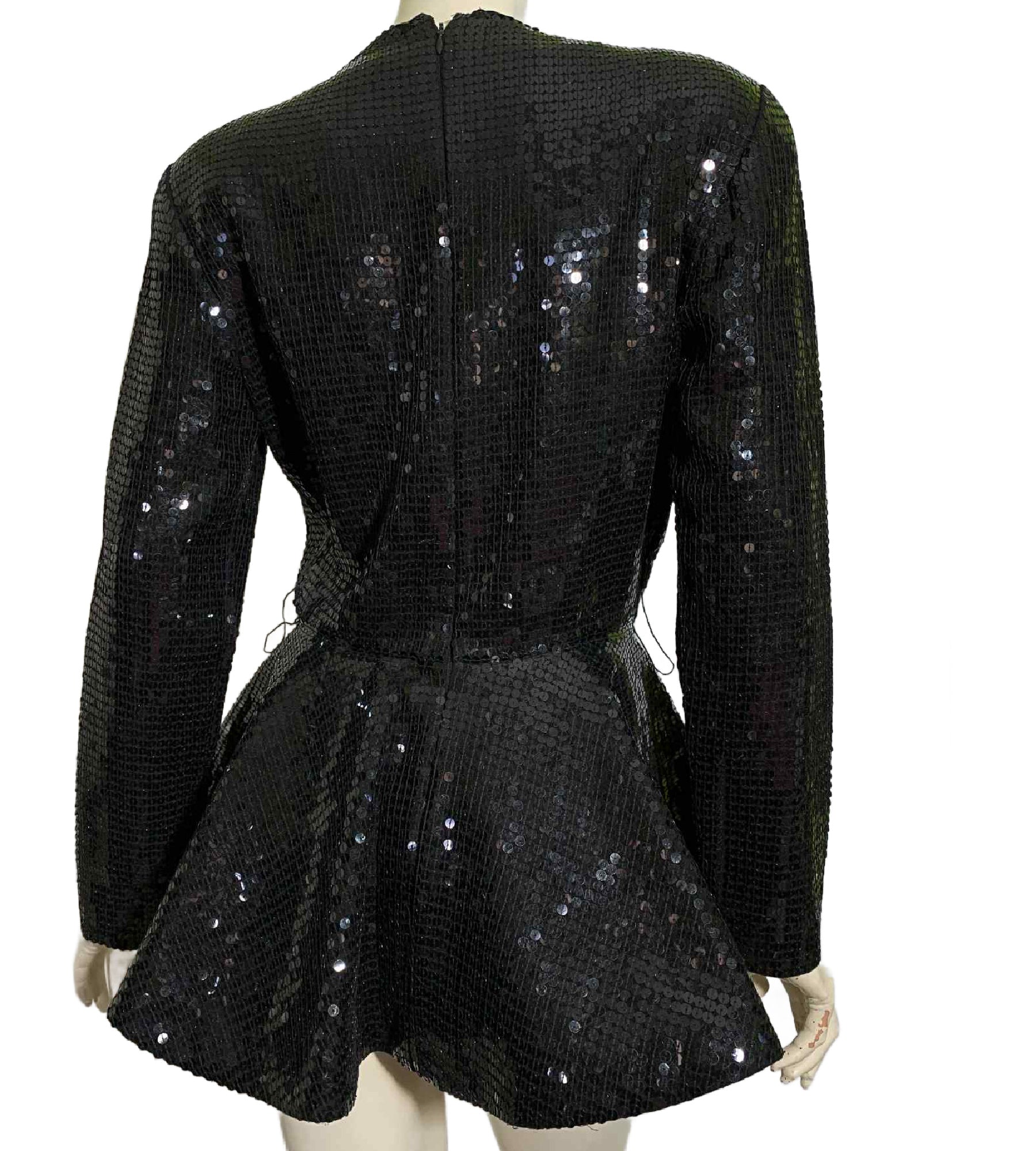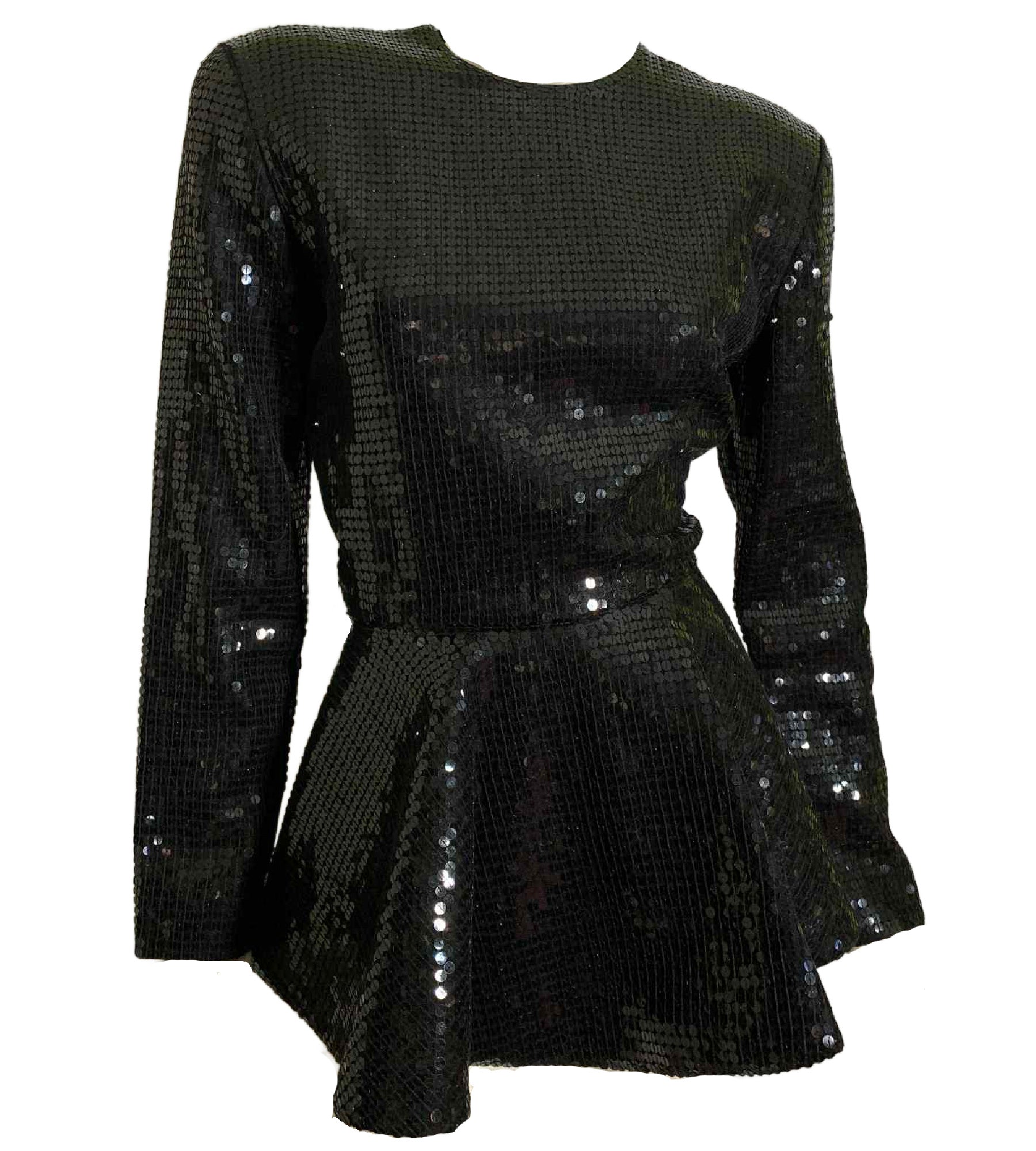 Anne Klein AMAZING space age 40s inspired black sequined top with sculpted peplum from the late 80s to early 90s. Fully lined, horsehair braid inside ribbon inner hem to hold shape. Back zipper, has wide belt loops- imagine all the belts that would be smashing with this! No flaws, tagged size 6. Check other listings for some black sequined pants with tuxedo inspired stripe down the side in size 12.Â