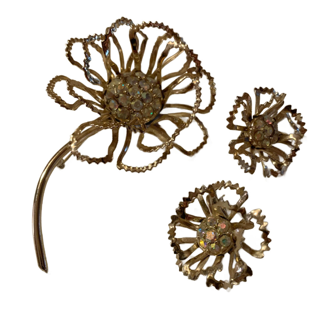Aurora Borealis Rhinestone Flower Shaped Statement Brooch & Earrings Demi Parure Set circa 1960s