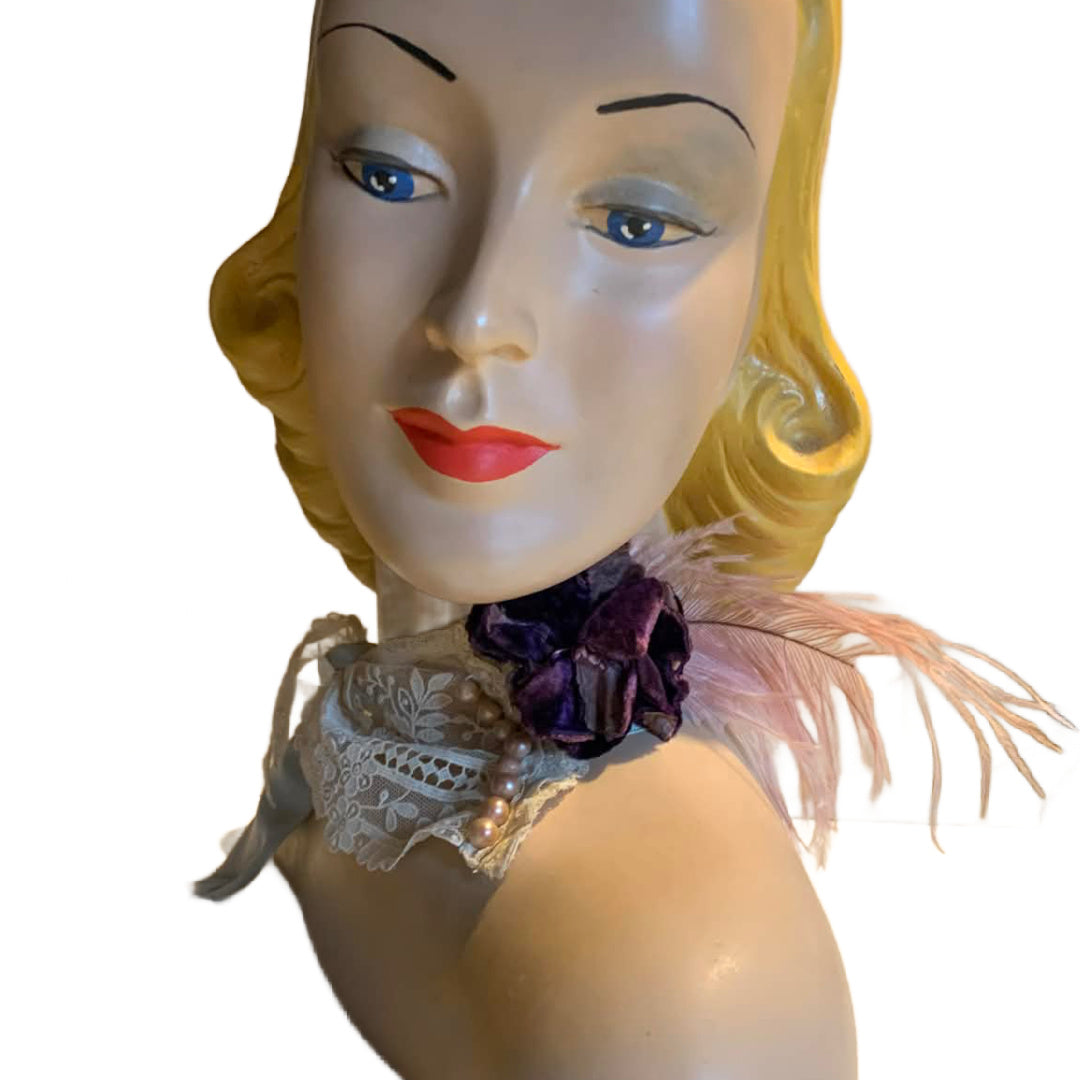 Miss Lala Antique Lace and Ribbon Neckpiece with Velvet Flower and Feather