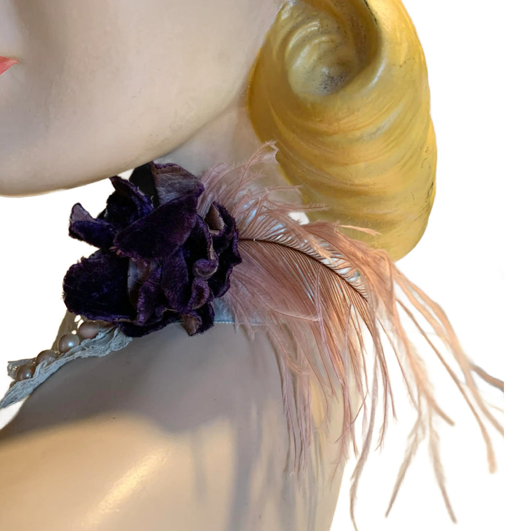 Created with palest blue vintage silk ribbon, half of an antique lace collar with wee faux pearl buttons. I've added a 1930s purple velvet flower and soft pink ostrich feather. This can be worn on neck or on wrist- just ties to close. Hooks and eyes could be added but I left it this way to be more versatile.