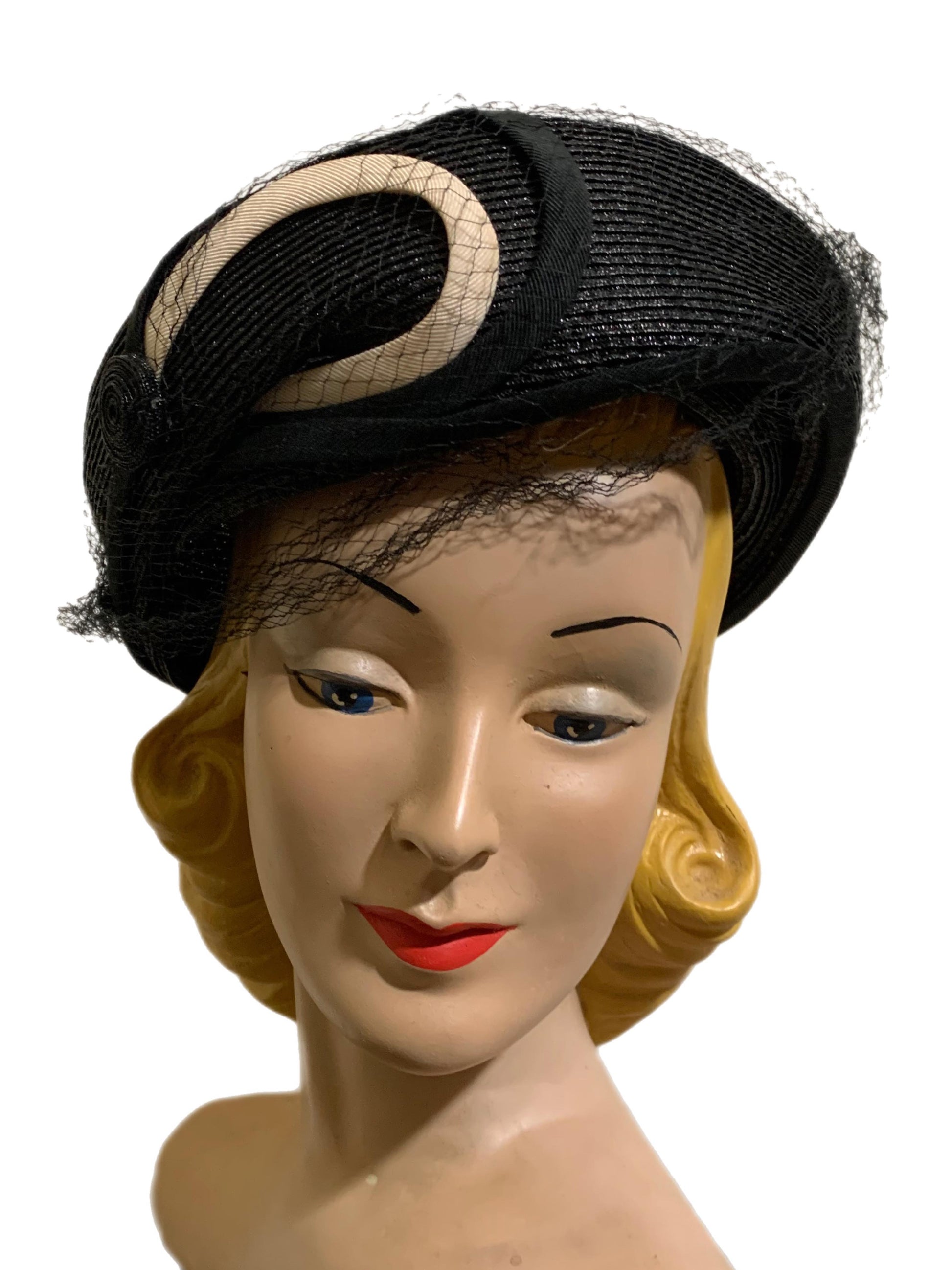 Black and ivory sisal hat with swirled front detail, rounded sides. Veiling has a little damage. No label. Size 22 1/2.