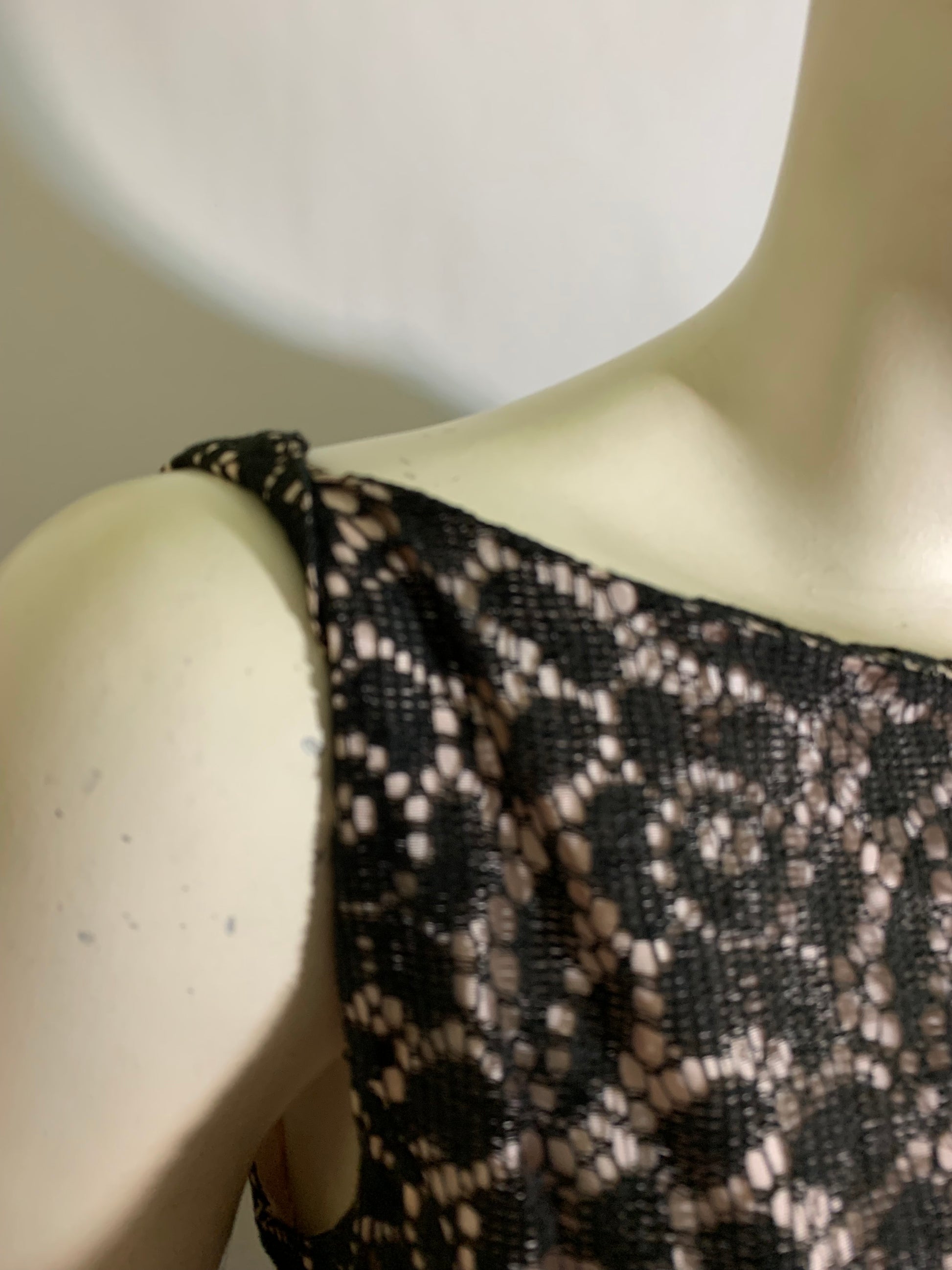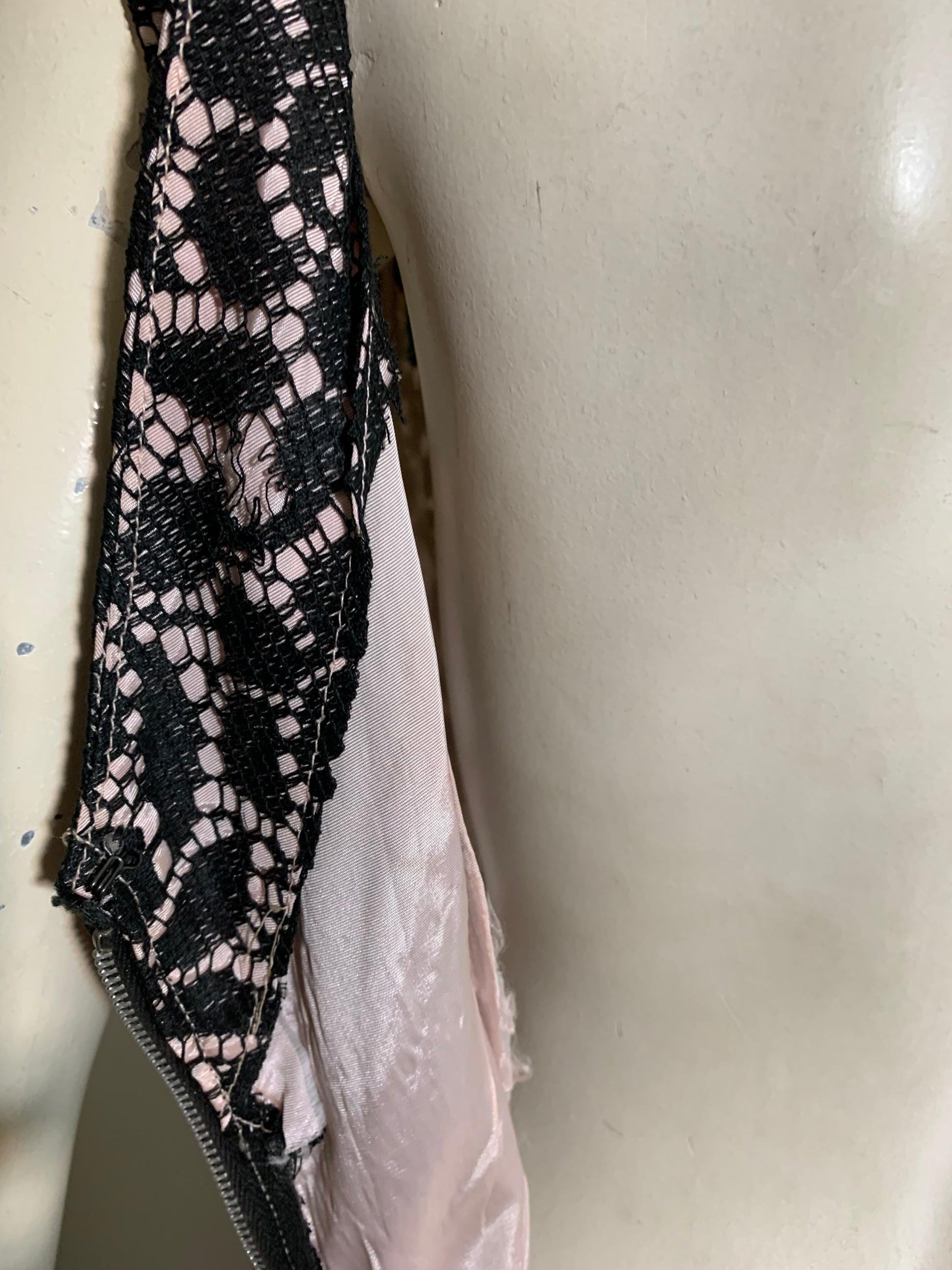 Stylish black lace party dress with palest pink acetate lining, full skirt with pleats at front hips, princess seamed. Back metal zipper. No flaws, no label.