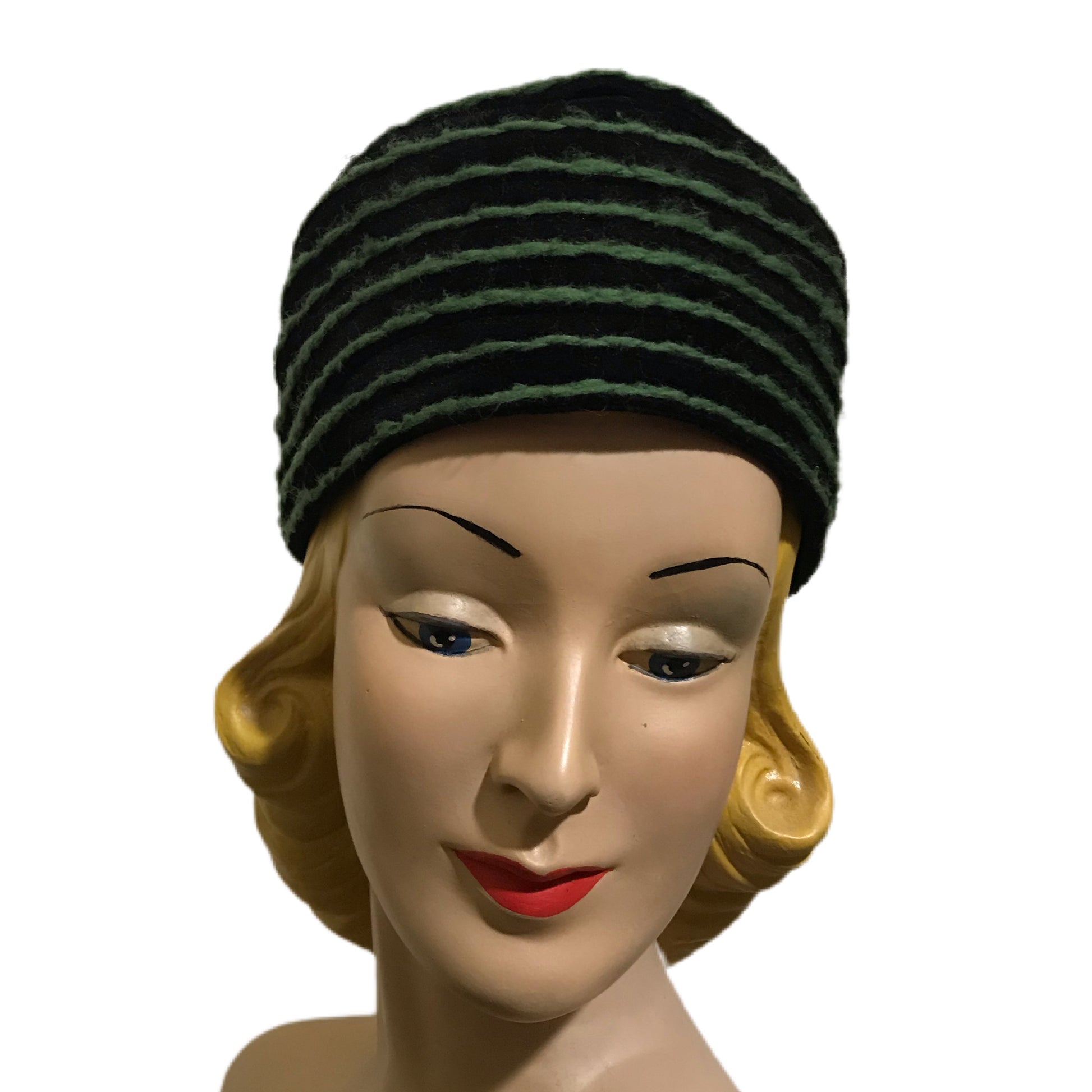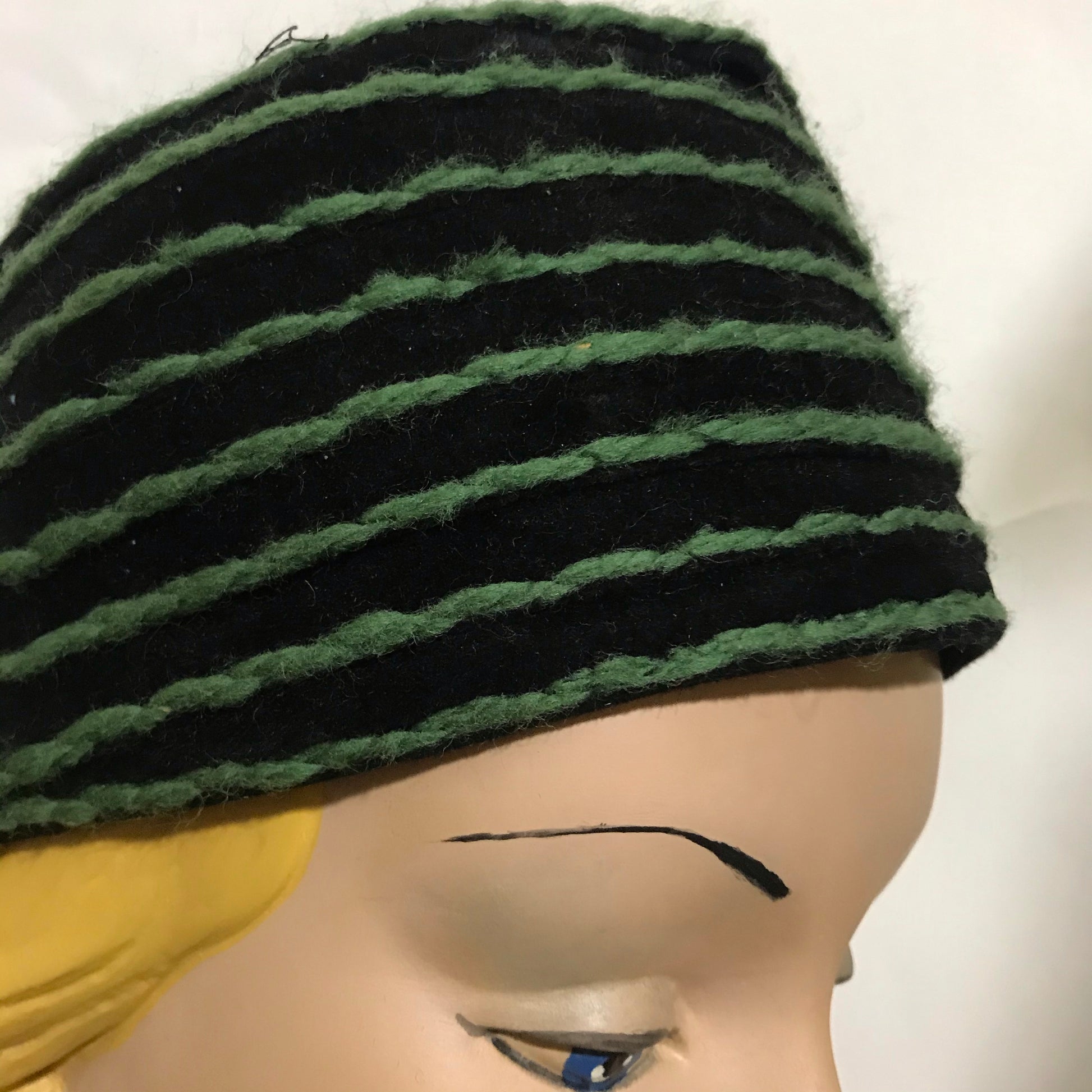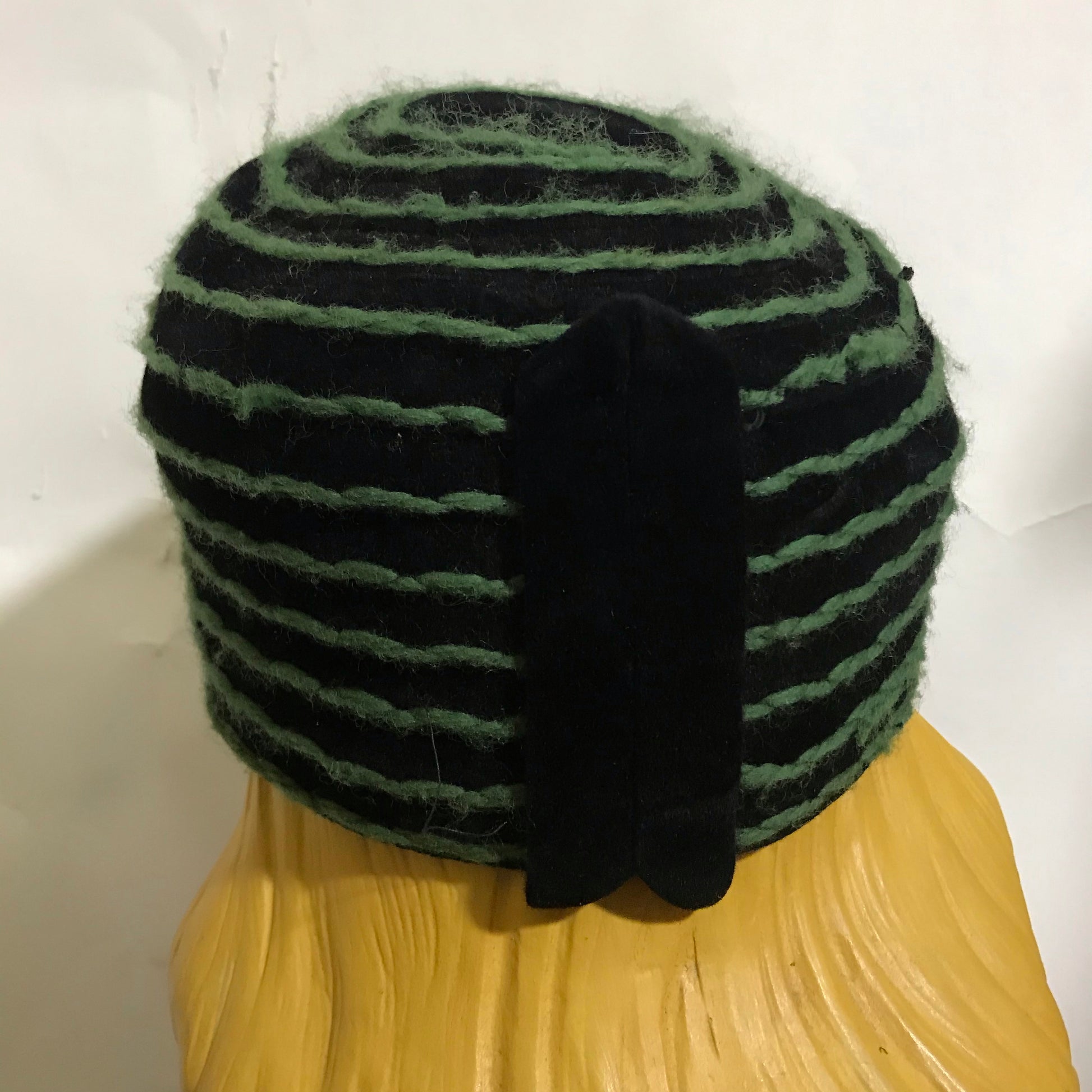 Black Felted Wool Fez Style Hat Green Yarn Top Stitch Detail circa 1960s