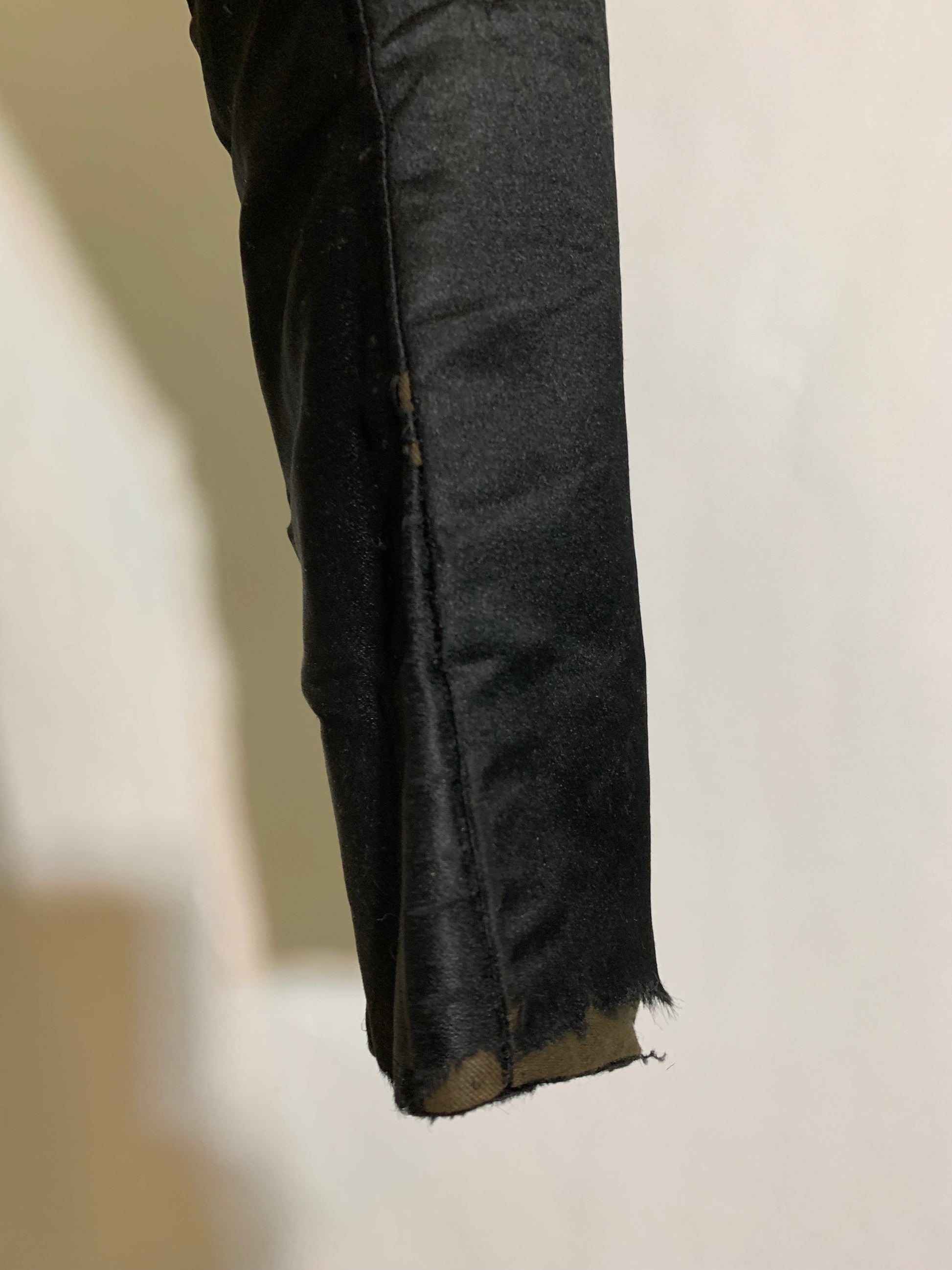 Black silk Victorian era bodice with puff shoulders, hook and eye closure down front and inside. Boned. Tears on left shoulder as shown- sold as is.