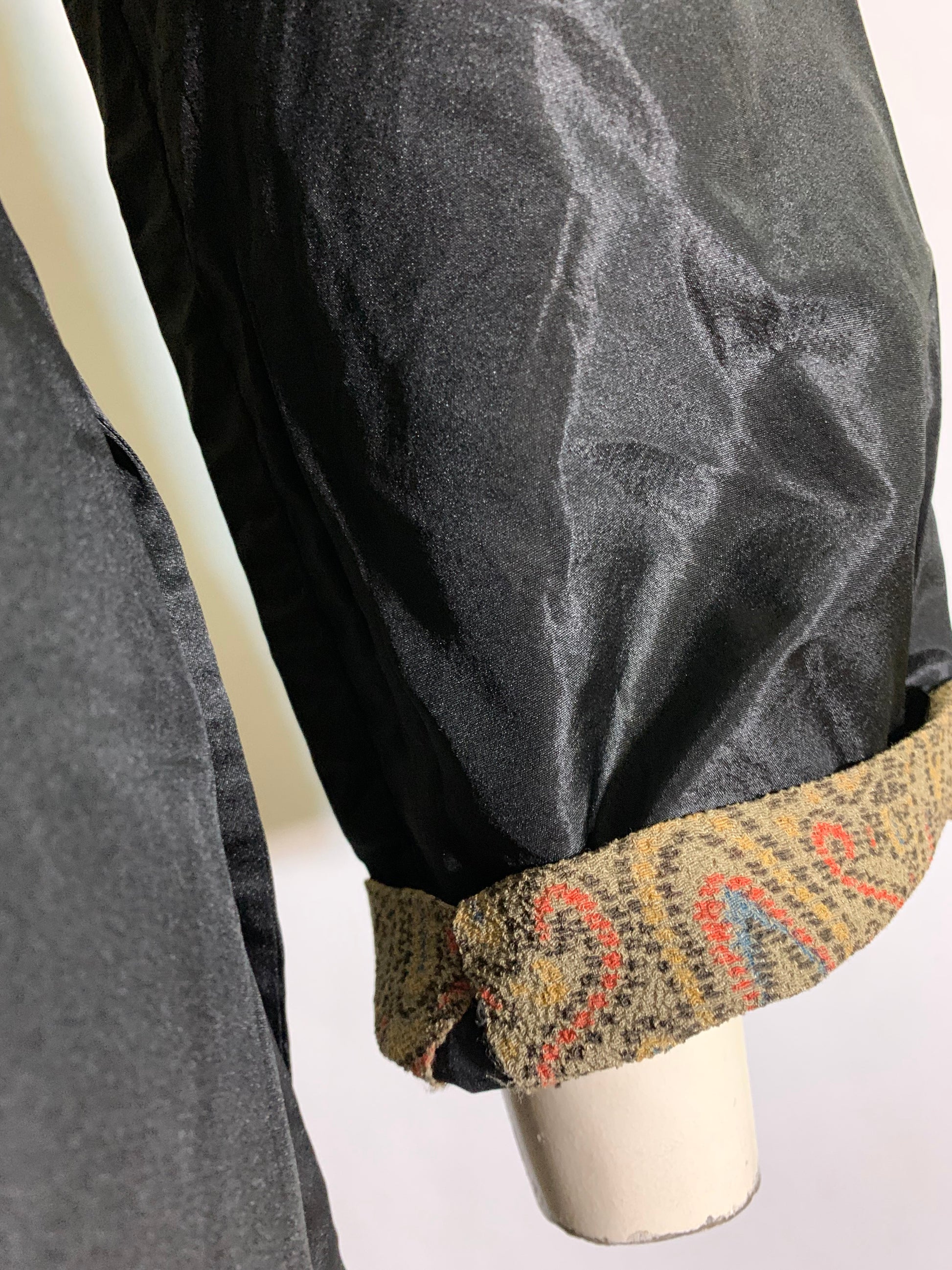 1910s black weighted silk dress with arts and crafts accents- fabric inset in bodice center and sleeve cuffs. Hooks and eyes and waist and left side of bodice, waist sash that ties on left side. Some stress tears on top of right shoulder, a little on sleeve cuffs. Hand made.