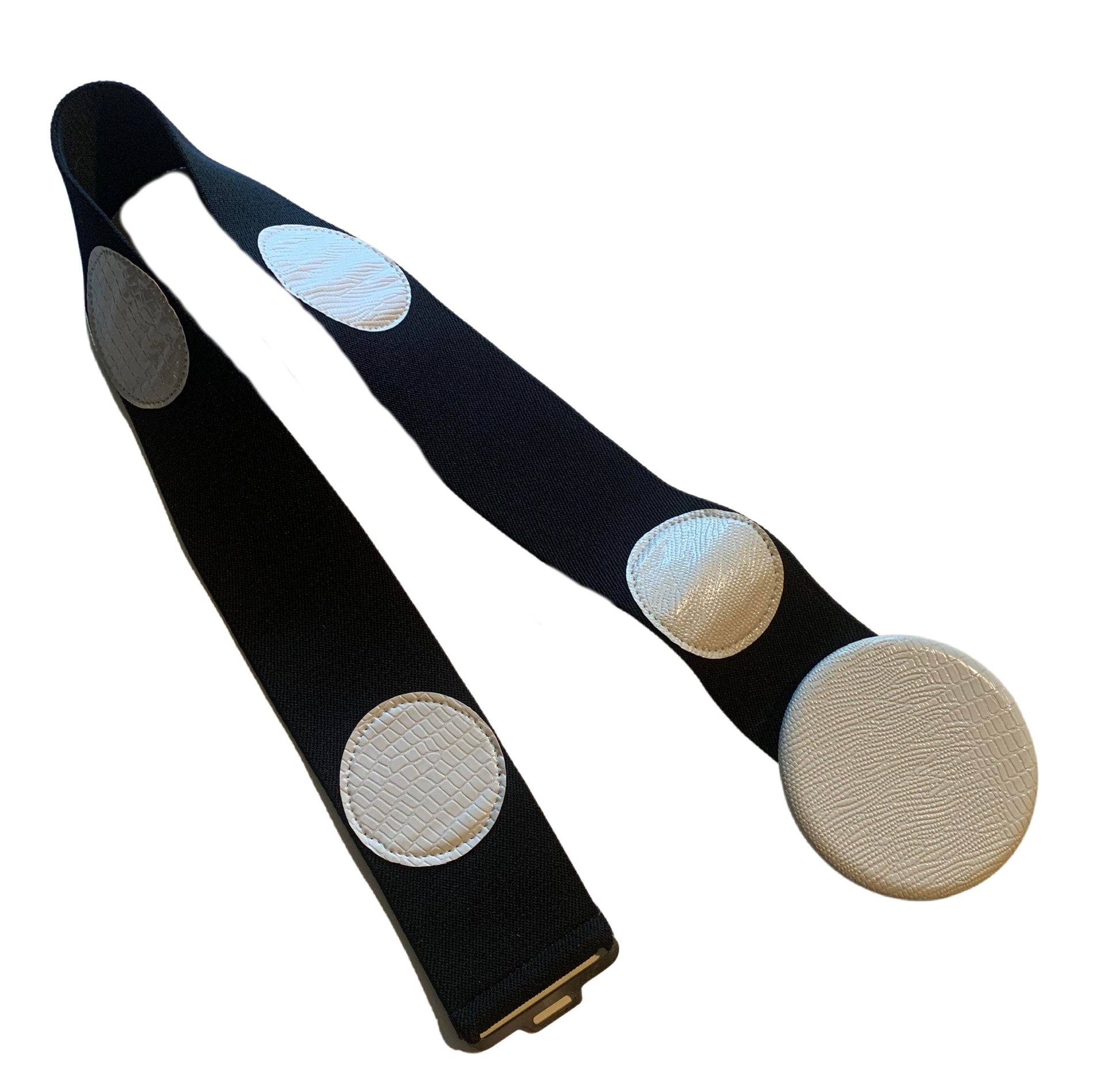 1980s black elastic wide belt with white vinyl polka dots and white circle clasp. 26-32" around, 2" wide