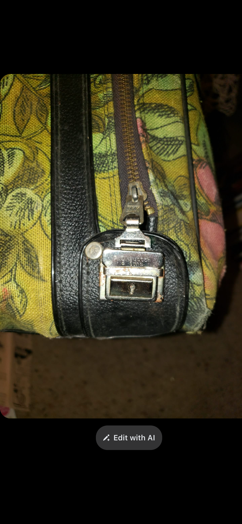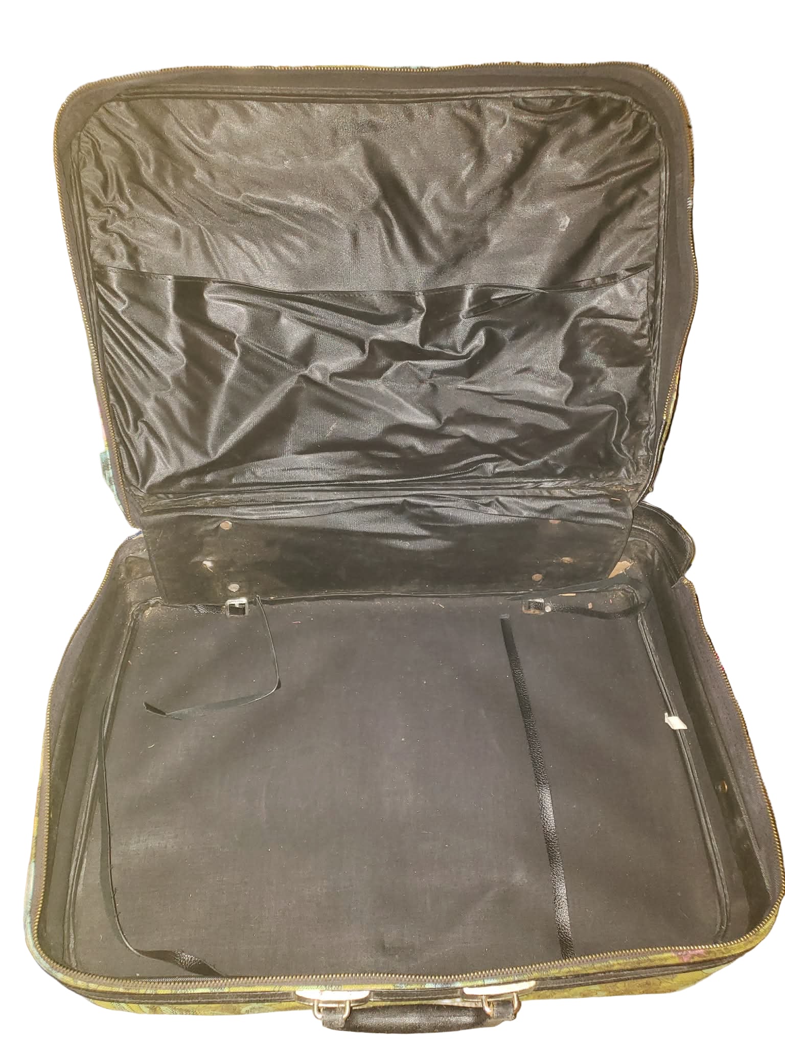 1970s Bantam Travelware fabric covered suitcase in avocado green with blue roses and pink flowers. Minor wear to interior. 18” by 13” by 6”.