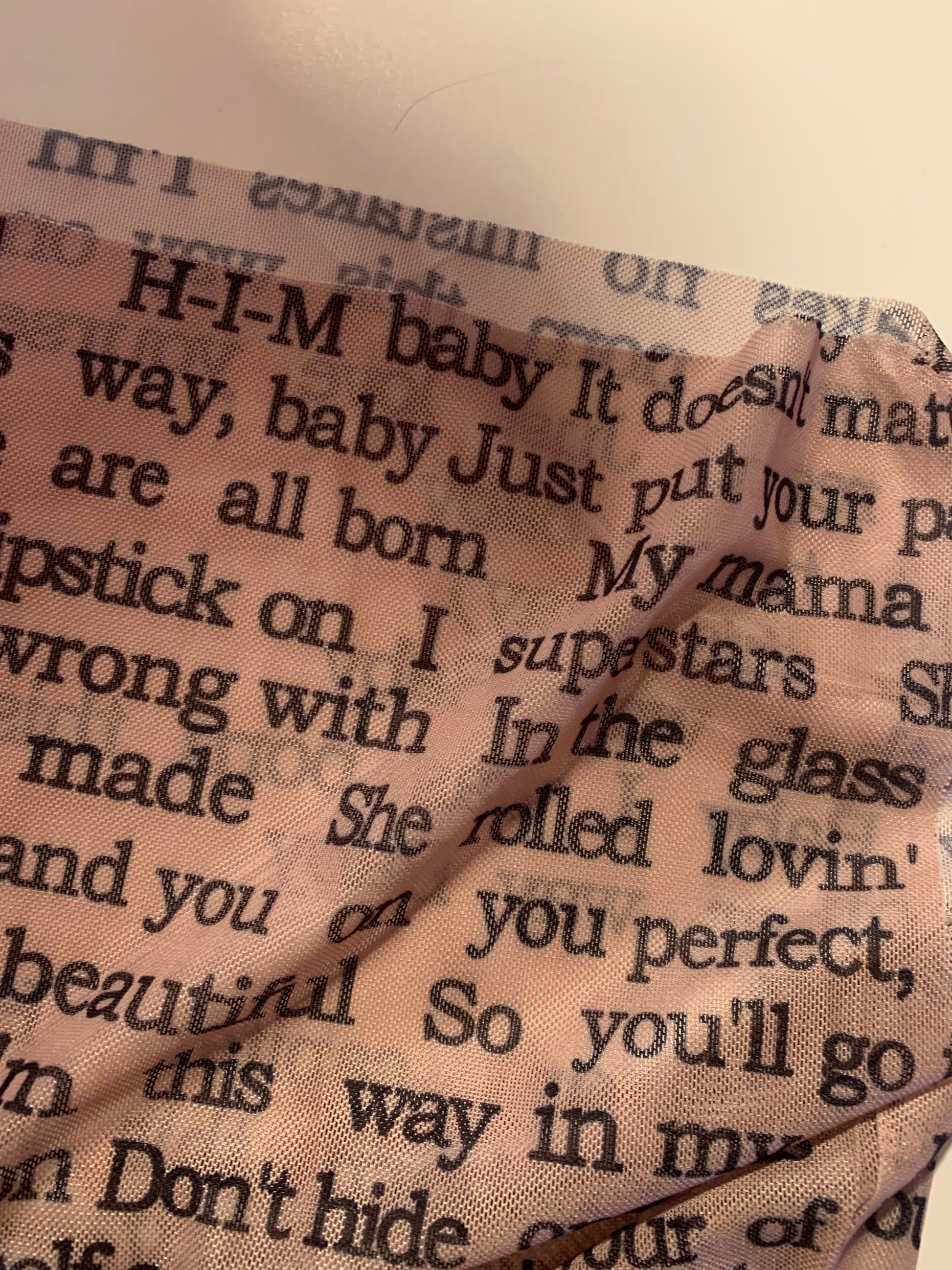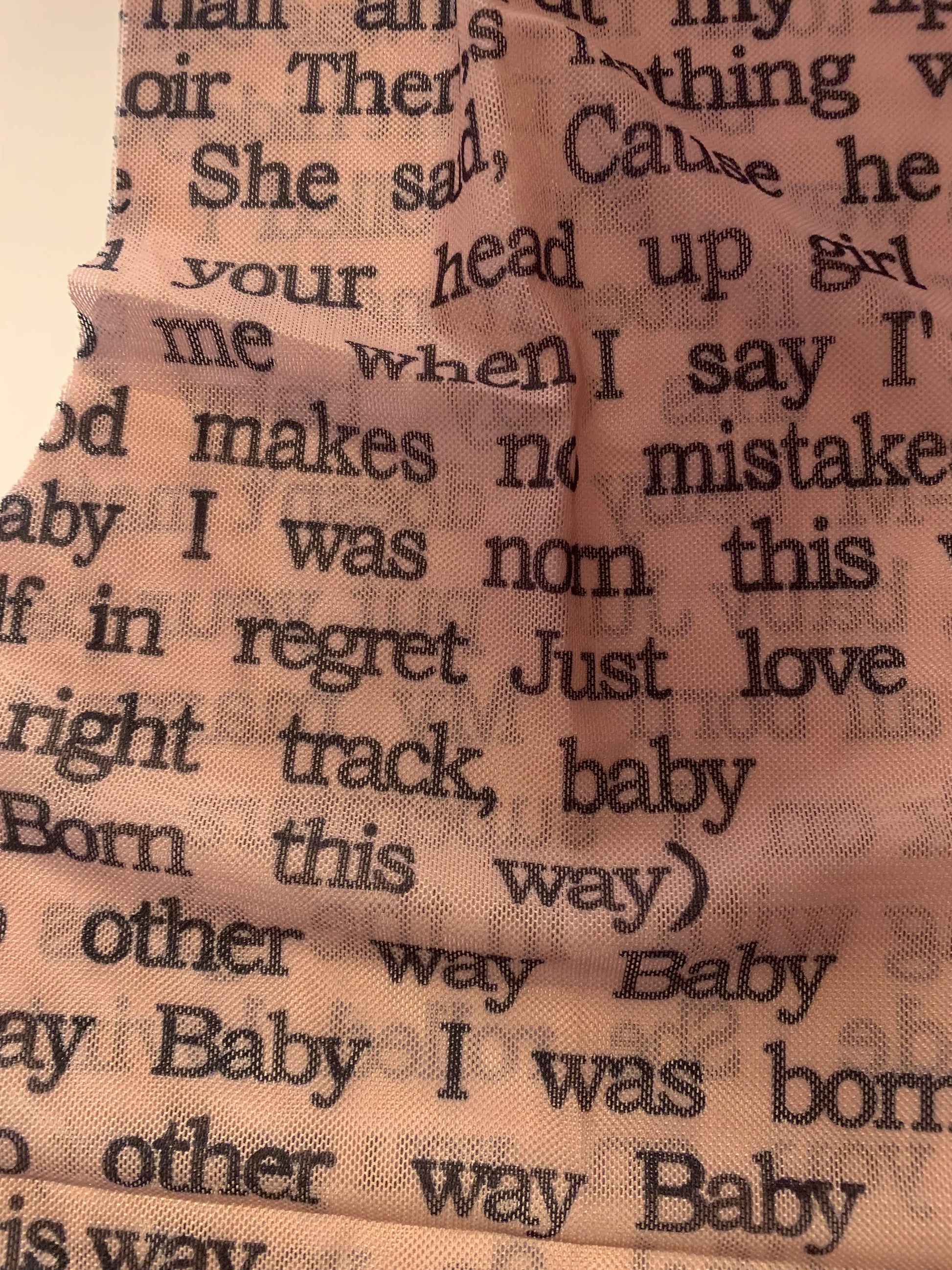Sleeveless sheer stretch poly nylon shirt with Born This Way lyrics. MODERN, arrives in 2-3 weeks. 3 color ways. Red available, message me if you'd like that one.