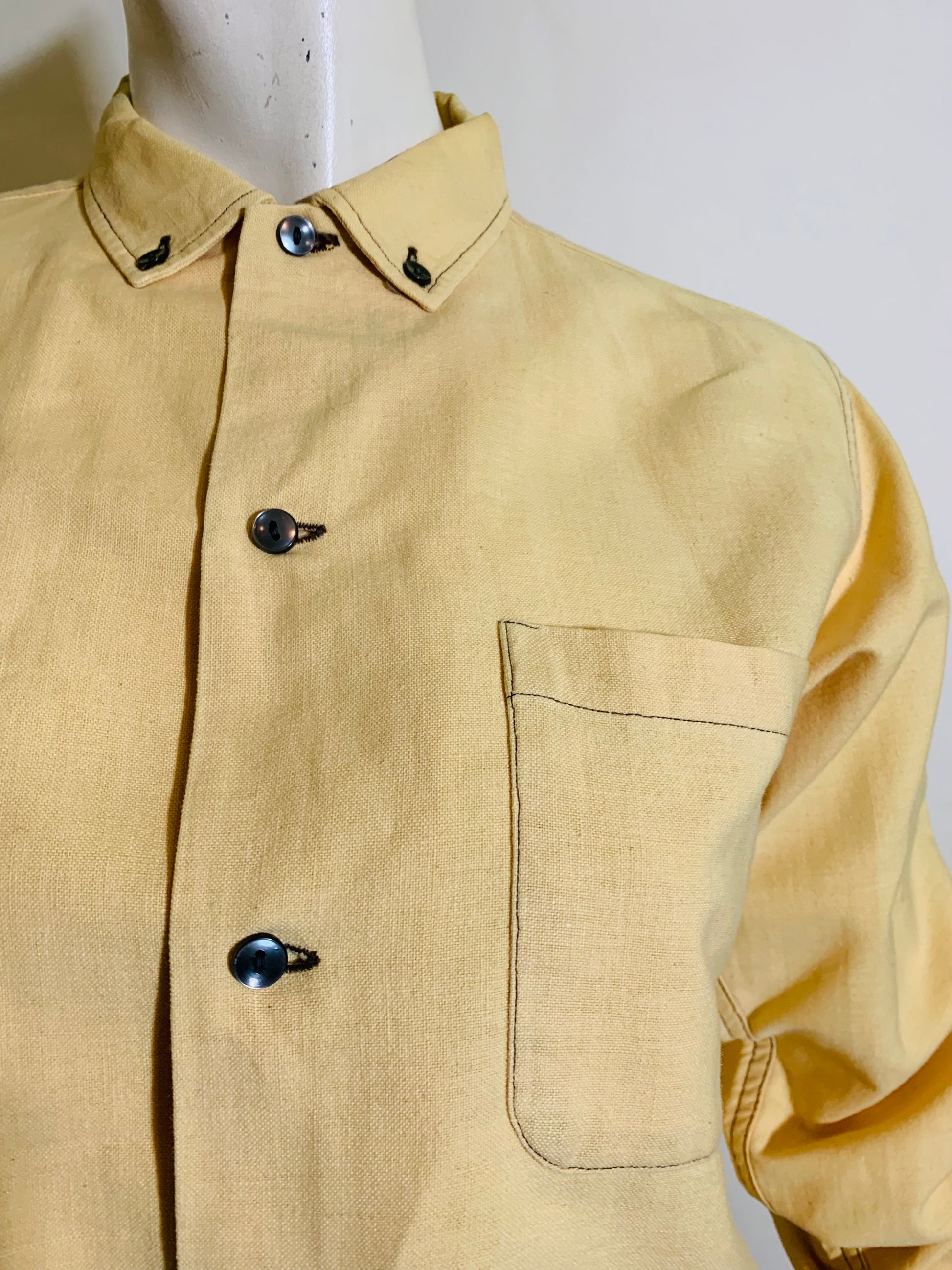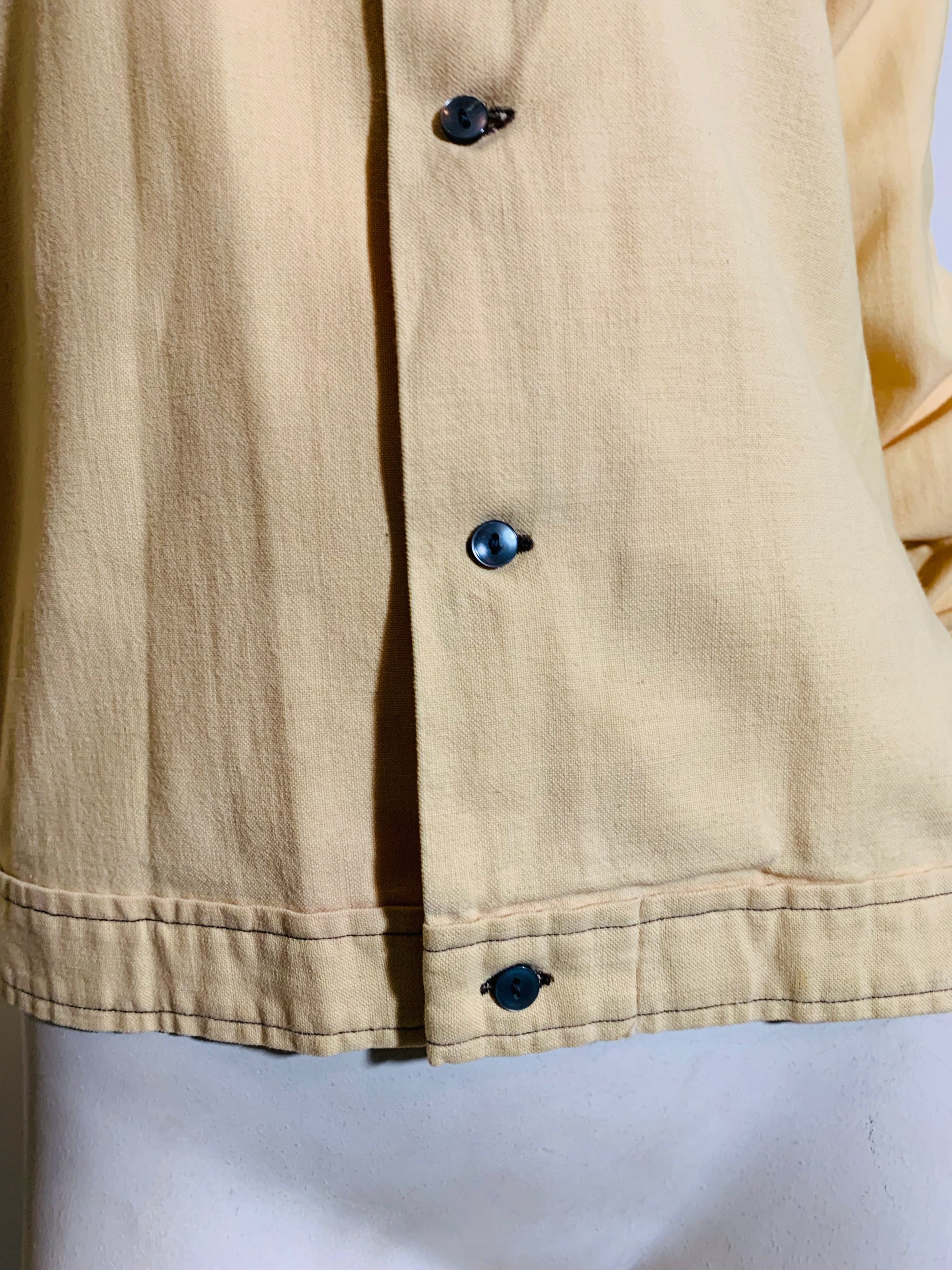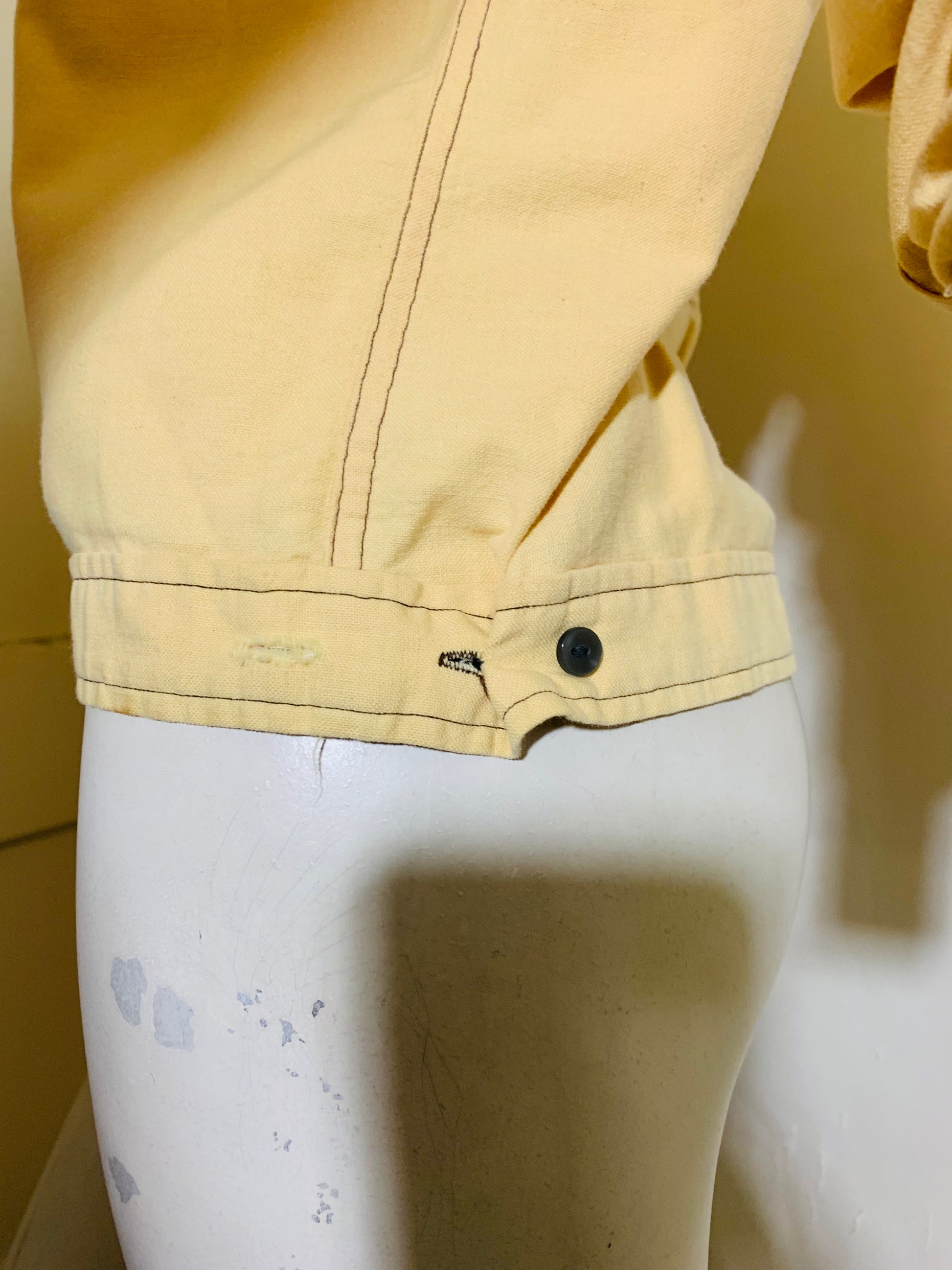 1960s butter yellow canvas cotton button front shirt-jac. Button down collar, cuffs and sides of waist. Extra buttonholes added at sides.
