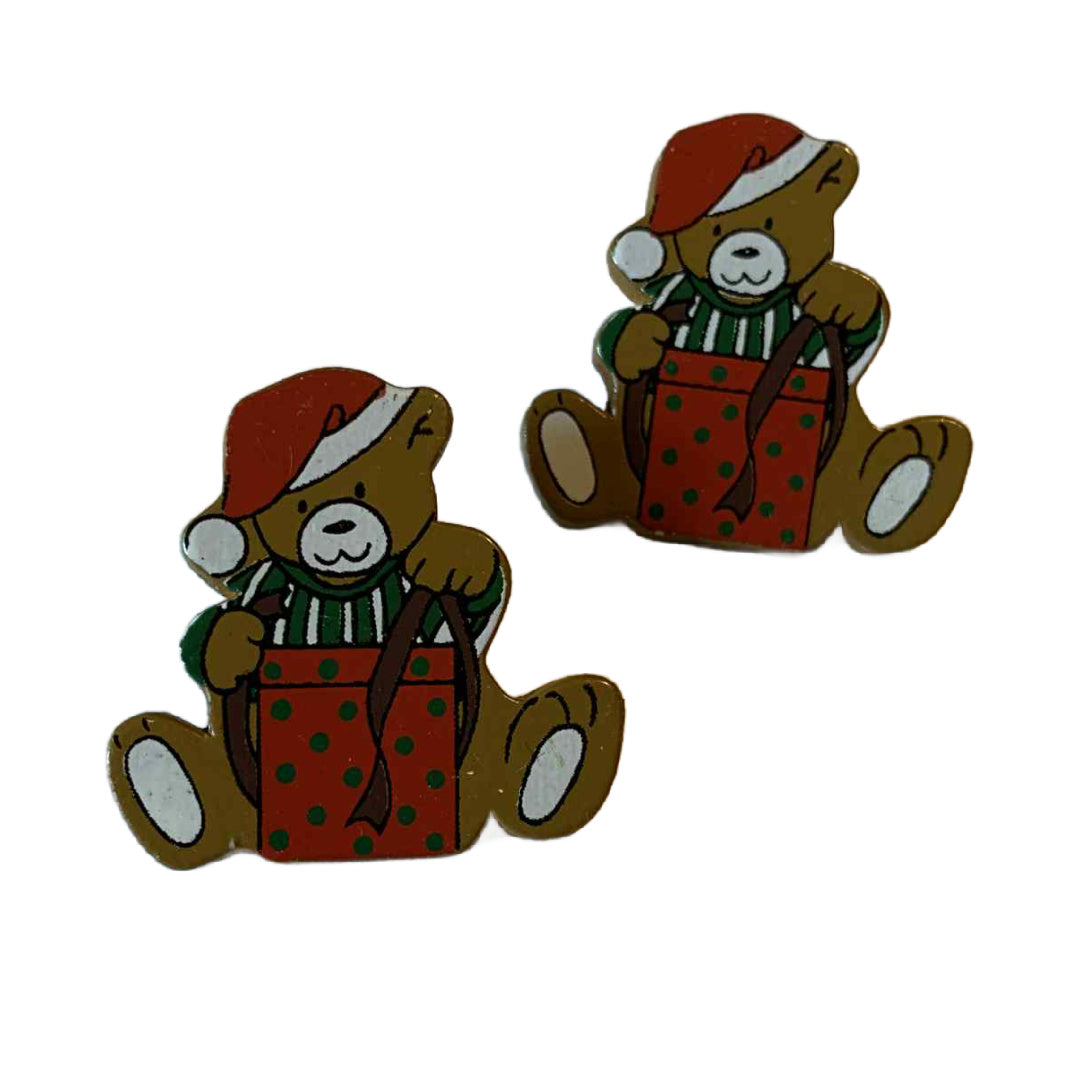 Charming Painted Wood Christmas Teddy Bear Pierced Earrings circa 1980s