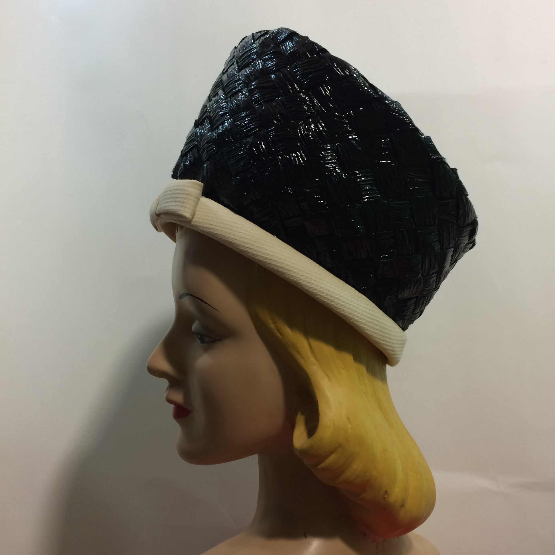 Chic Glossy Black Braided Cello Tall Front Hat w/ White Trim circa 1960s