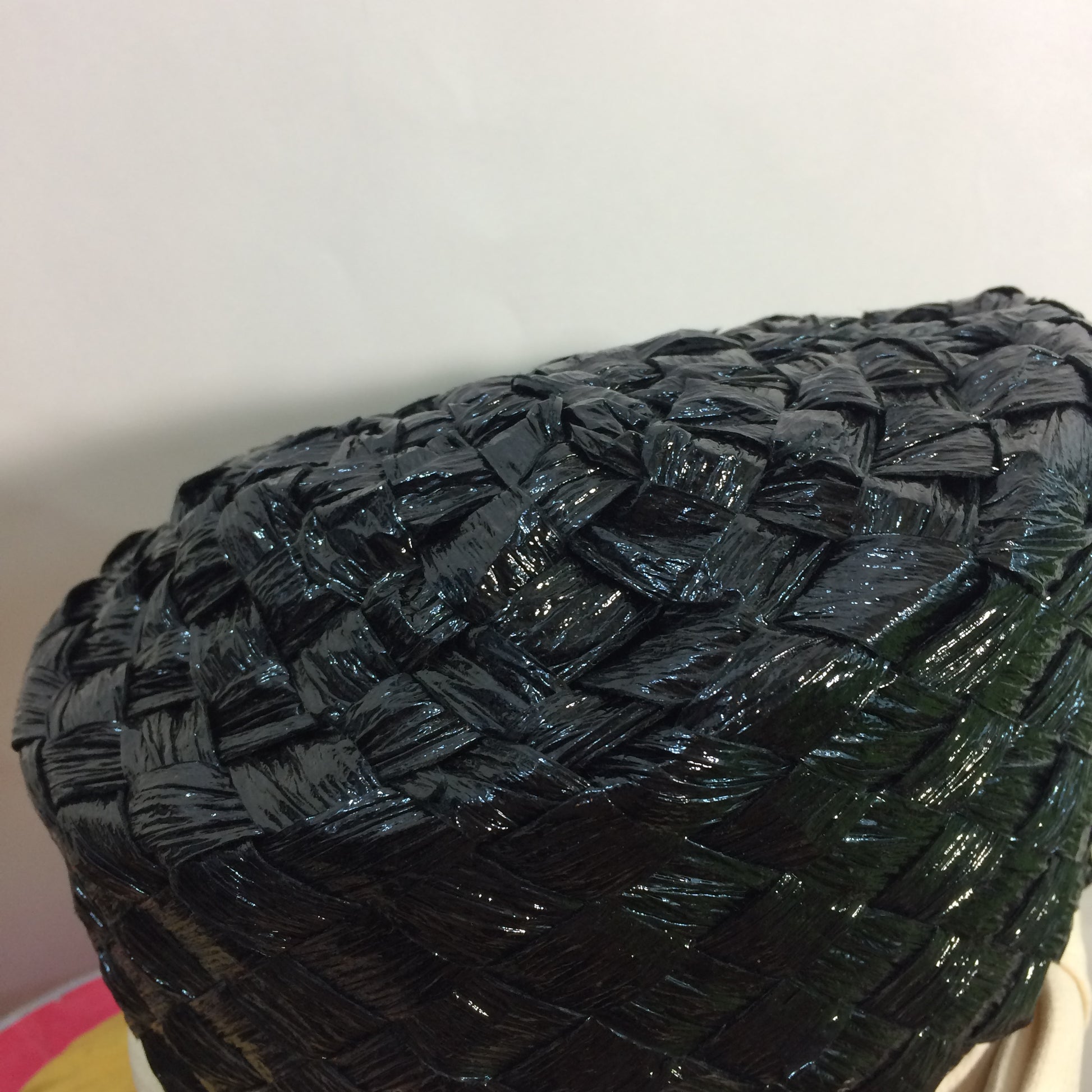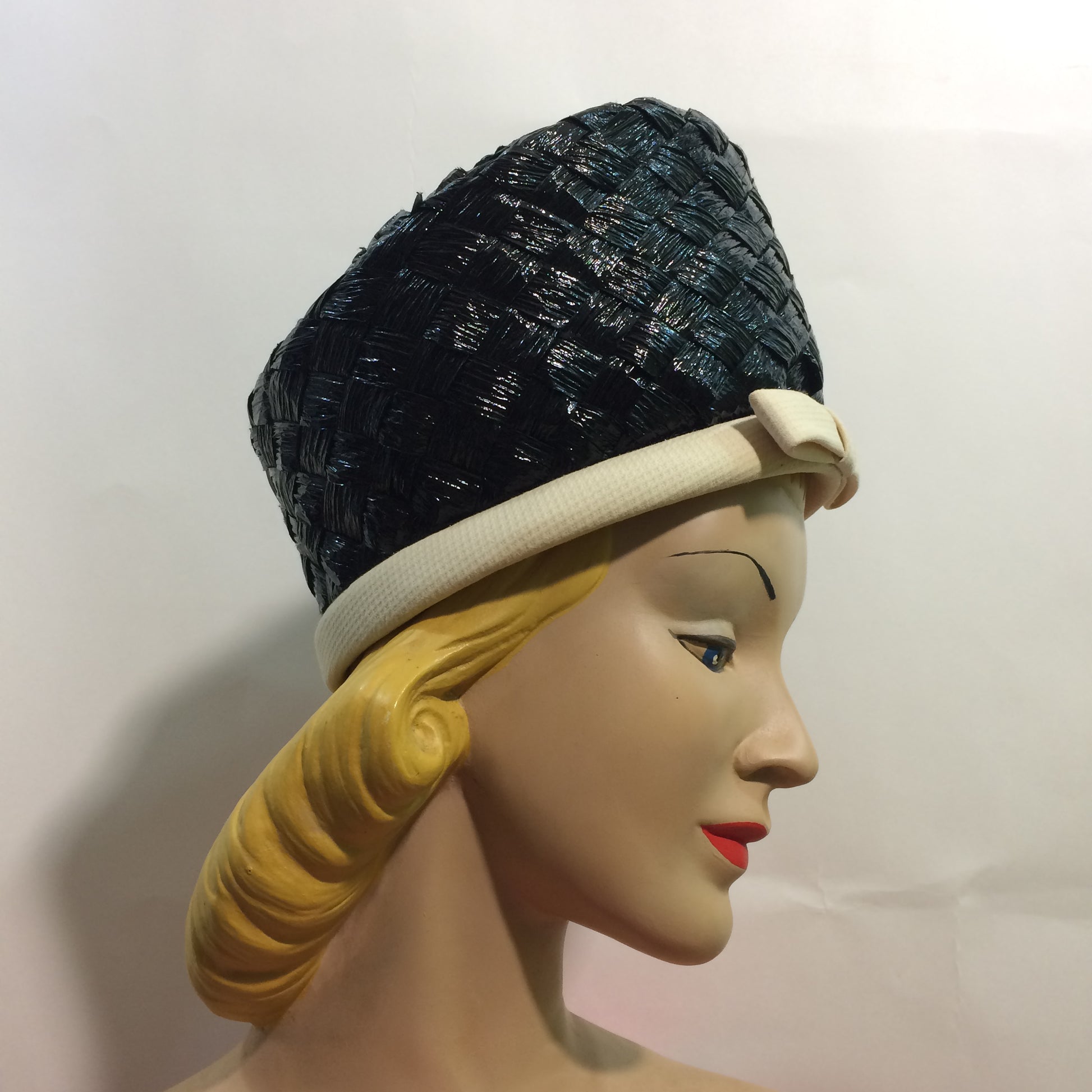 1960s tall front round glossy black braided cello hat with white pique cotton trim and front bow. By Noreen, no flaws, size 22.