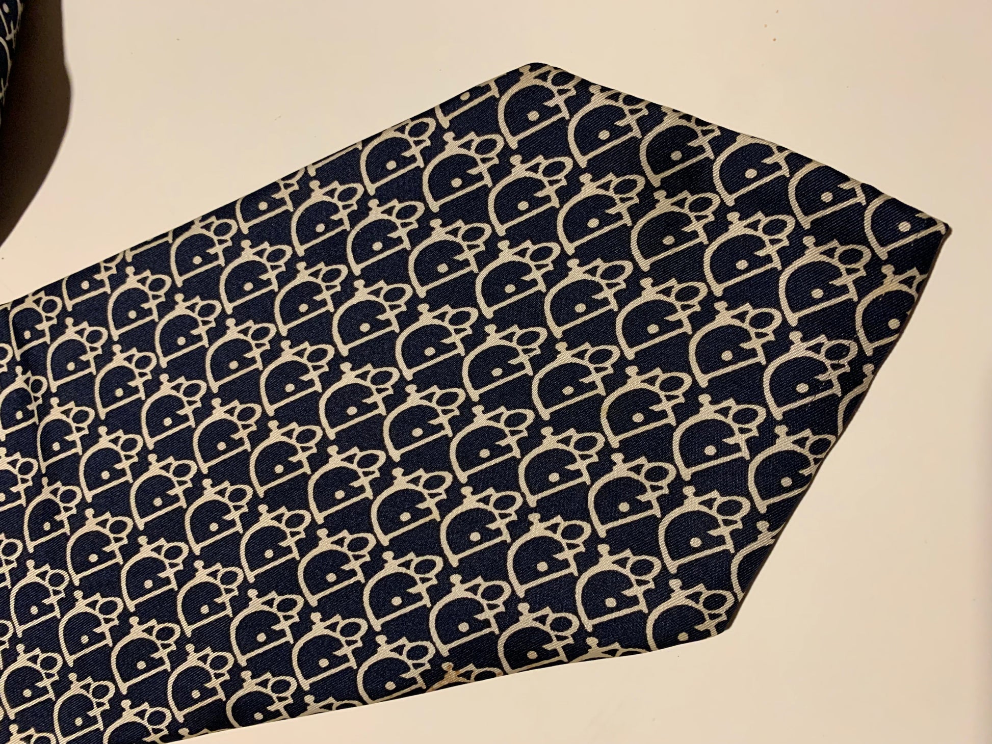 Christian Dior Logo Design Blue and White Silk Men's Tie circa 1990s