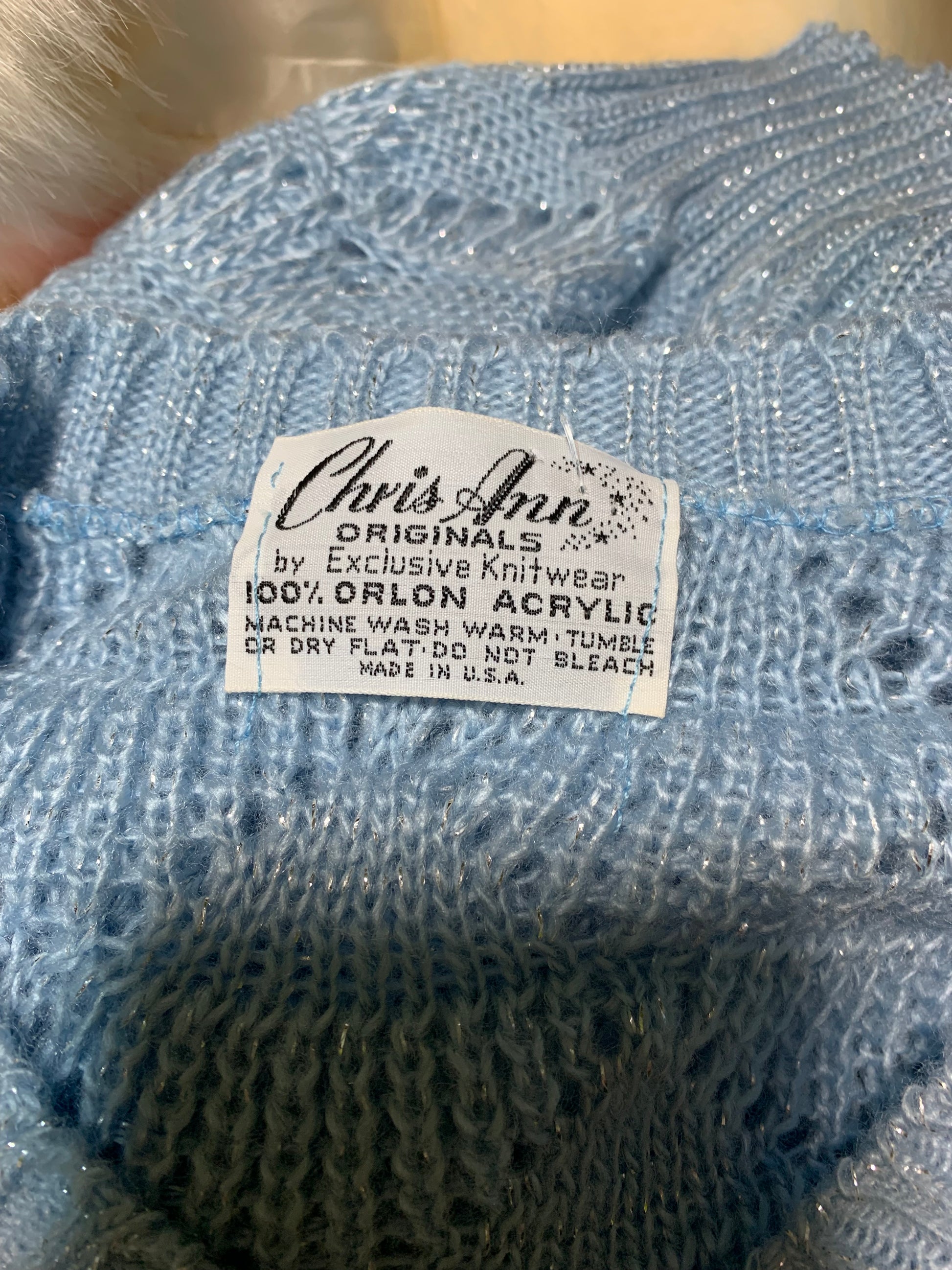 Sky blue orlon open knit V neck sweater with shimmering silver metallic threads! Iconic 70s- pair with high waist bell bottom jeans and boots. No flaws.