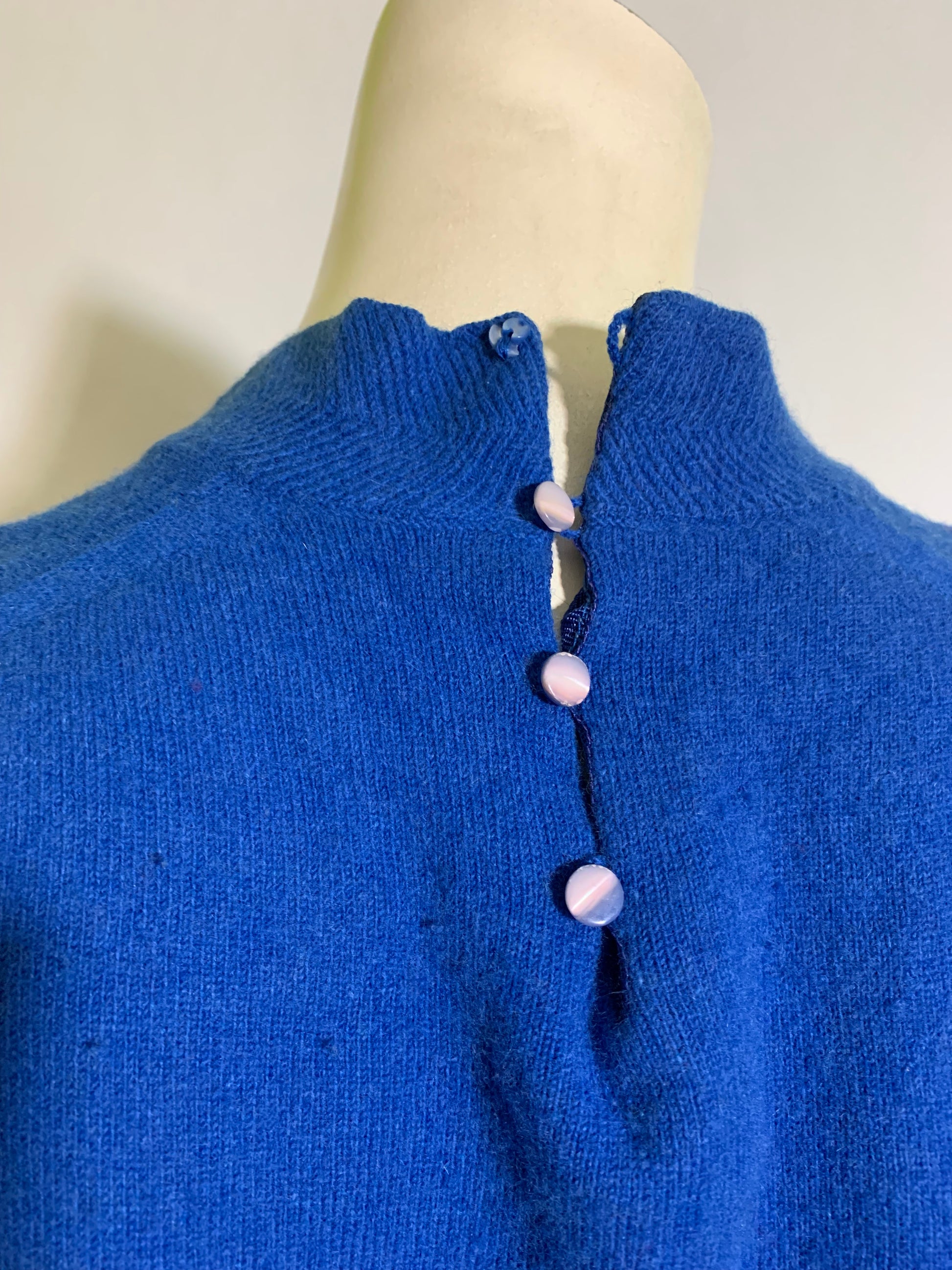 Cobalt blue orlon 1960s sweater with notched stand up collar, buttons at back of neck- top button needs replaced.