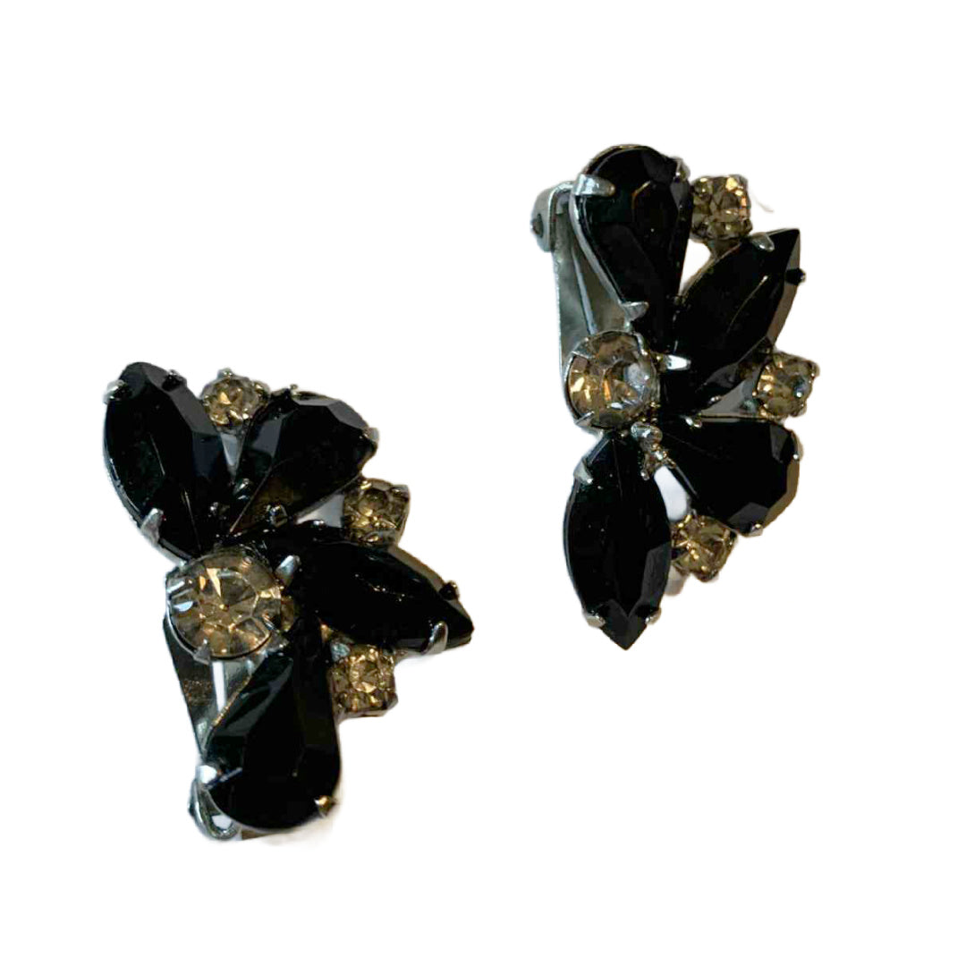 Curved Black Navette and Clear Rhinestone Clip Earrings circa 1960s