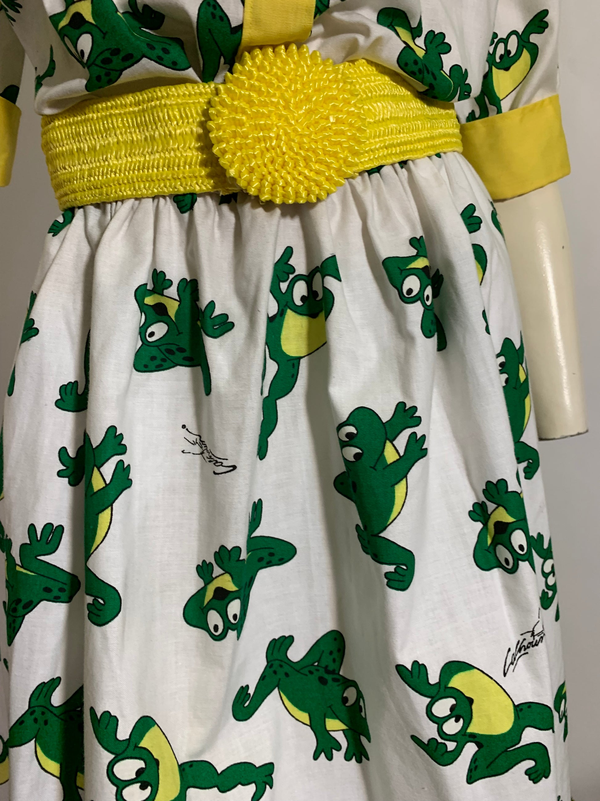 Adorable 1990s white cotton dress with leaping frogs and artist's name "Calhoun". Accented with yellow down front, neckline and across shoulders- elastic waist, I've added a yellow belt. Back zipper, no label, hand made. No flaws.