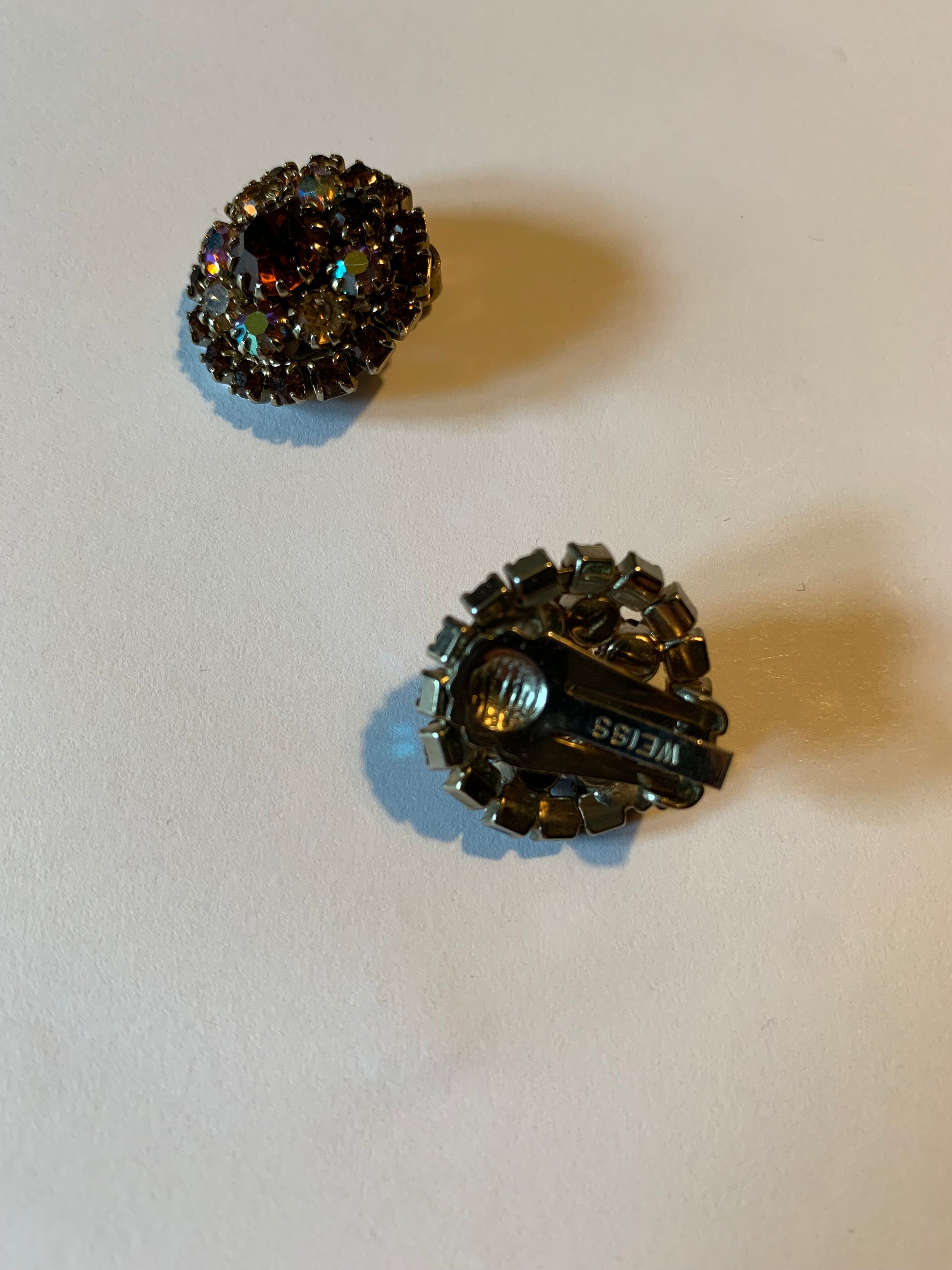 1" deep honey and aurora borealis rhinestone circular clip 1960s earrings by Weiss. No flaws.