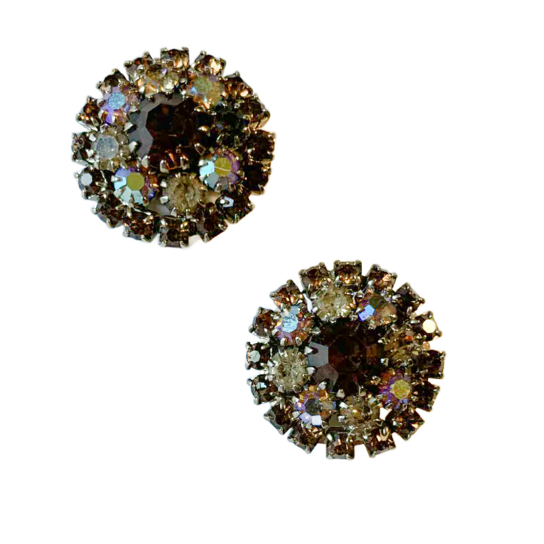Dark Honey Rhinestone Circle Clip Earrings circa 1960s Weiss