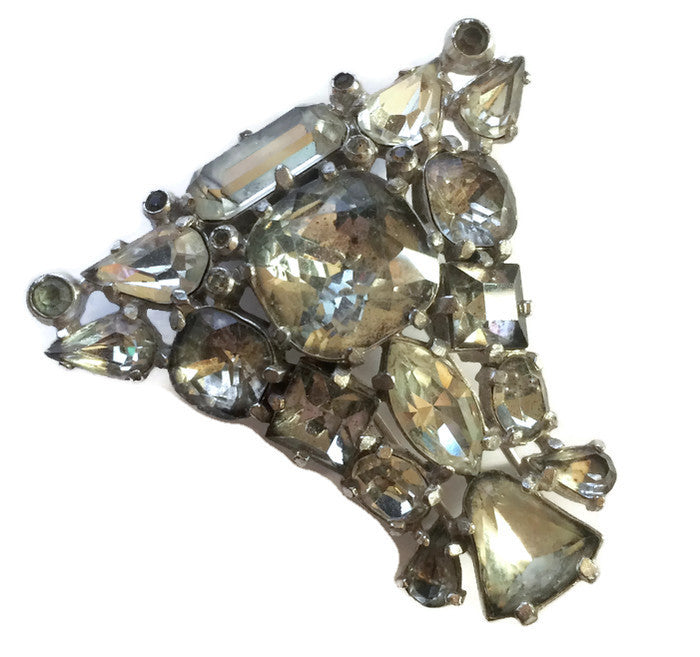 1930s rhodium plated rhinestone fur clip. Measures 2" wide by 2" long. Tiny bezel set stones have darkened a tad, the rest are clear and all intact (any darker hues are from reflections). No markings.