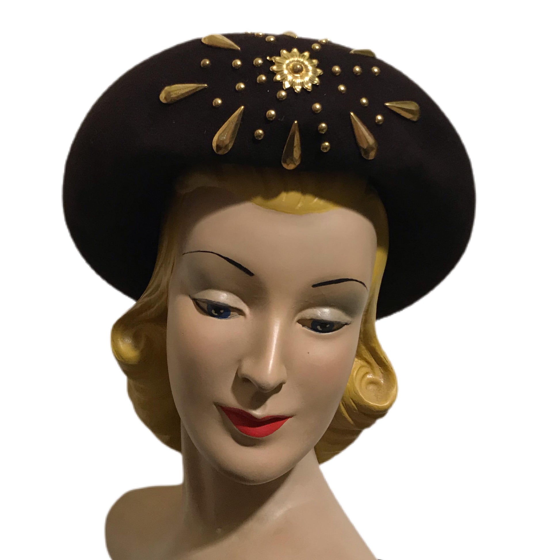 Deep Brown Felted Wool Round Brim Hat with Golden Studs circa 1940s