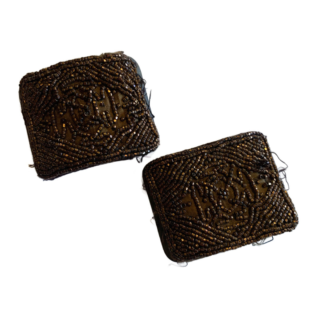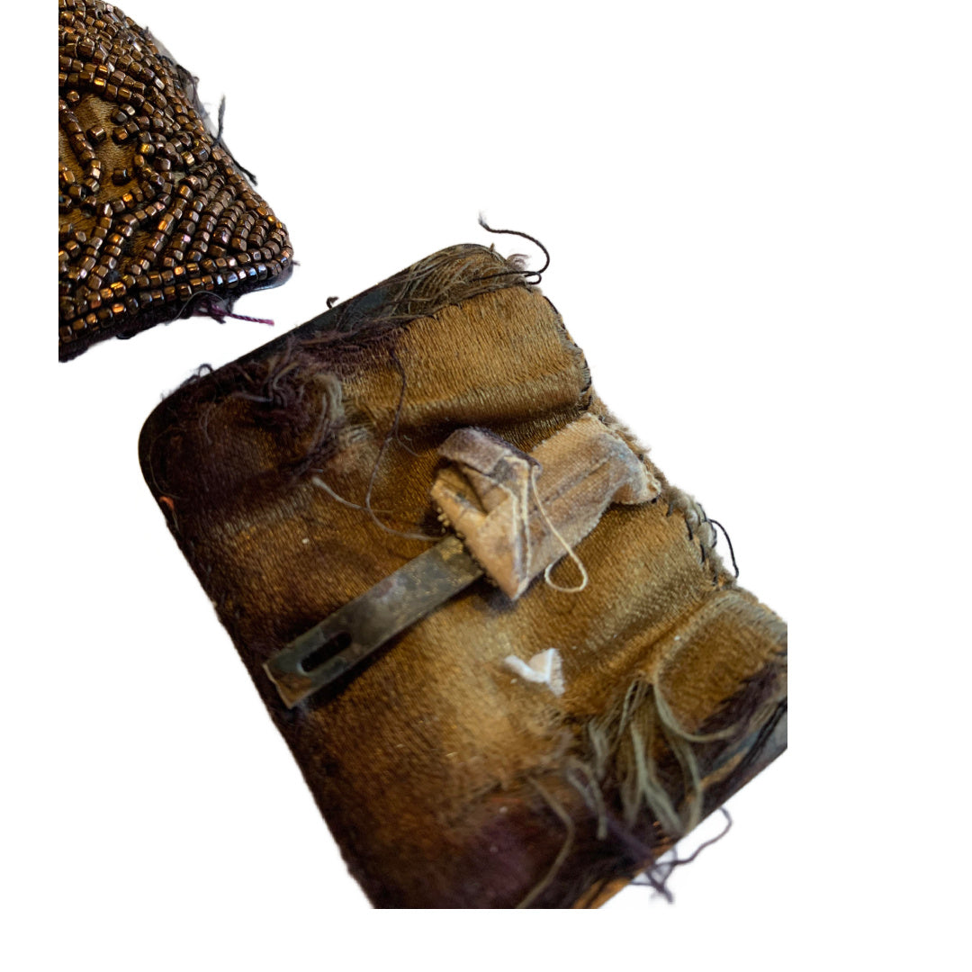 Cocoa silk shoe accents with hard backing, cut steel beading. A little wear, still useable.