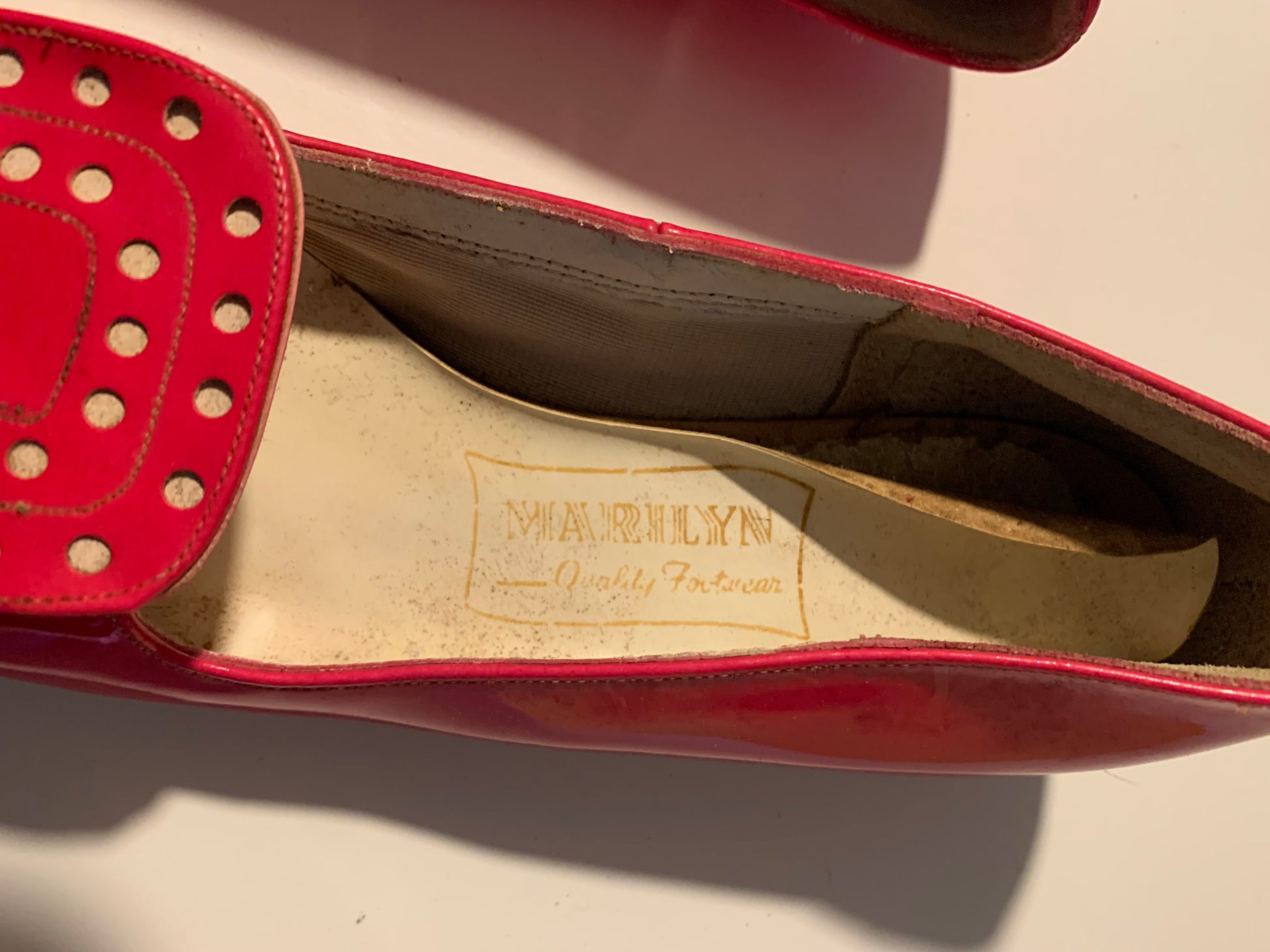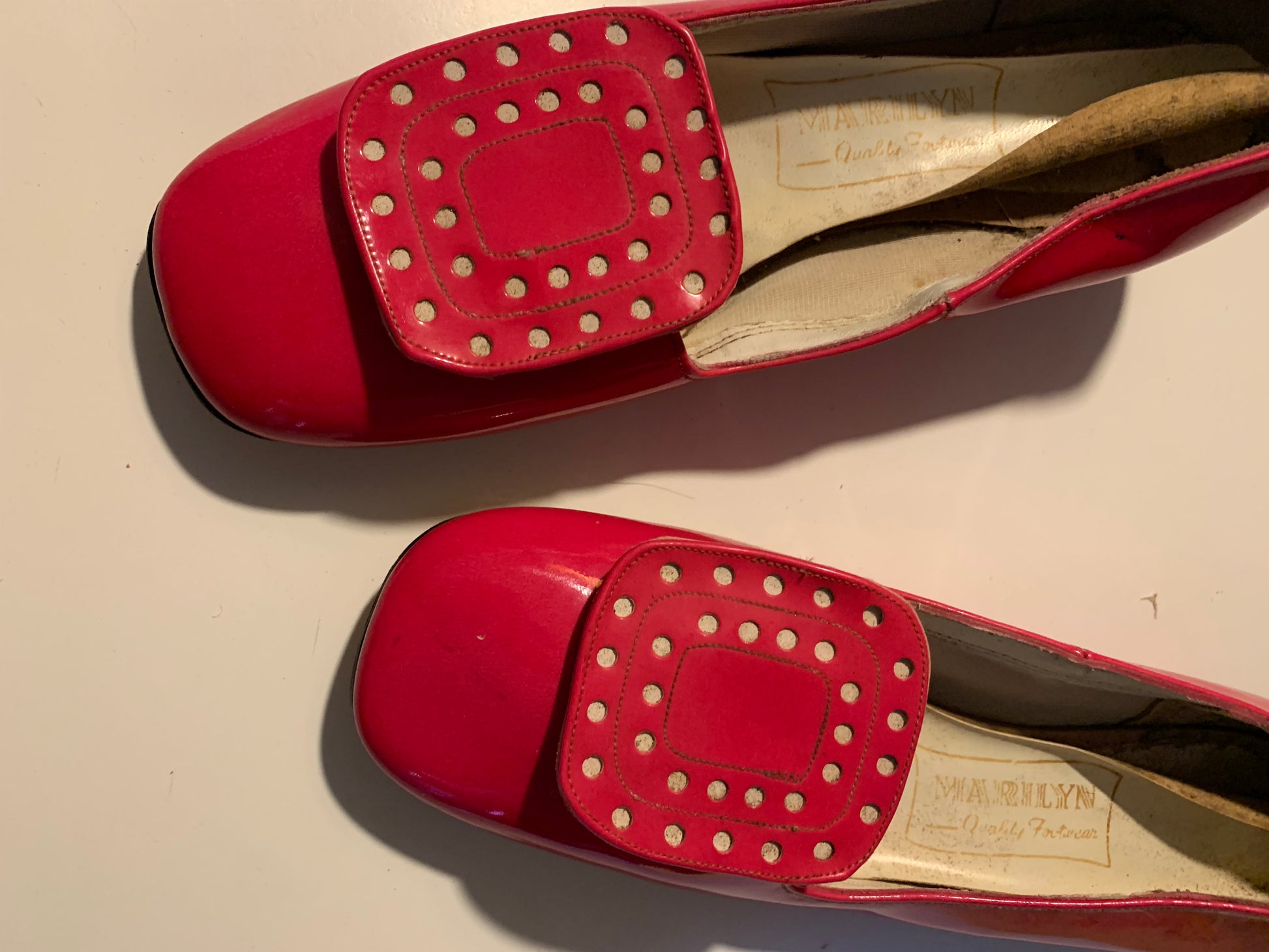 Electric pink patent vinyl squared toe shoes from the 1970s with big mod "buckle" accents, low chunky heel. Insoles need replaced. Unworn. By Marilyn, size 6.5N.
