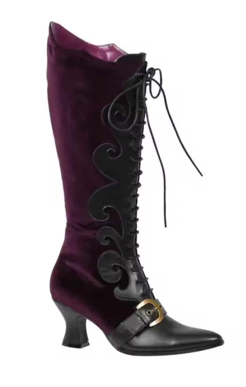 Witchy velvet and vinyl knee high boots with buckle, lace up front. 2 colors, sizes in EU.