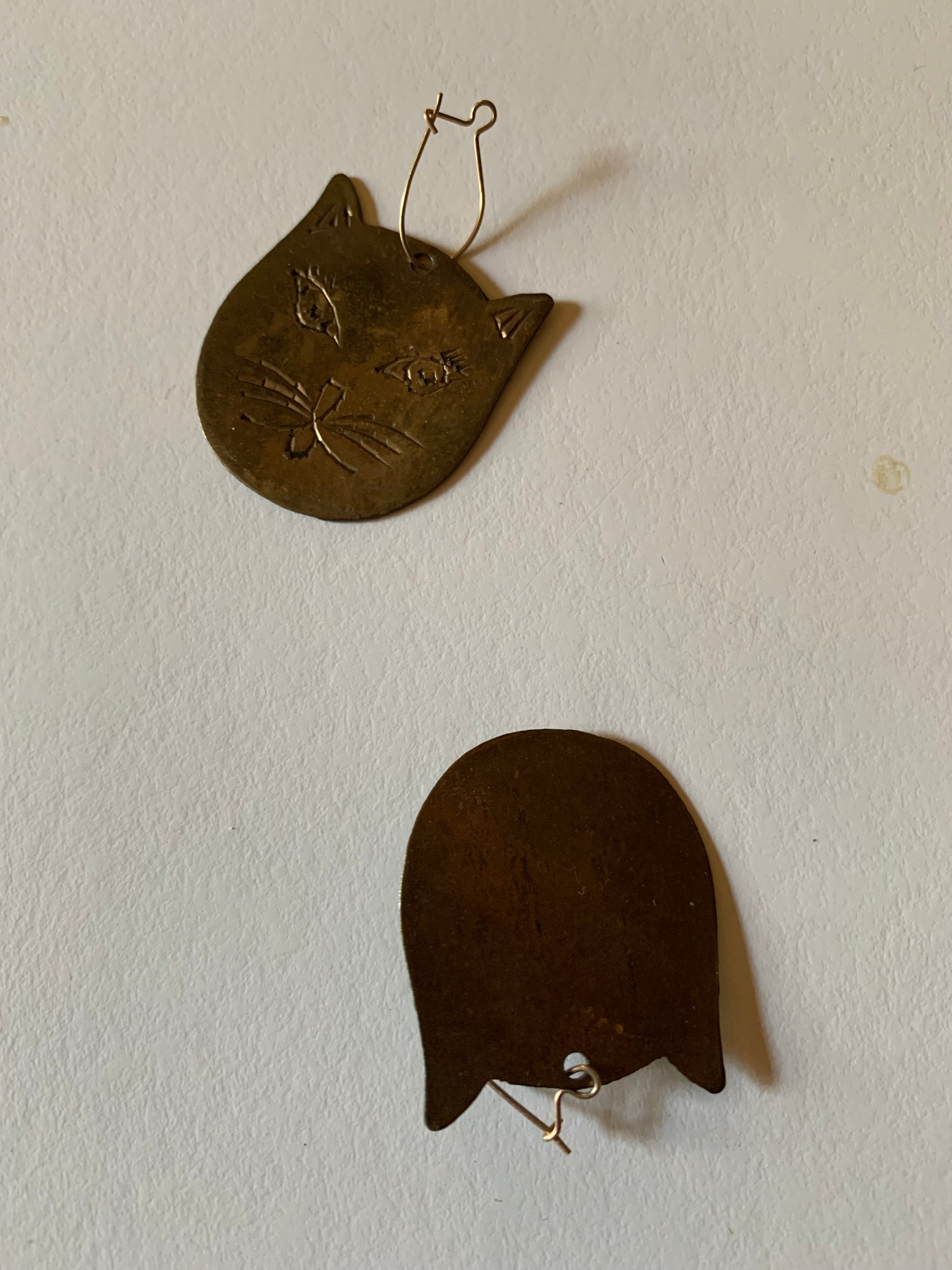 Silver plated etched cat head earrings from the 1960s- French hooks. Could be older. 1 1/4" by 1". A little tarnish. No markings.