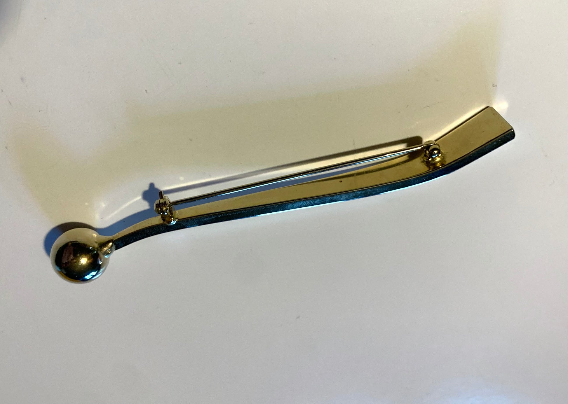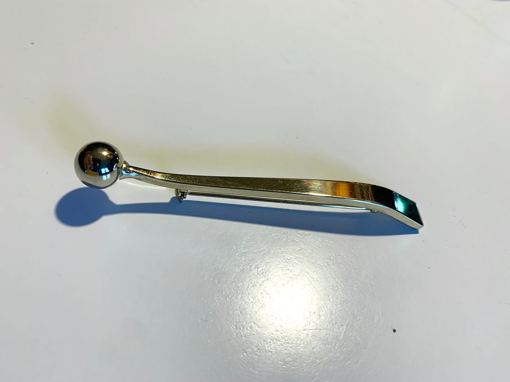 Silver tone metal chunky yet slim 4" long exclamation point brooch curved along upper part. No markings, no flaws.