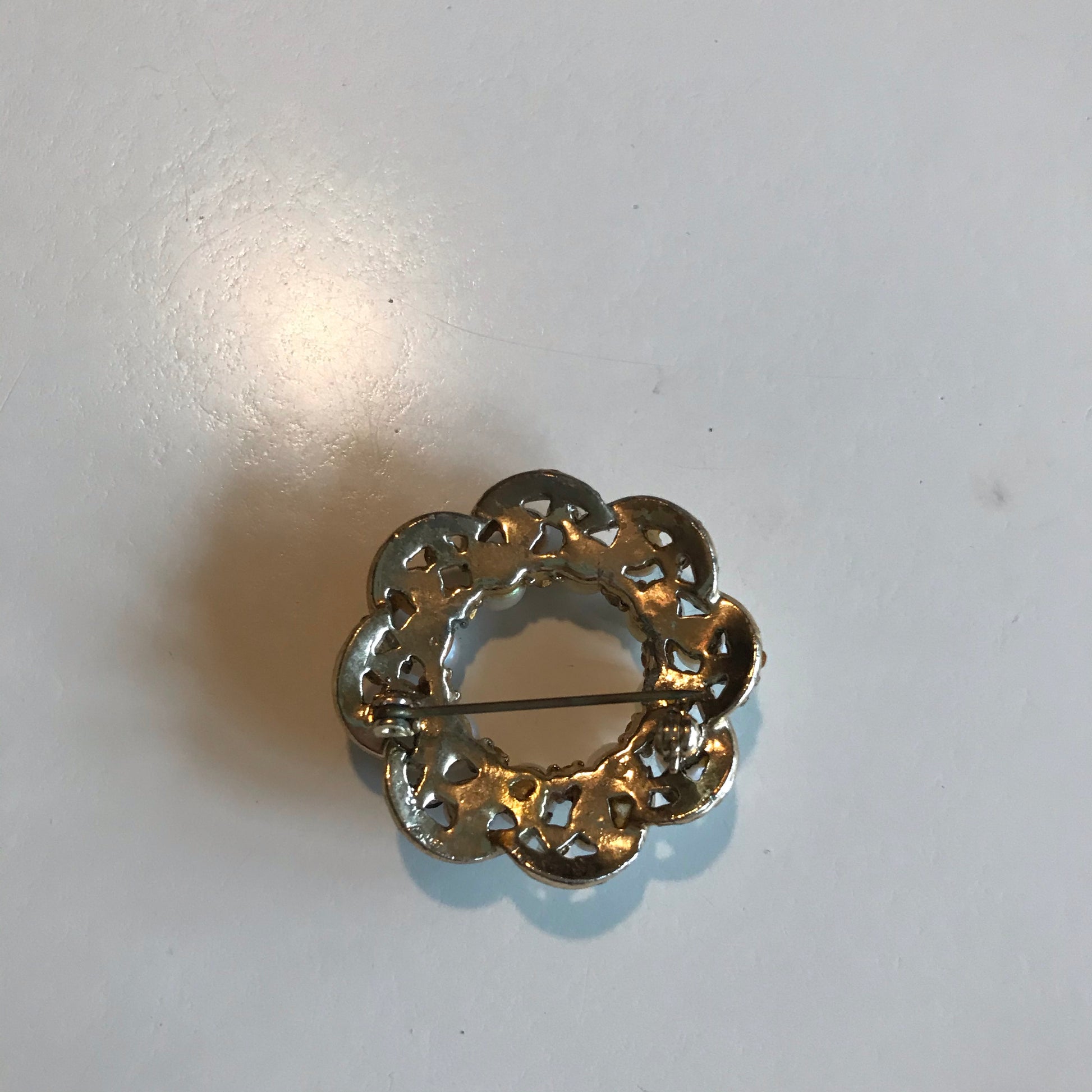 Gold tone metal 1950s wreath shaped brooch with faux pearls and clear rhinestones. No markings, no flaws.