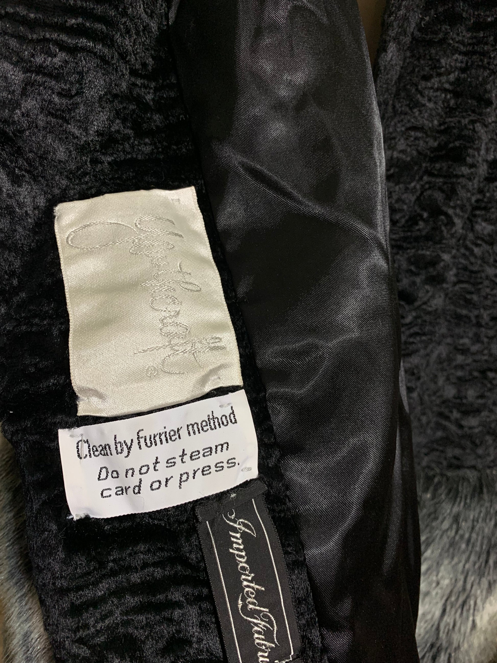 Gorgeous 1960s black Persian lamb and chinchilla FAUX fur coat with wide, peaked lapel that can be worn open or closed up at neck off to the side with black braided frog style closure. Fully lined, unworn. Missing belt- you could add one or remove the belt loops. By Youthcraft.