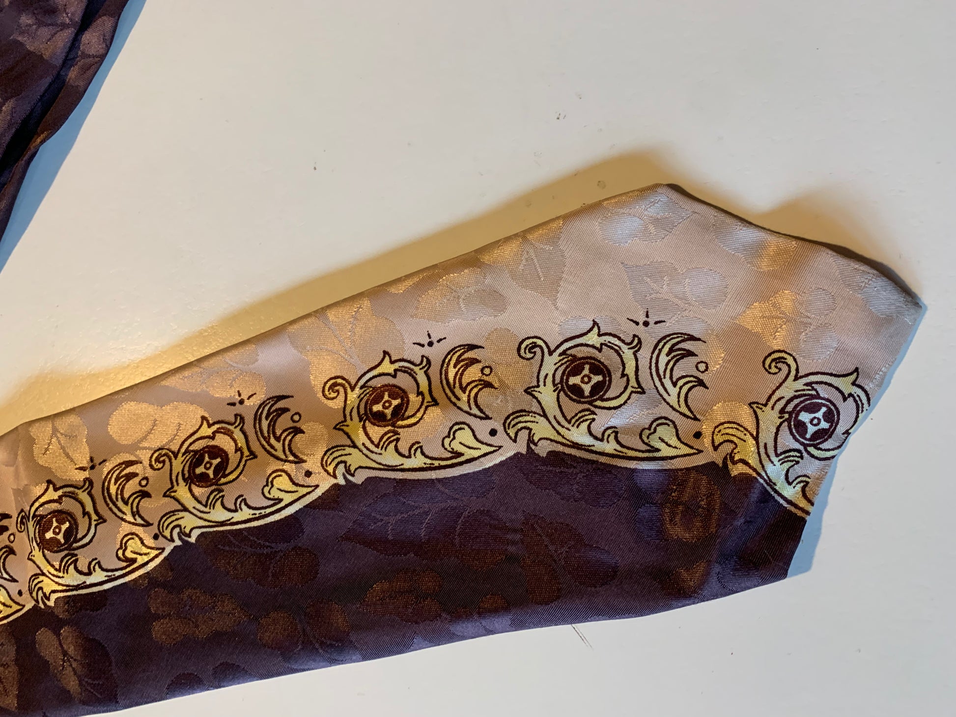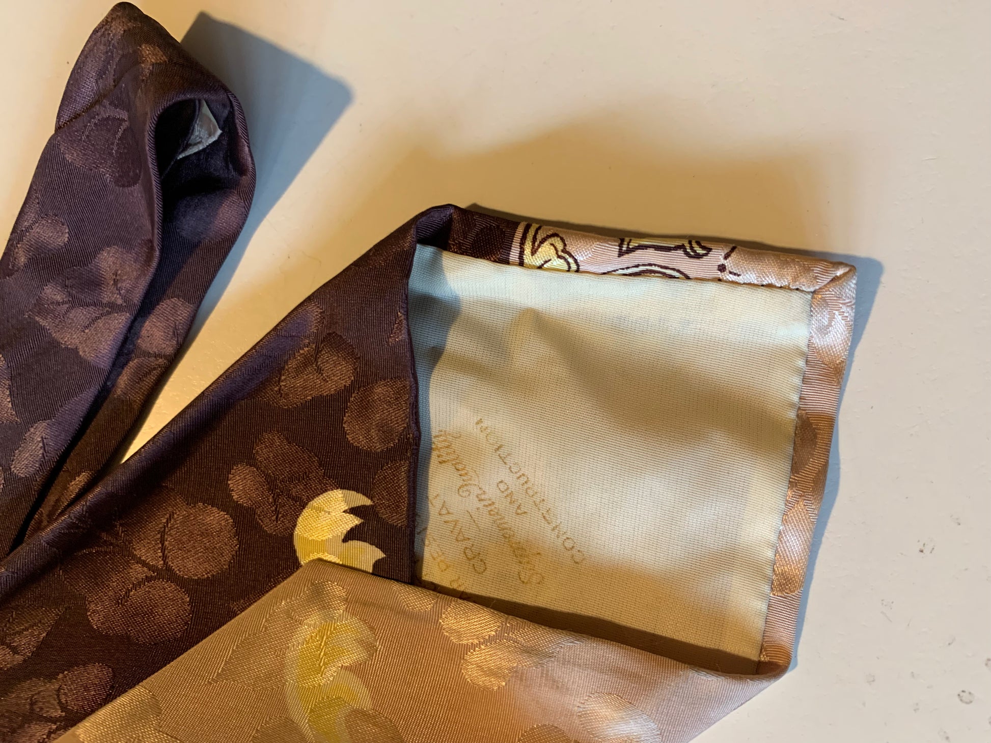 1940s wide silk Resisto filigree print tie in plum and pale rose with golden yellow highlights. Design is named "Sterling". No flaws.