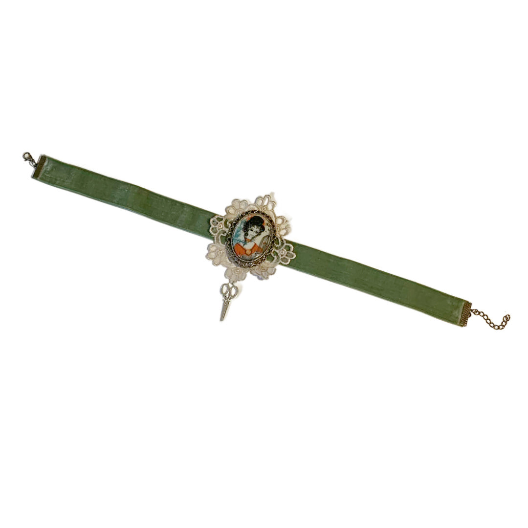 Girl With the Green Ribbon Reimagined Velvet Ribbon Choker Necklace with Portrait Brooch and Scissors