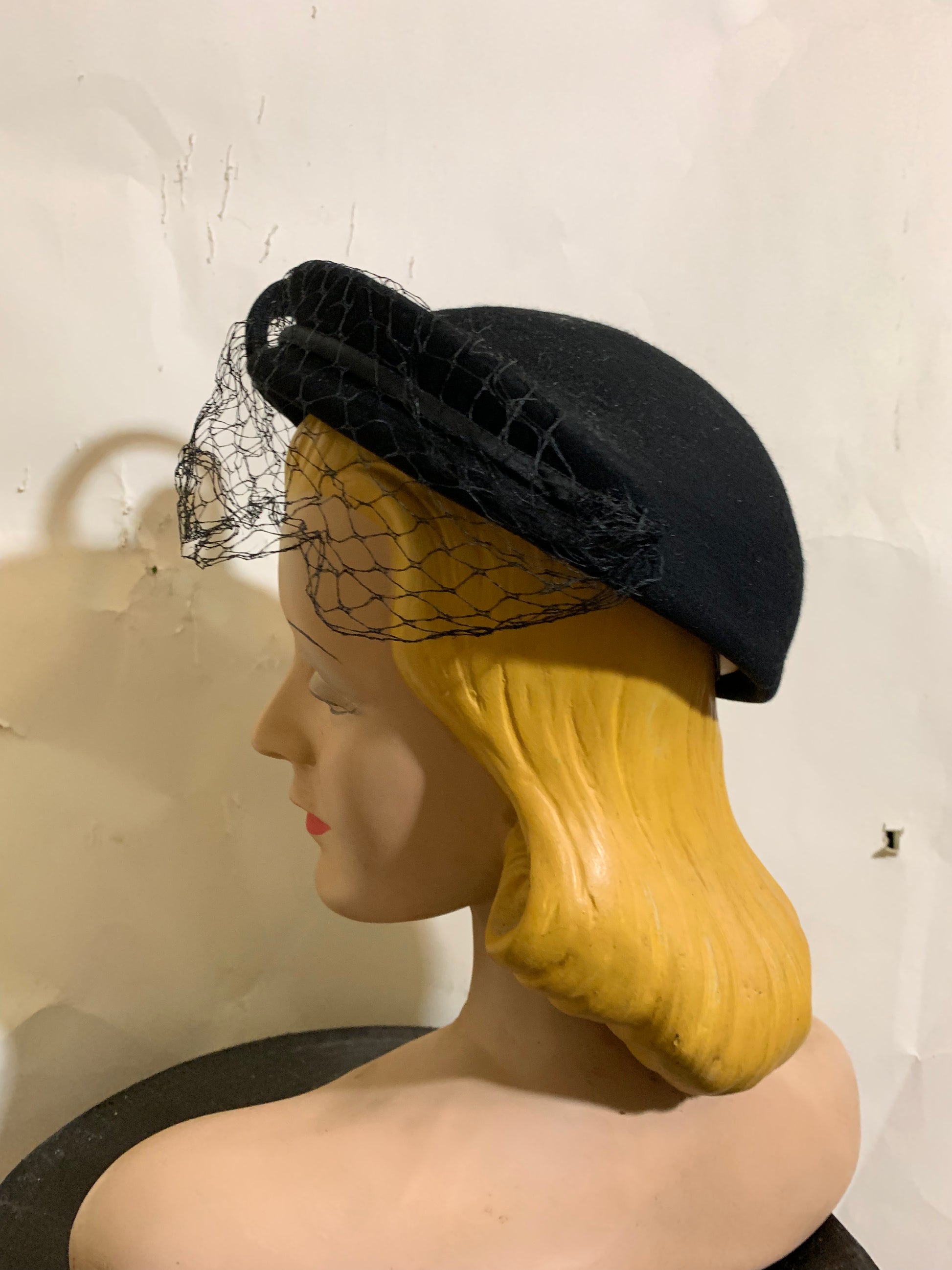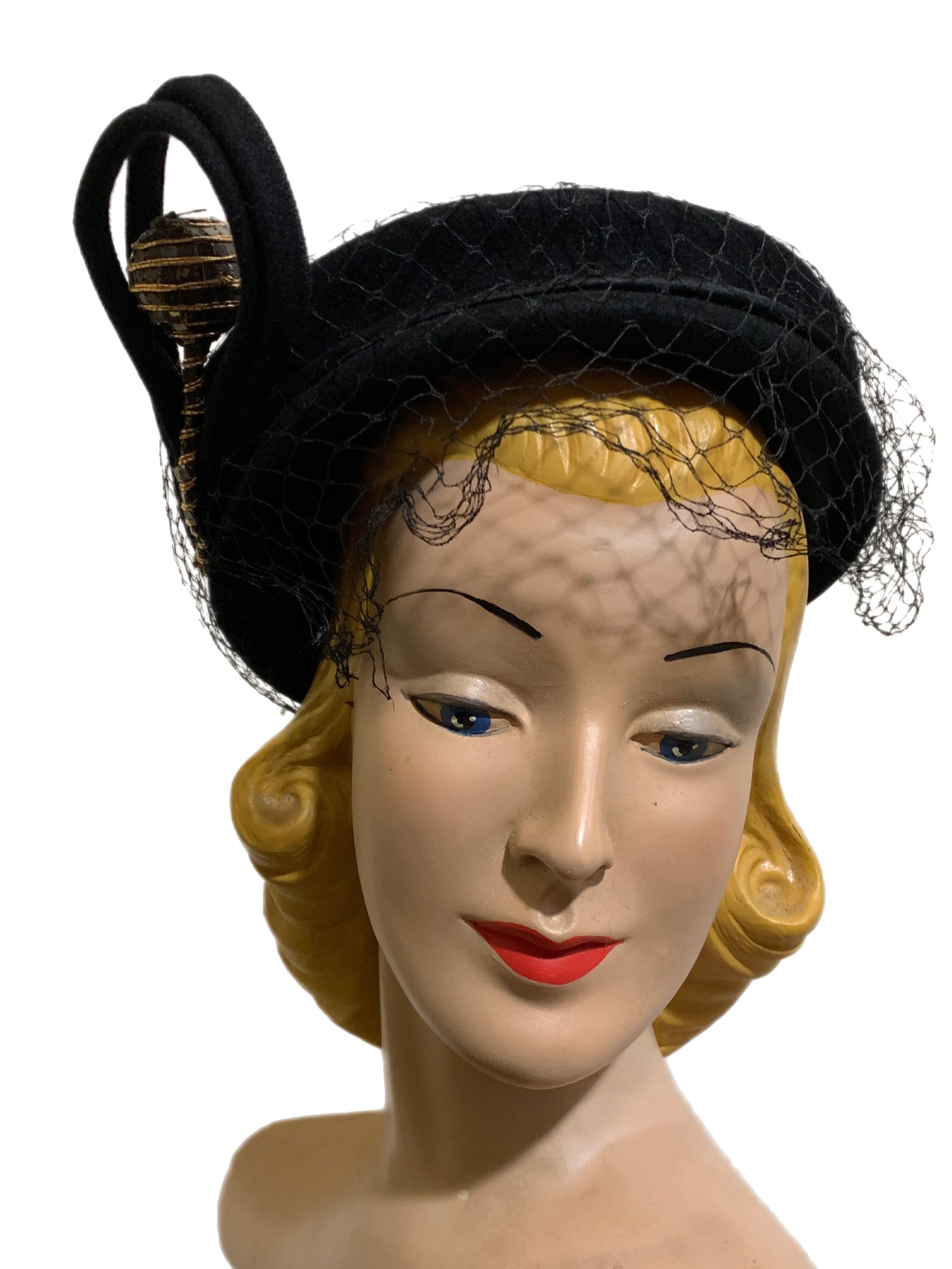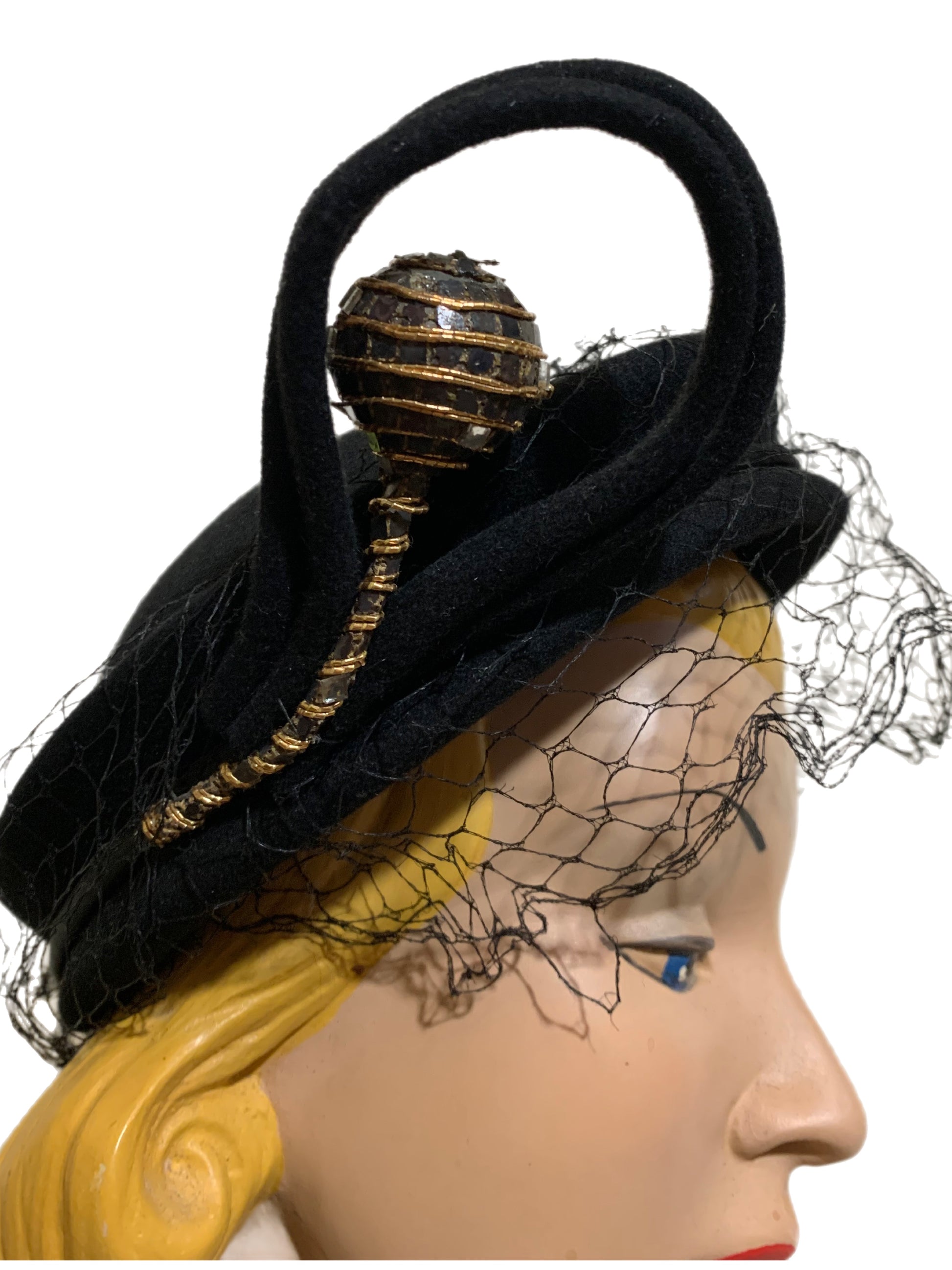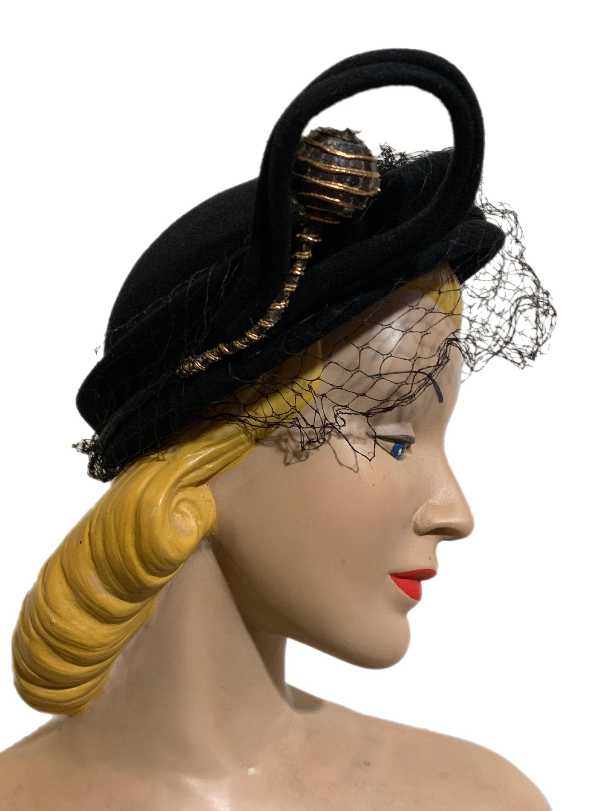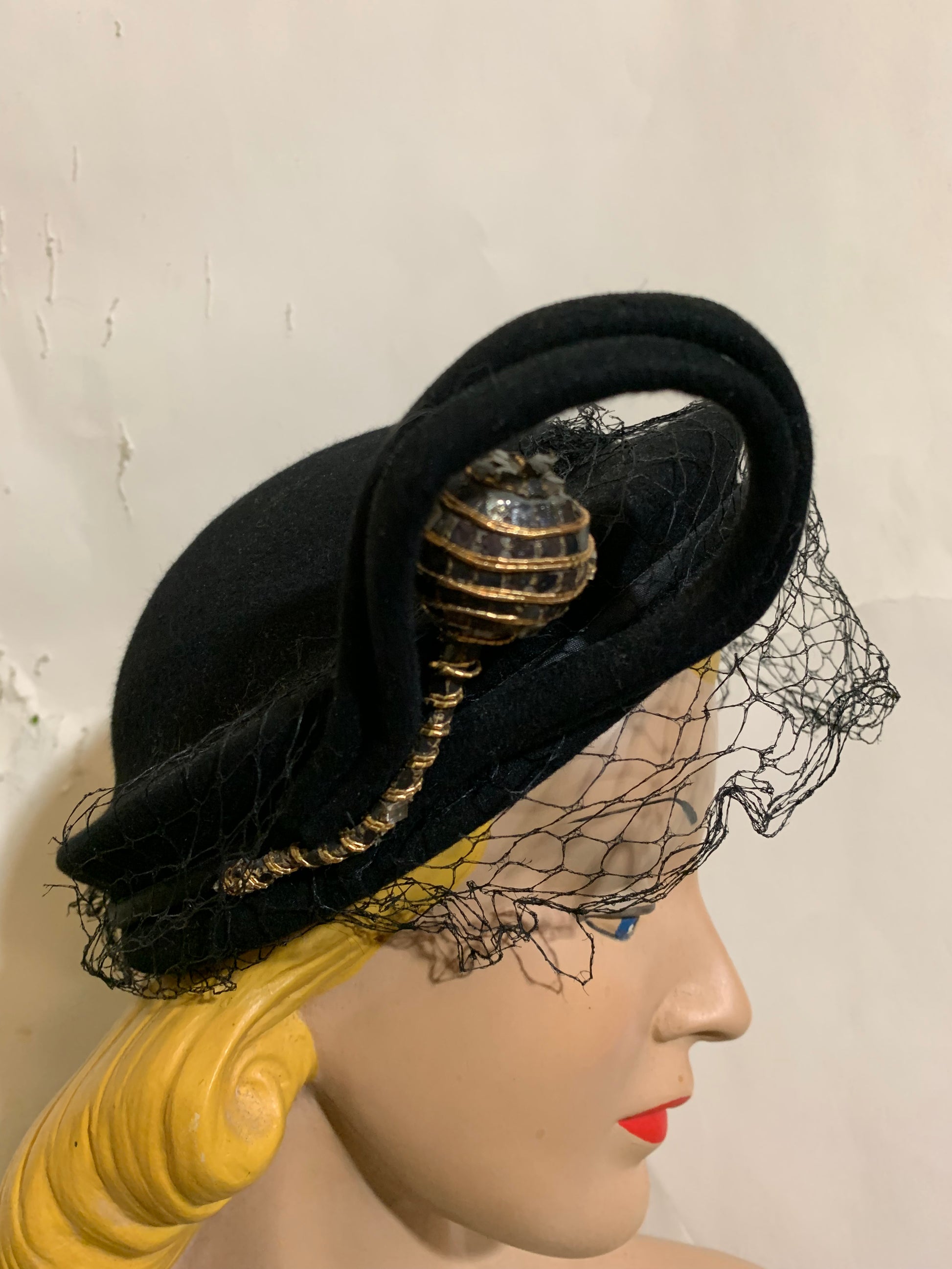 Incredible 1930s black felted wool asymmetrical angled hat with veil, swirled curlique and gold metallic trimmed ball accent on stem Veil has a little damage. Size 22 1/2. Really unusual!