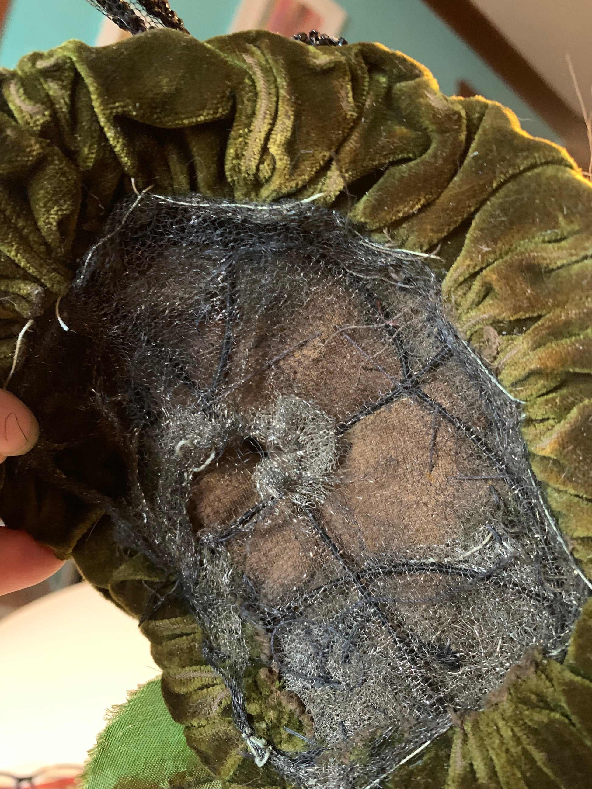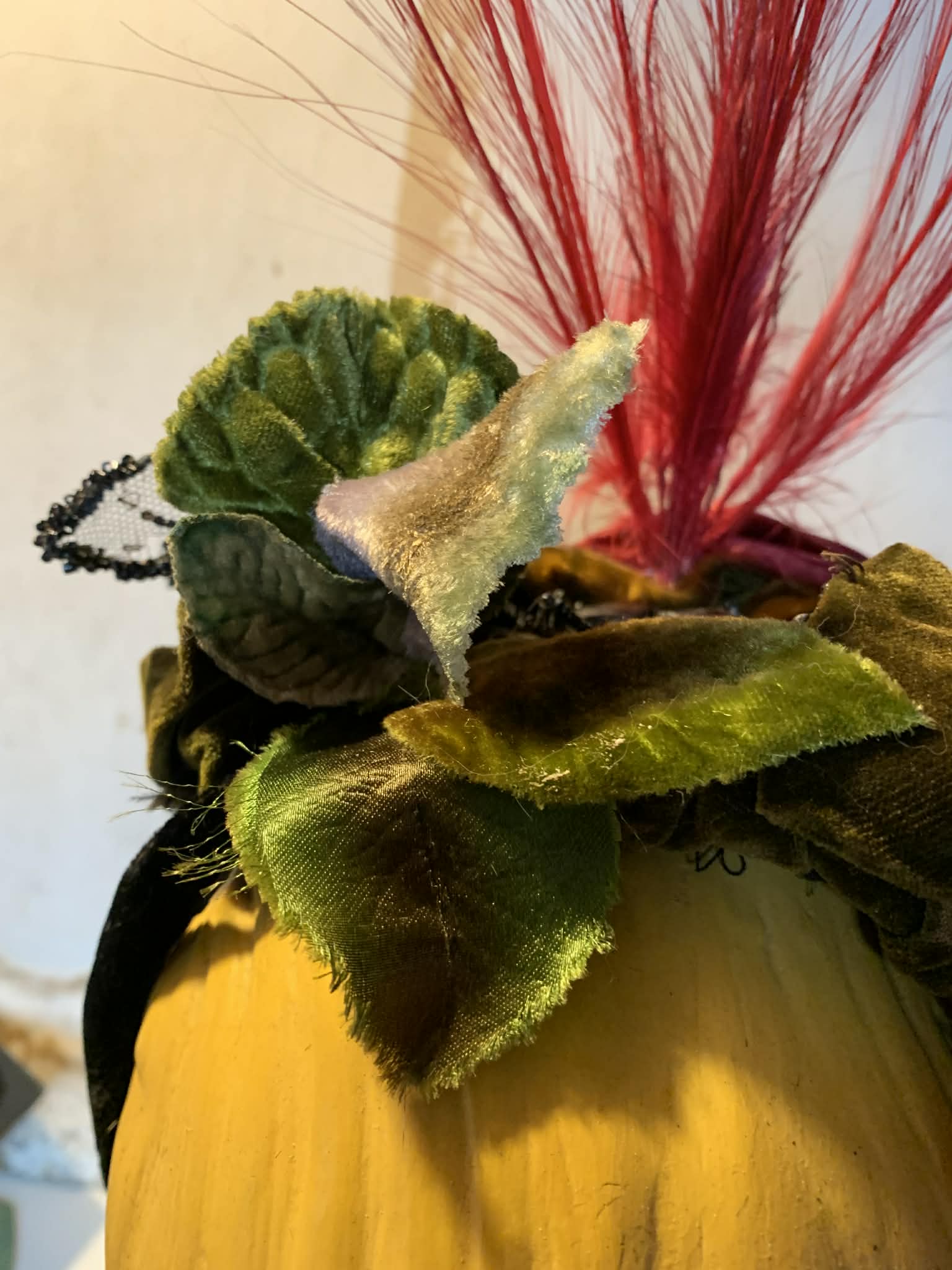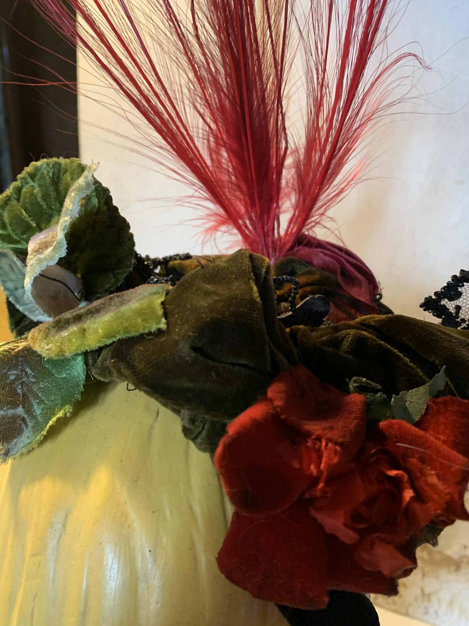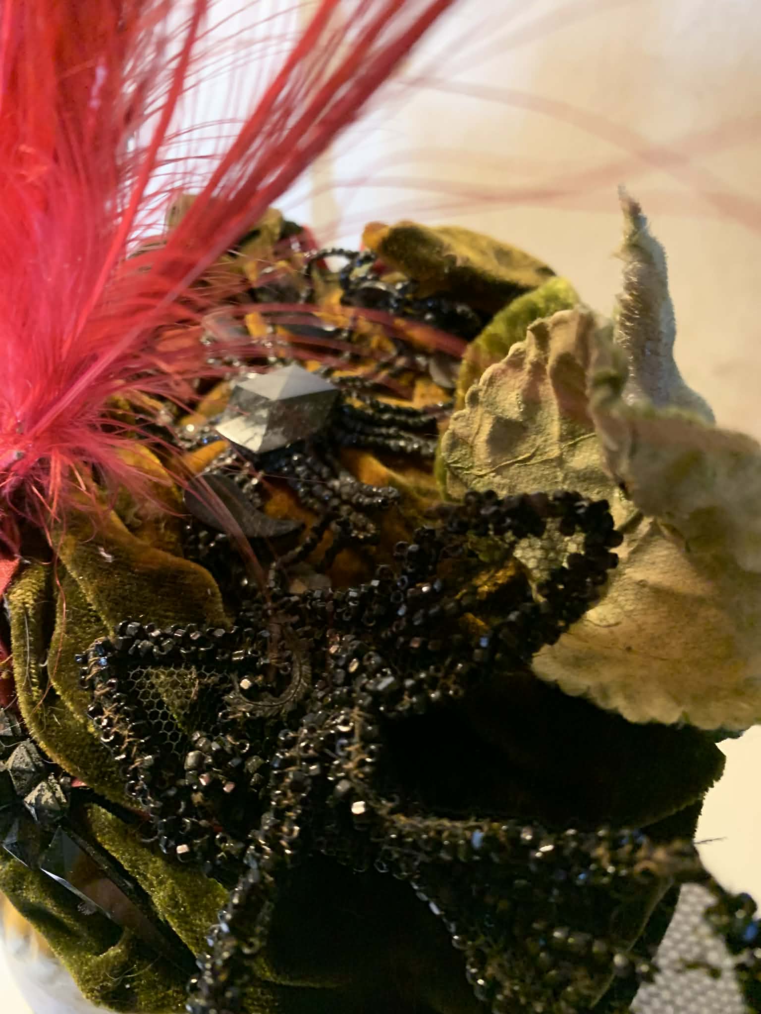 Victorian velvet and silk bump base redesigned and rehabbed by me! Super tall red spiked feathers and green velvet leaves have been added to accent- the rest is original. Jet beaded mesh leaves at sides of front, red and green twisted ribbon atop velvet base- more jet beading center top. Back has velvet flower on one side (original) and leaves on other (vintage, not original to hat). Red feathers at front added, also vintage. Ribbon strap with chiffon ends also original- some wear. Gilded Age glamour! One size.Â