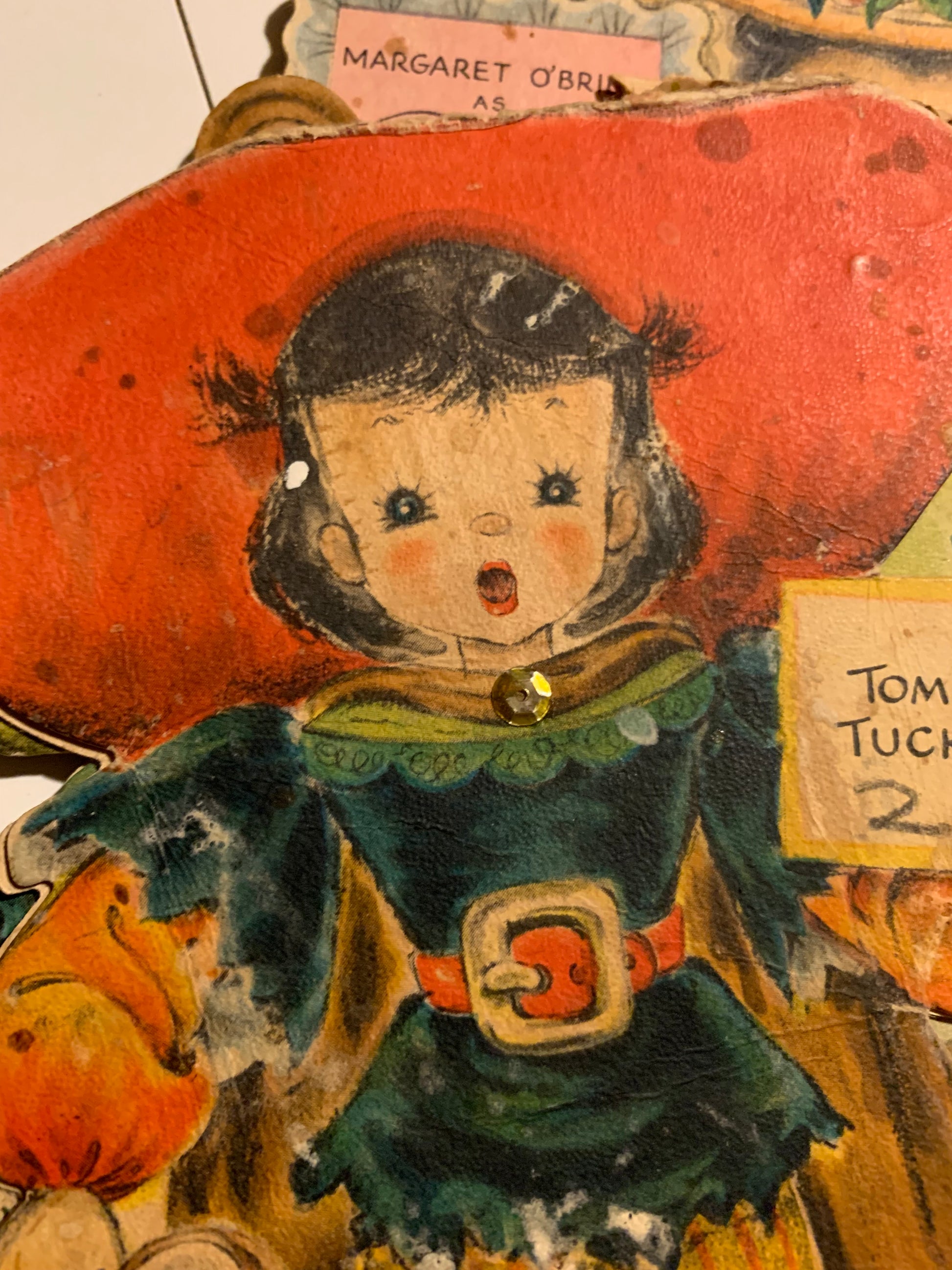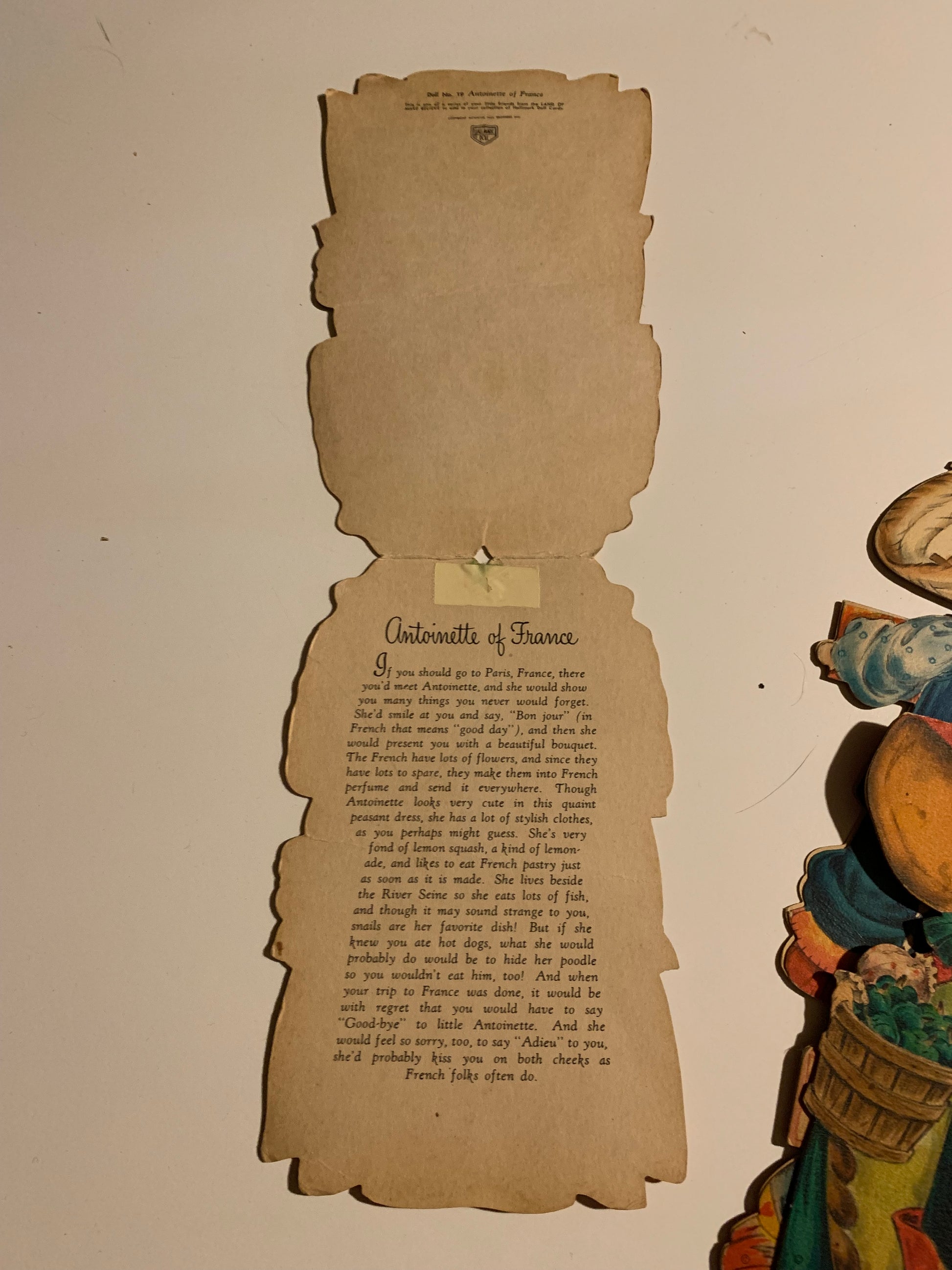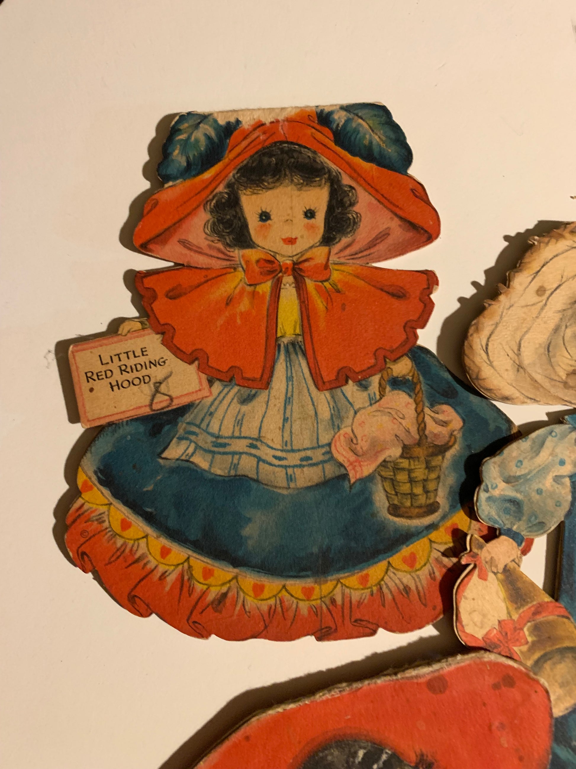 8 1940s collectible cards depicting Land of Make Believe and Dolls of Nations. Sturdy card stock, each with a little story inside. Some of the cards have sequin accents.