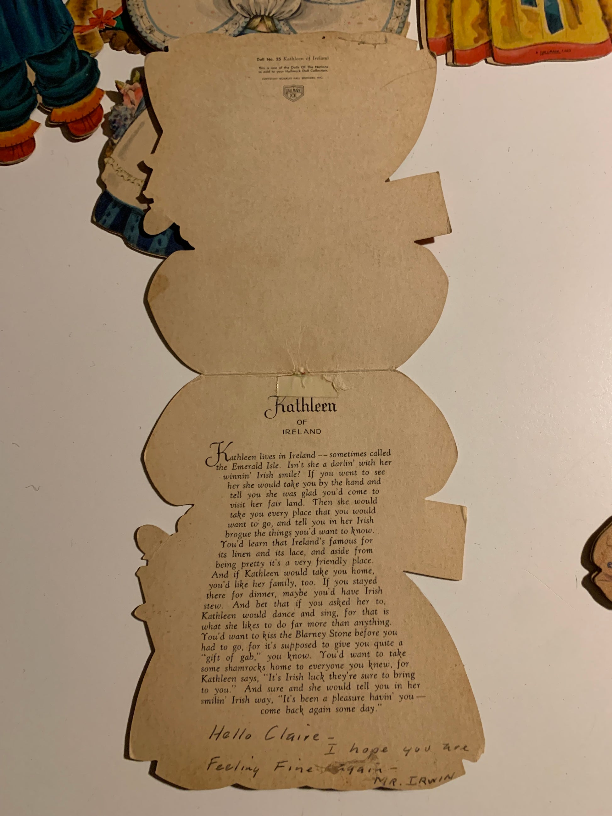 Kathleen of Ireland Doll No. 25- has tape inside at top, some writing