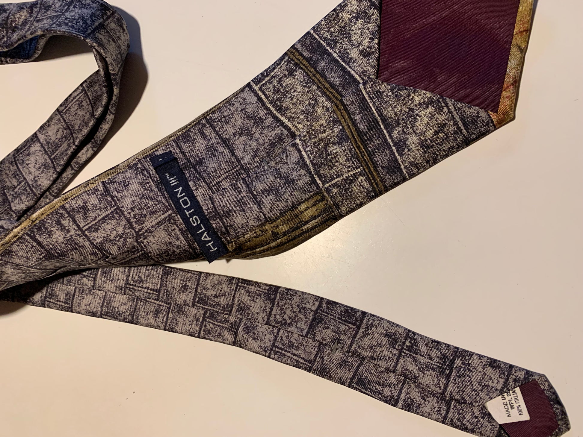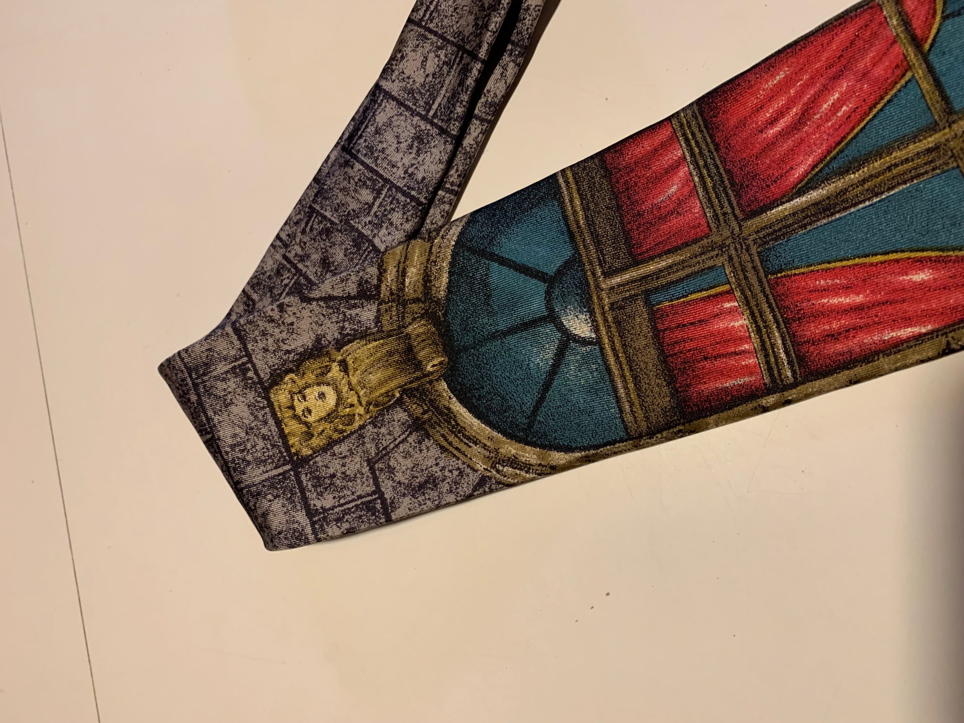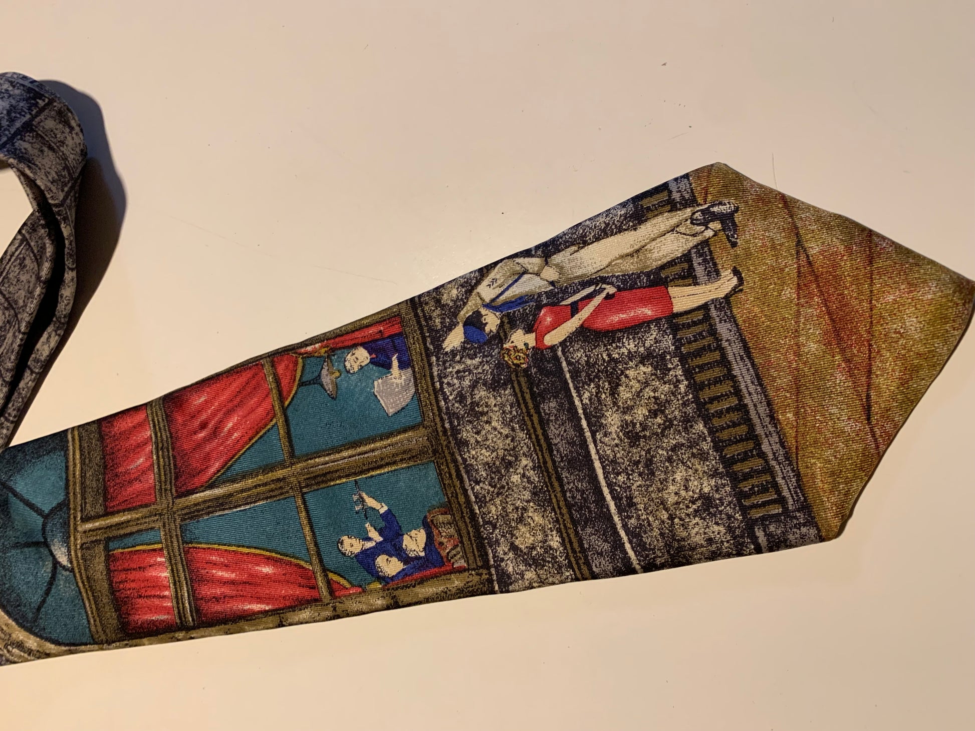 Fantastic early 90s tie with city street scene of a couple talking as onlookers watch from a window. By Halston III. 100% Italian silk, no flaws.
