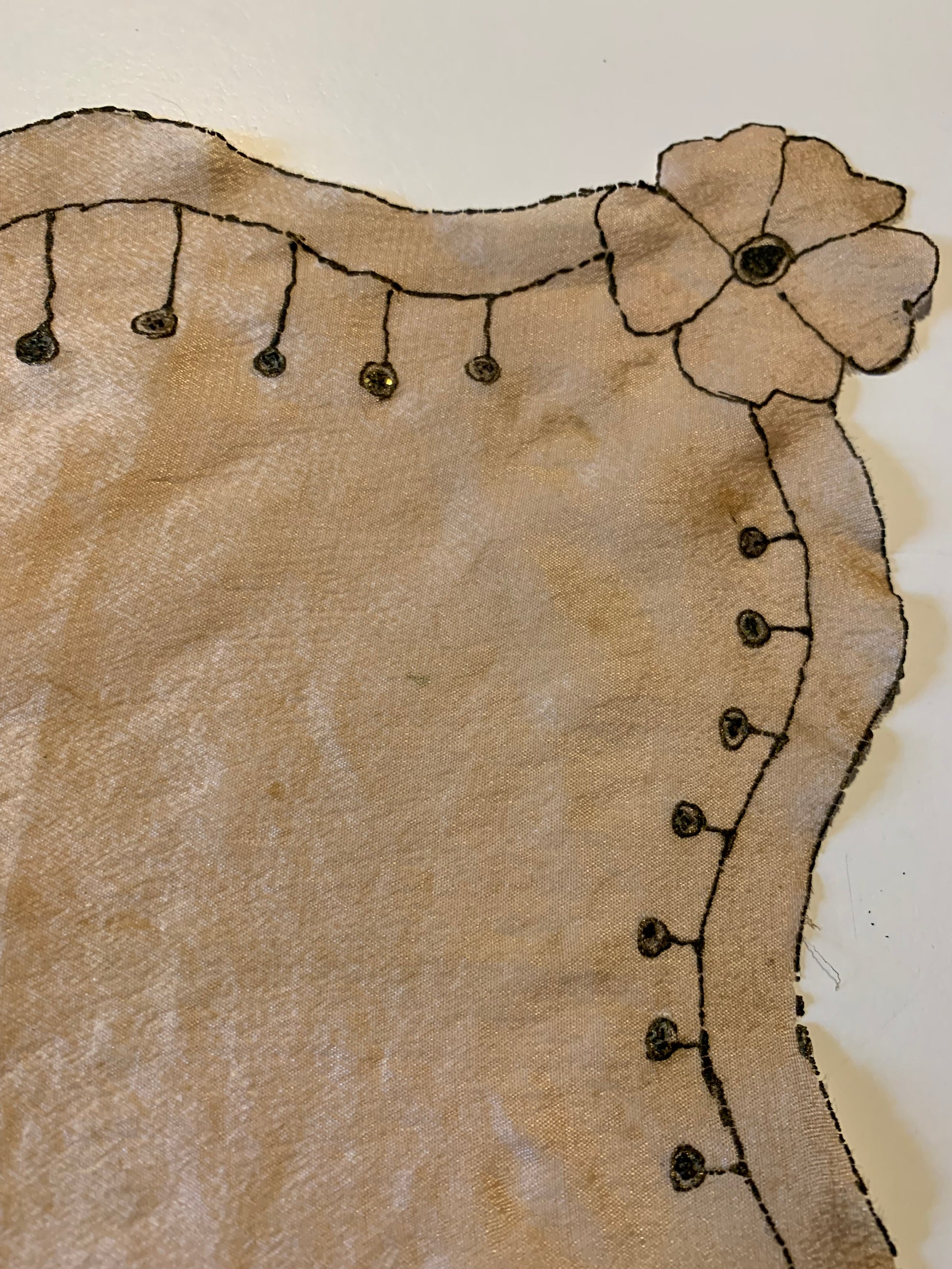 8" silk hanky from the 1920s with golden hand painted art deco design, scalloped edges.