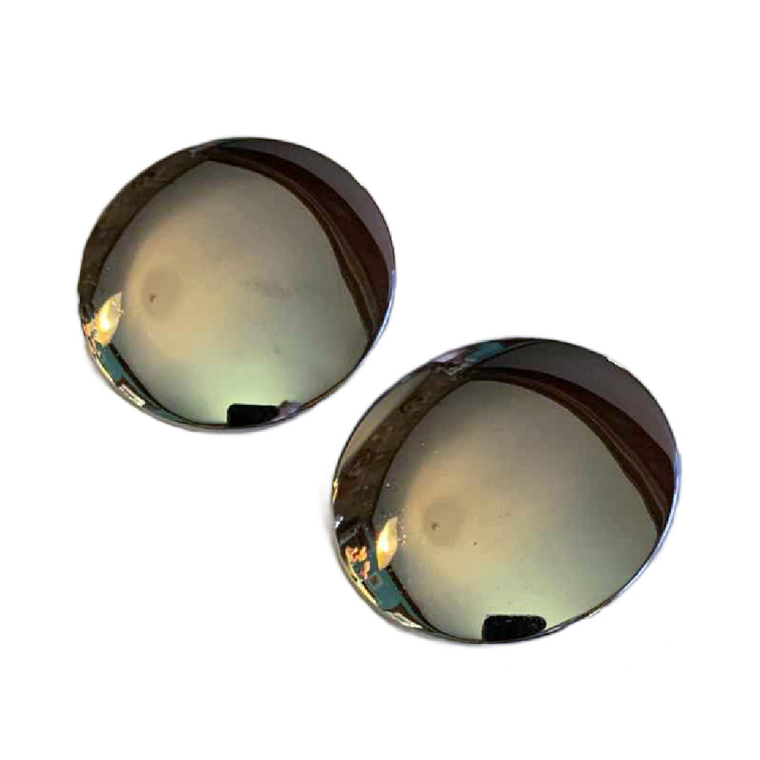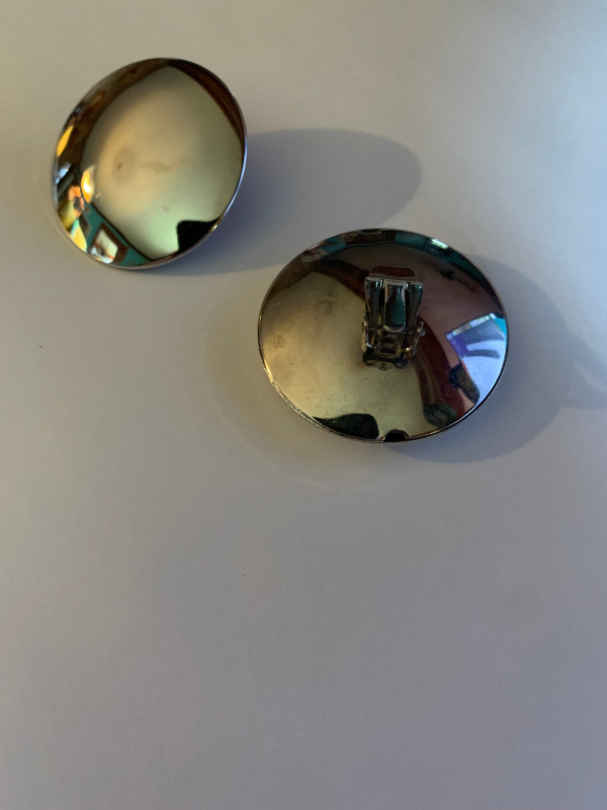 2" curved silver tone mirrored disc 1980s earrings. Clips, no markings, no flaws.