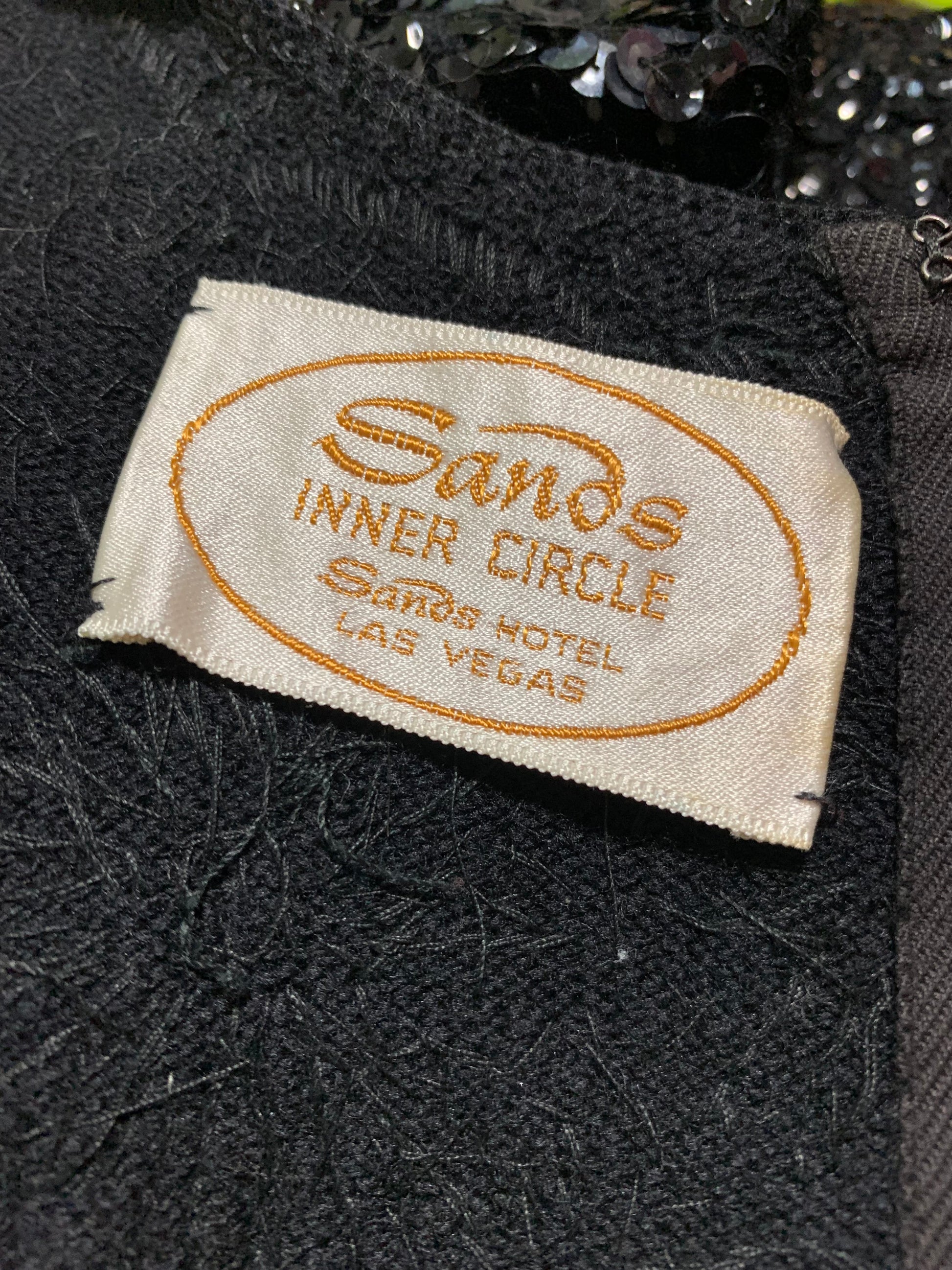 Incredible, iconic 1960s black wool fitted knit dress loaded with sequins and beads- from "The Inner Circle" boutique that was at The Sands Hotel back in the heyday of the Rat Pack. Maybe Sinatra walked past this little number! Back metal zipper, hooks and eyes at top of low back and inside waist to connect petersham ribbon to accent waistline. Flawless condition, unlined. Very possibly a Gene Shelley.