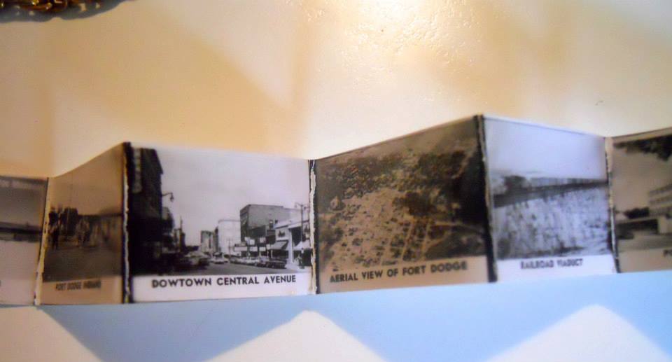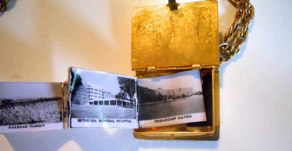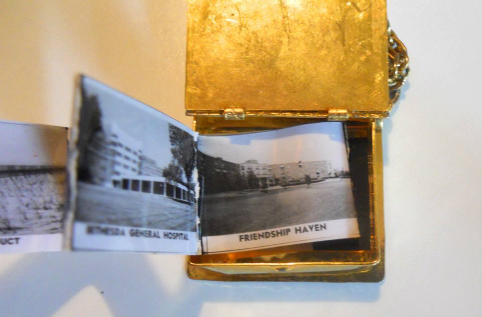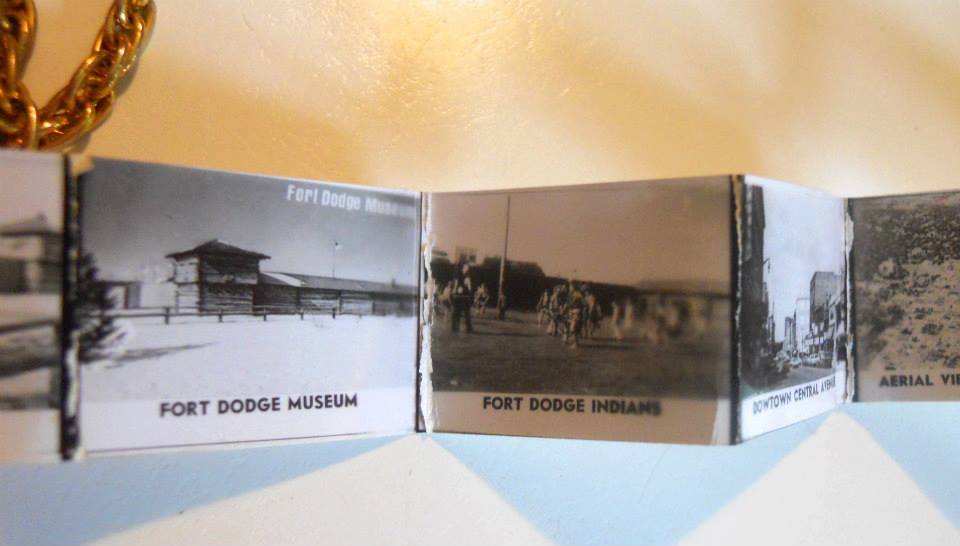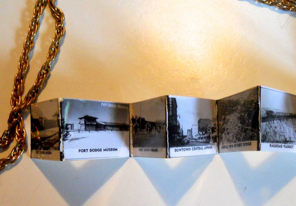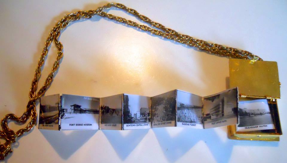 Gold tone metal chain with book shaped locket holding fold out photos of Fort Dodge, Ia. My hometown! I don't wear it so it's time to let it go.