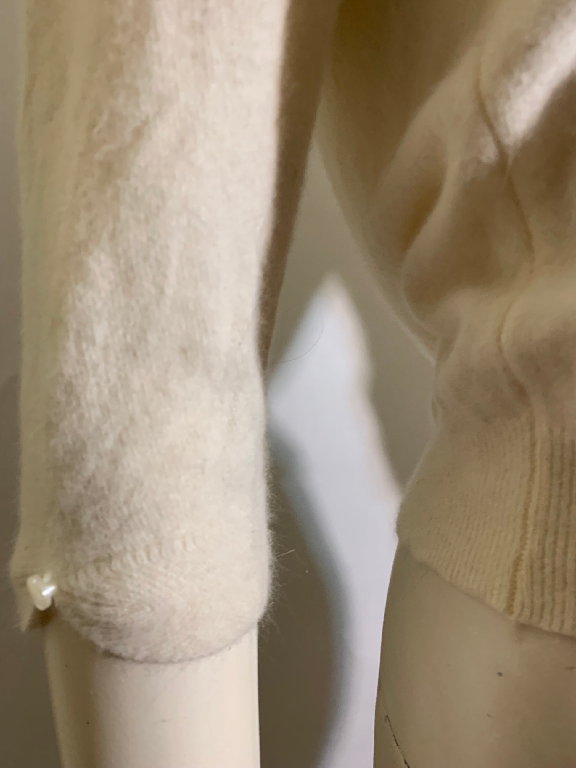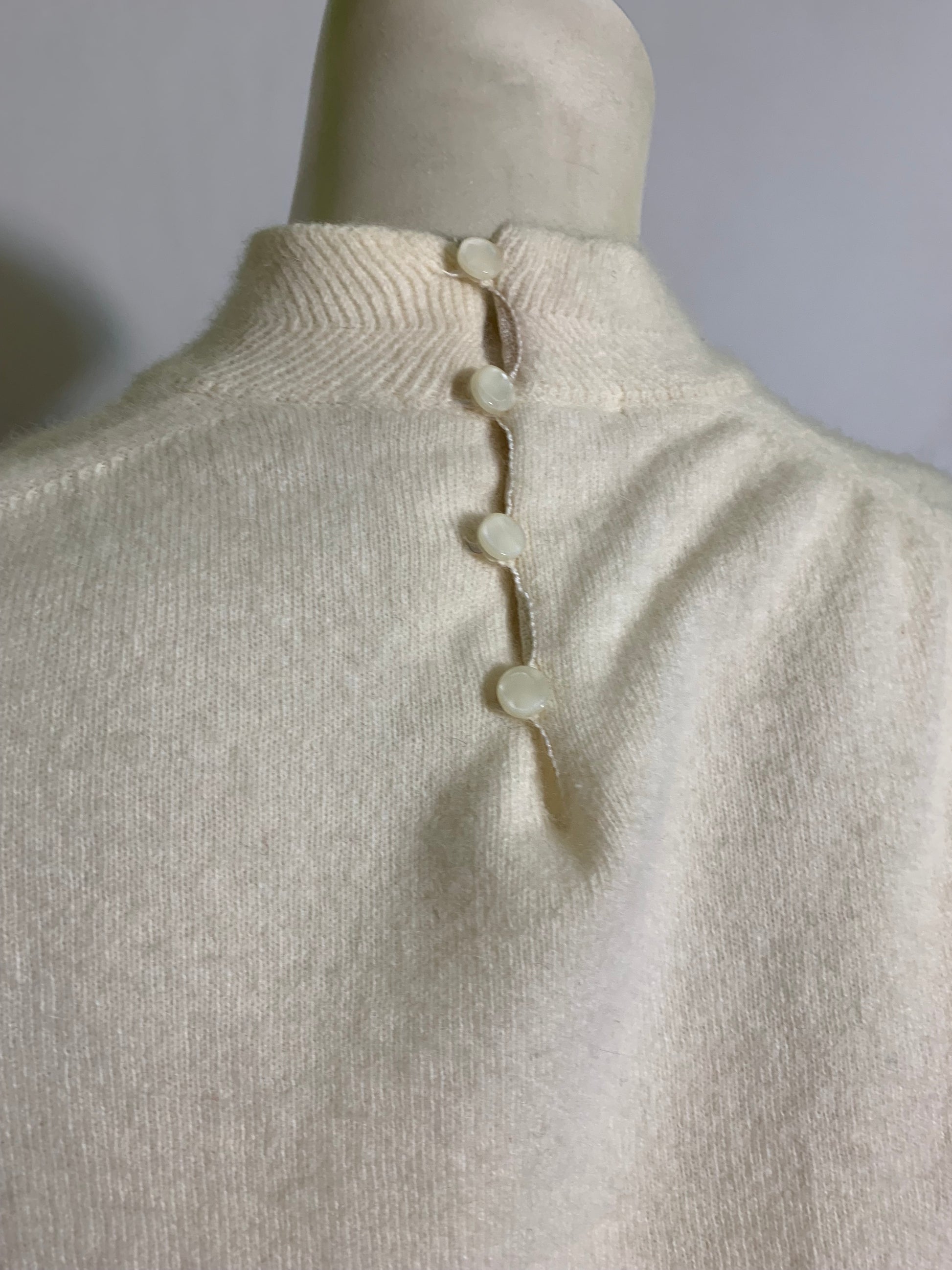 Ivory orlon 1960s sweater with high neck collar accented with button- buttons up back of neck, button accent on cuffs. Some pilling, no stains.