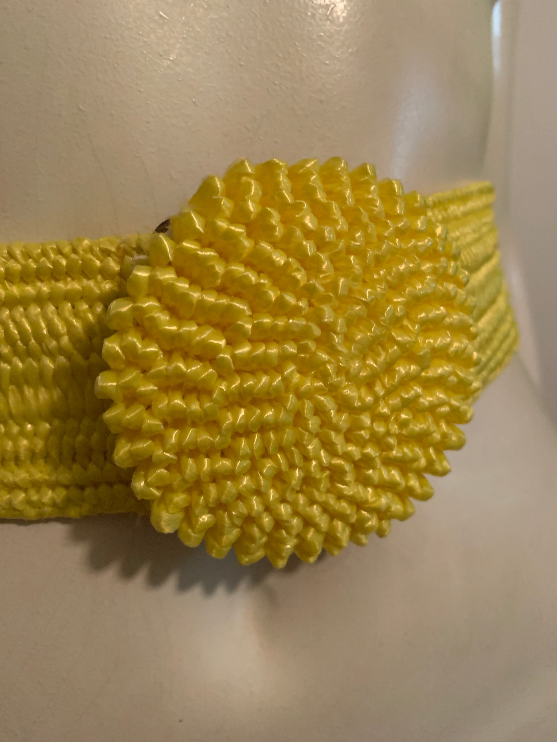 Yellow stretch sisal 80s belt with raffia flower, metal clasp behind flower. No flaws.