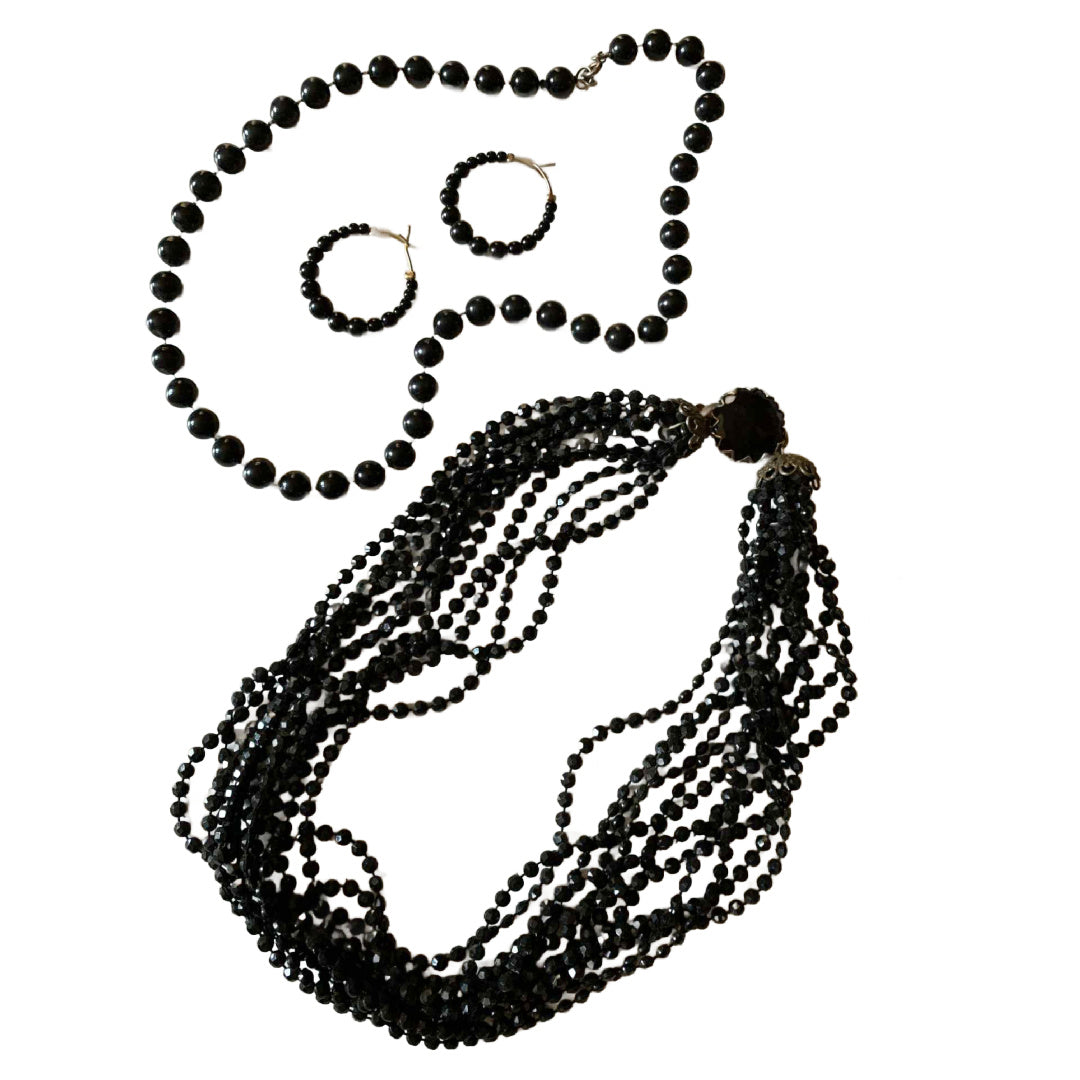 Lot 2 Black Beaded Necklaces and Beaded Hoop Earrings circa 1960s