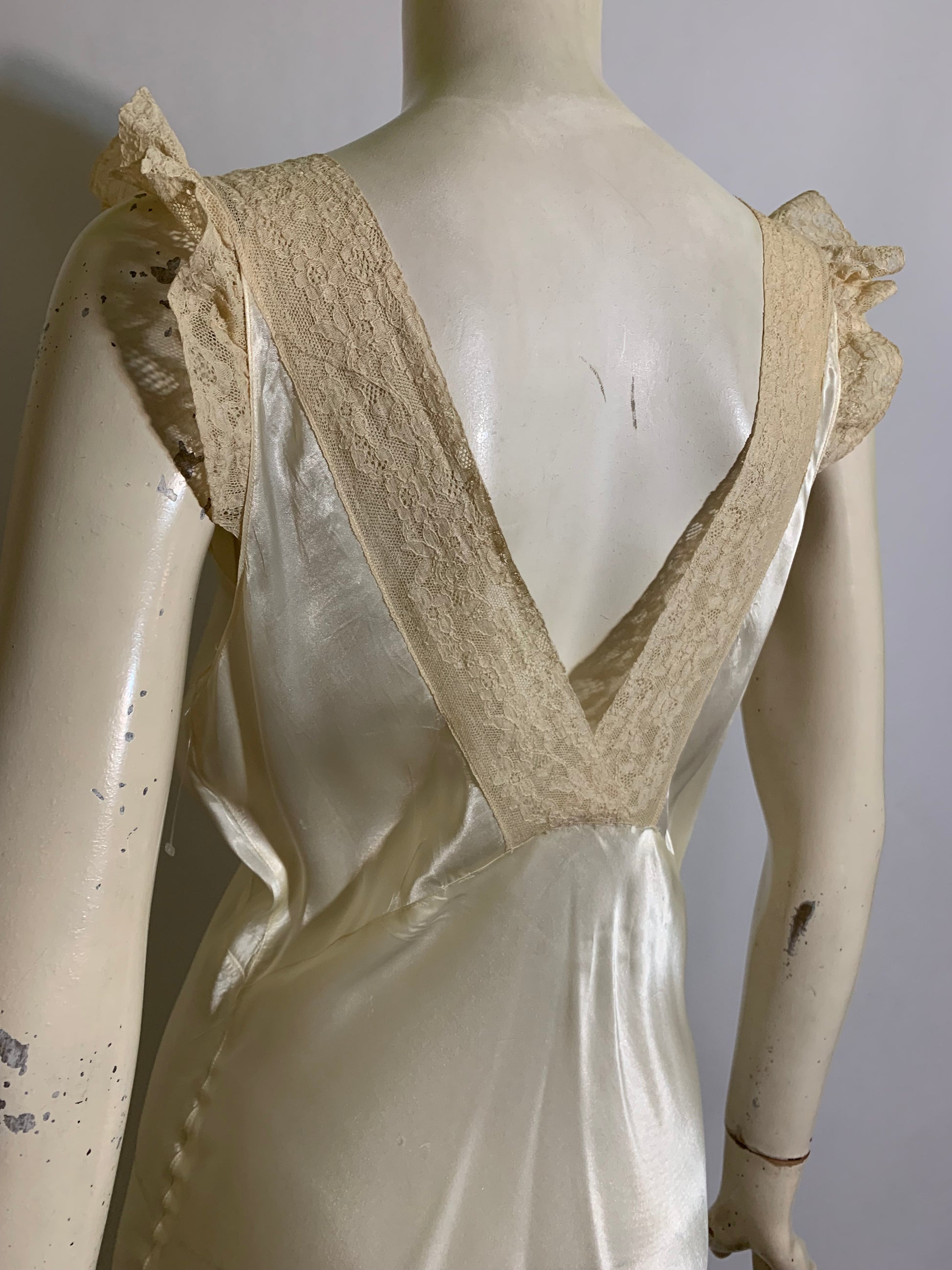 Ivory satin rayon 1940s bias cut nightgown with ruffled lace neckline, low back. No label, no flaws.