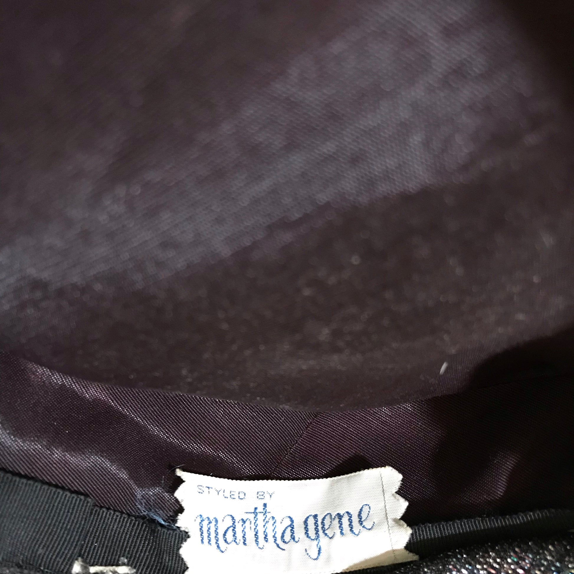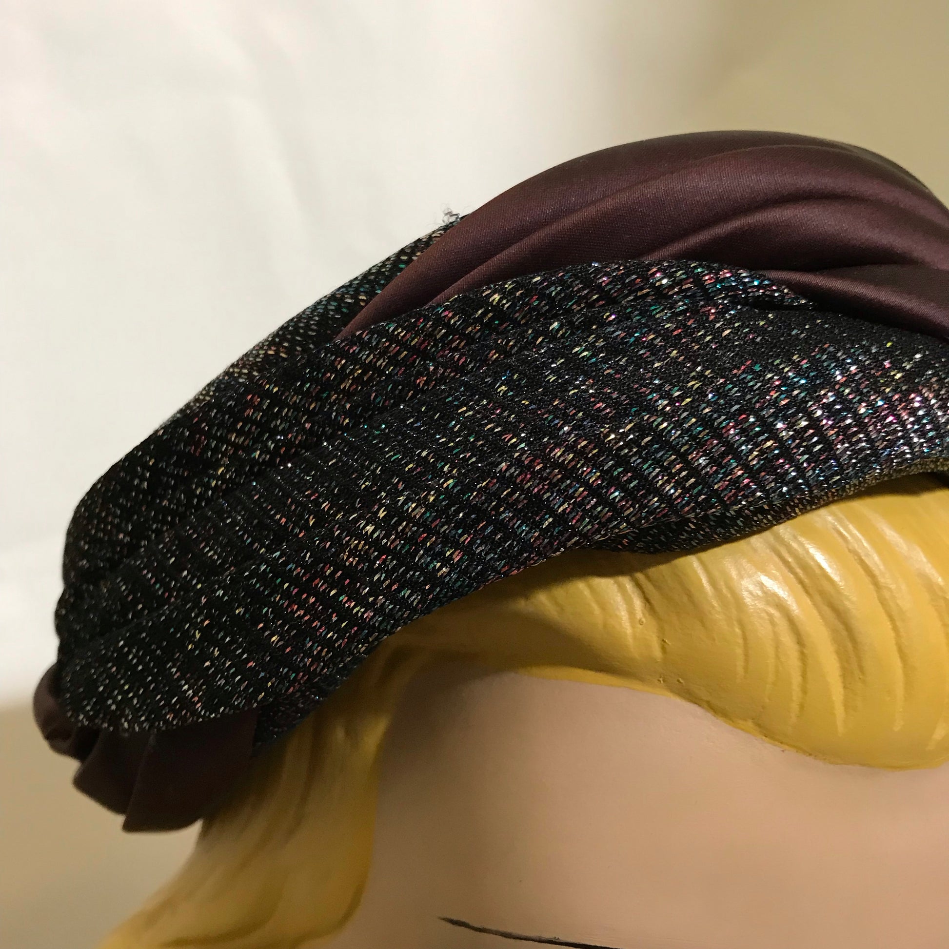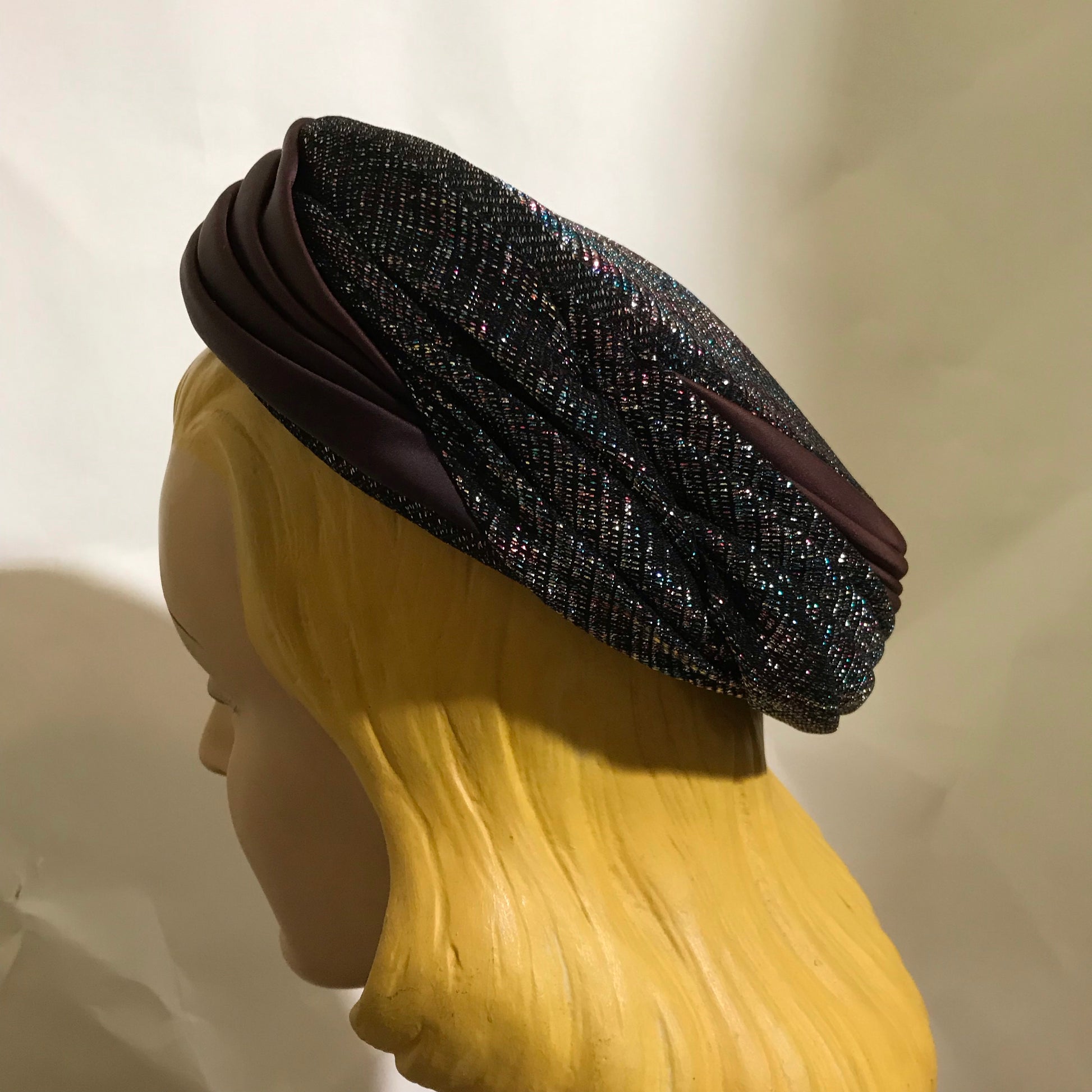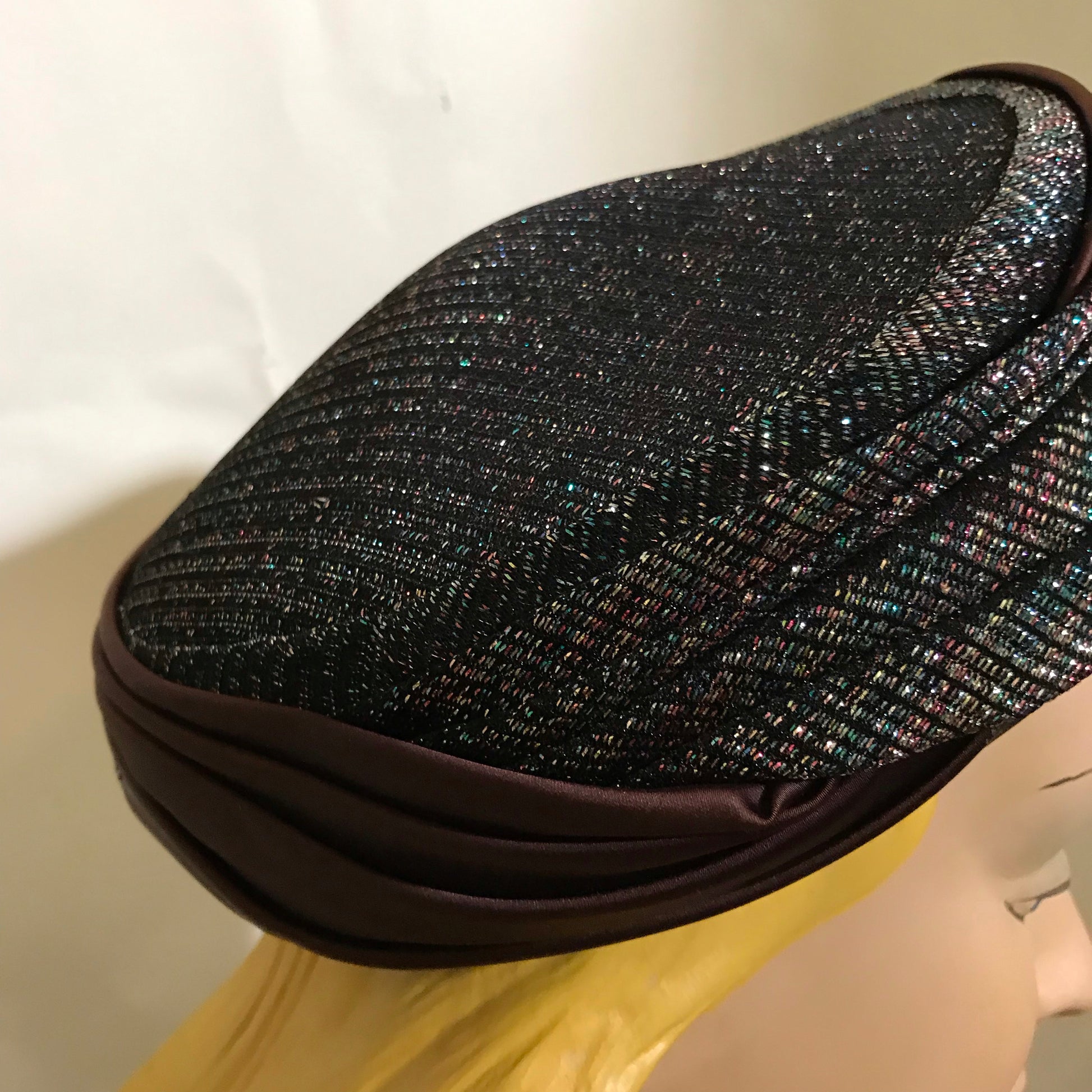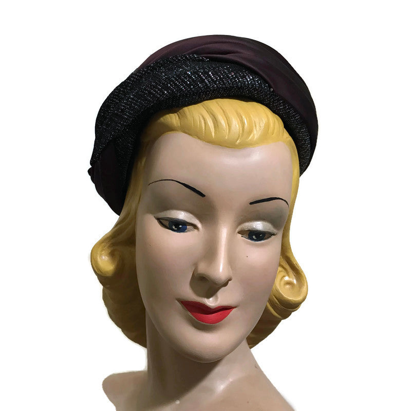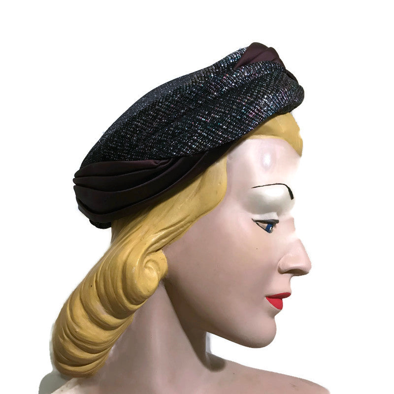 Metallic Bronze, Blue and Black Fabric Wrapped Pill Box Hat circa 1960s
