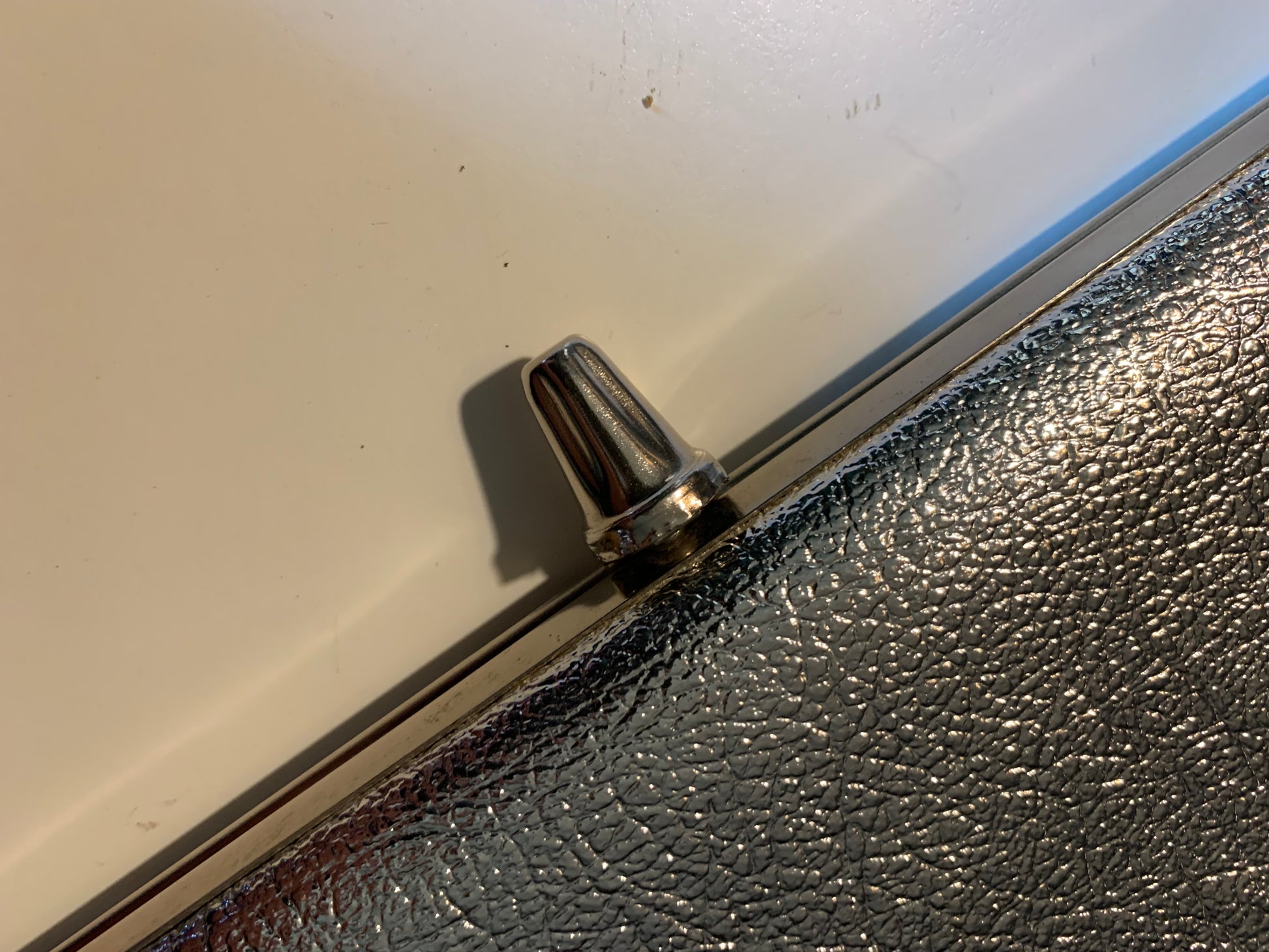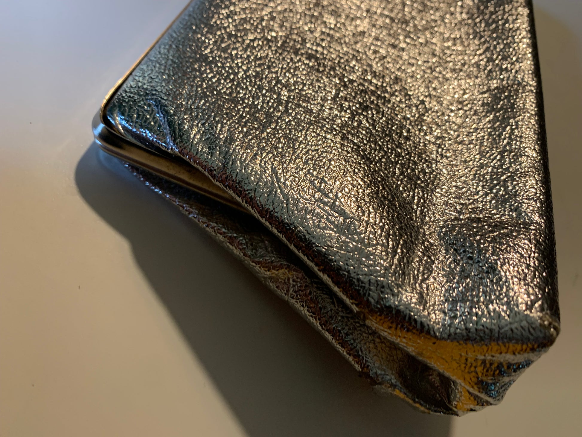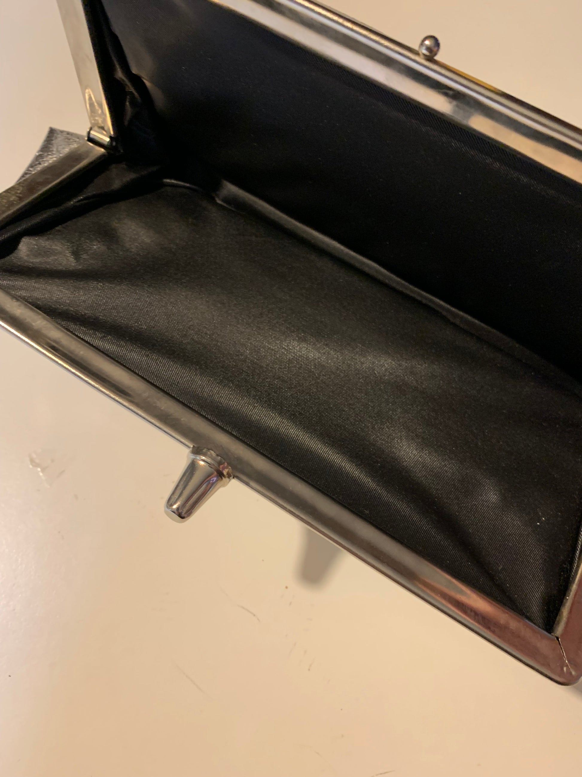 1960s metallic vinyl evening bag with fold clasp, lined in vinyl. No label, no flaws.